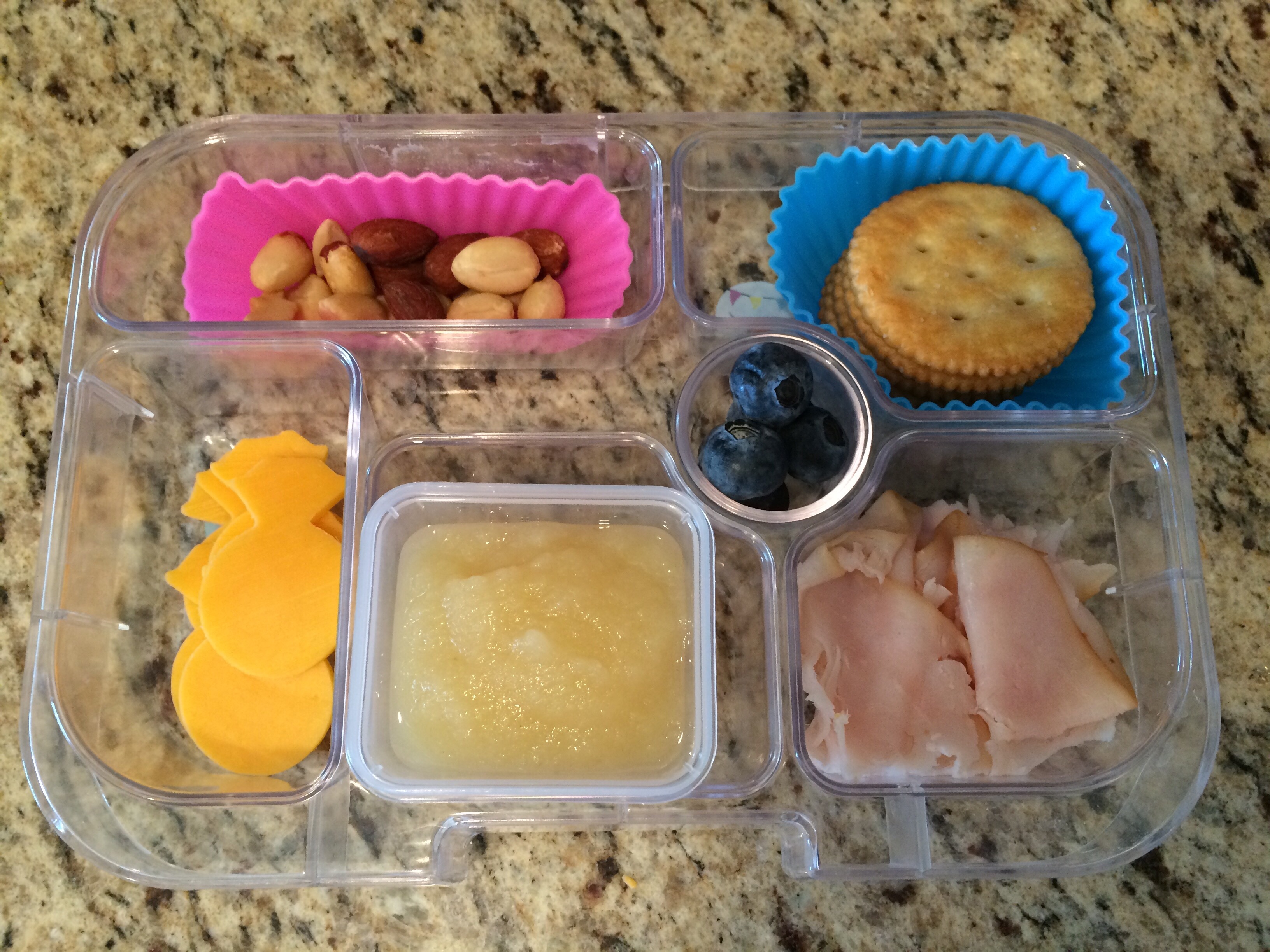 “Lunchables” inspired – crackers, cut up ham, and pineapple shaped cheese slices (my kids love to assemble), some mixed nuts, applesauce, and a few blueberries.