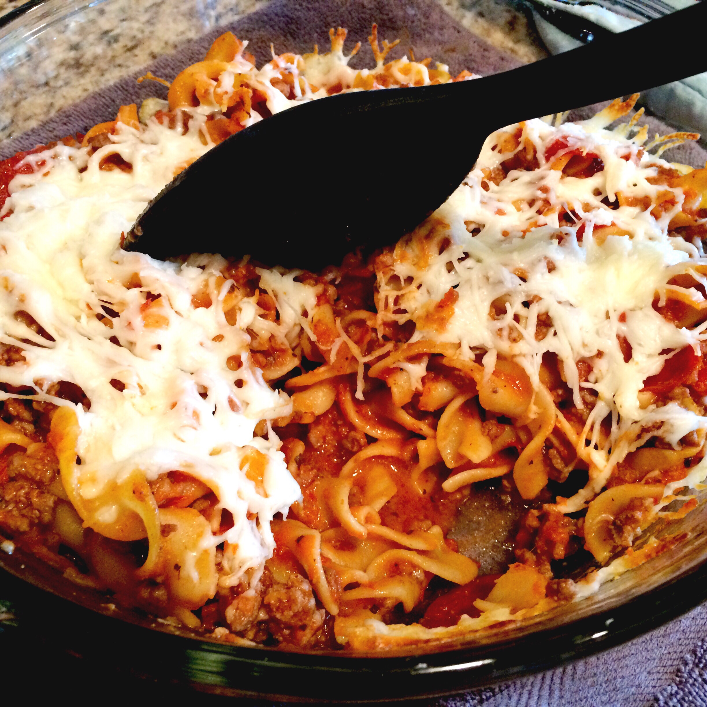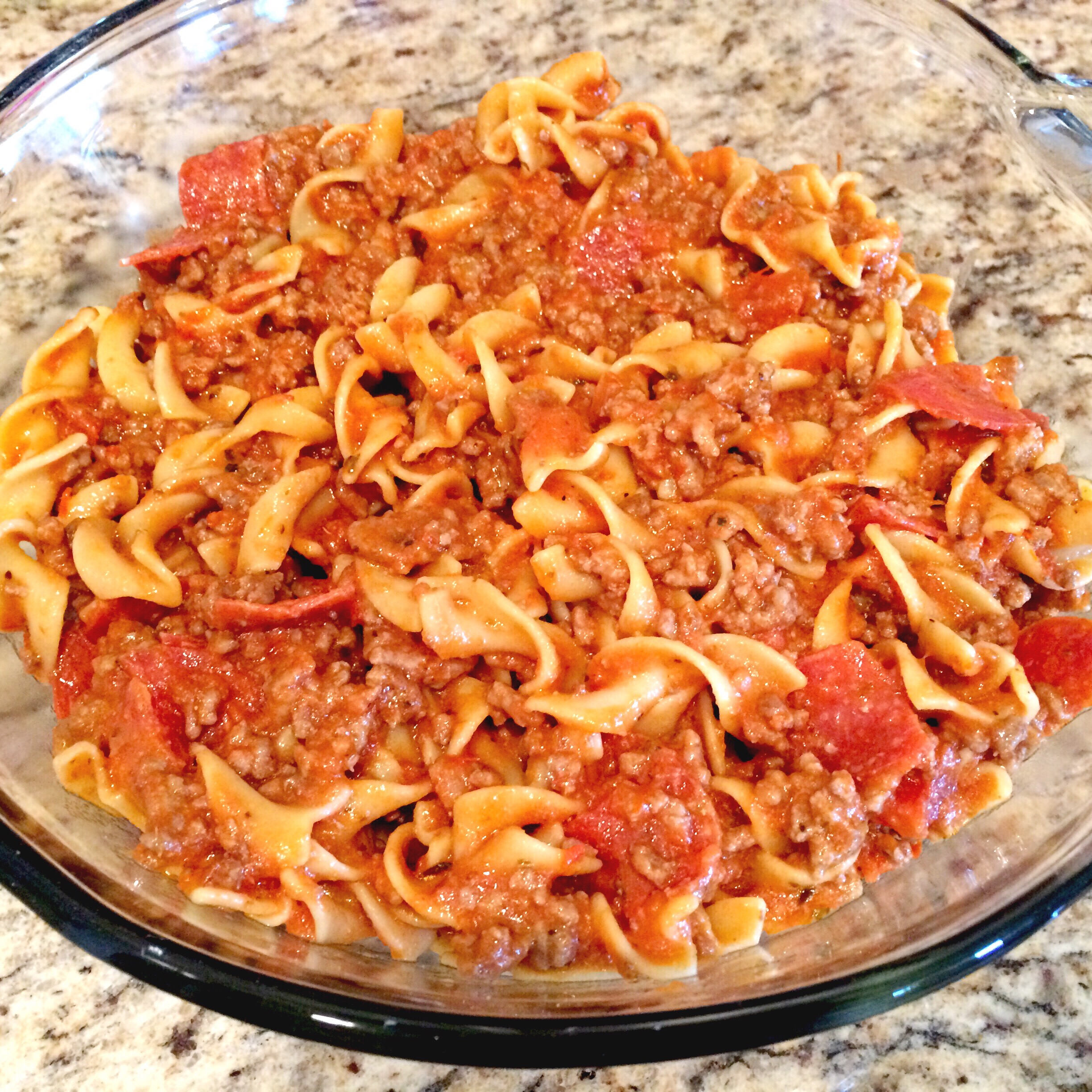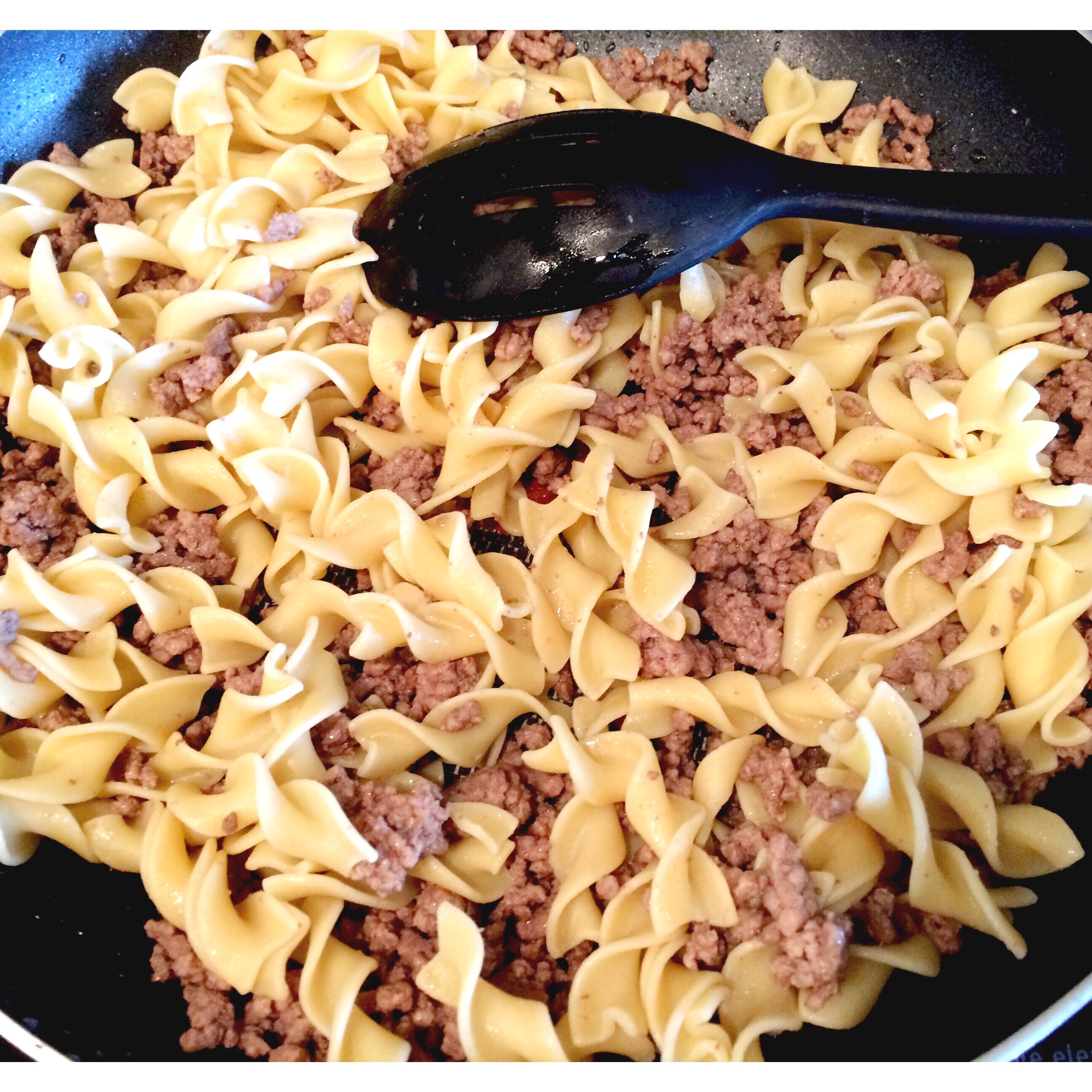First, brown your ground beef, and then drain it. While that is browning up, you can boil your noodles in another pan. After that is done, just mix them together.