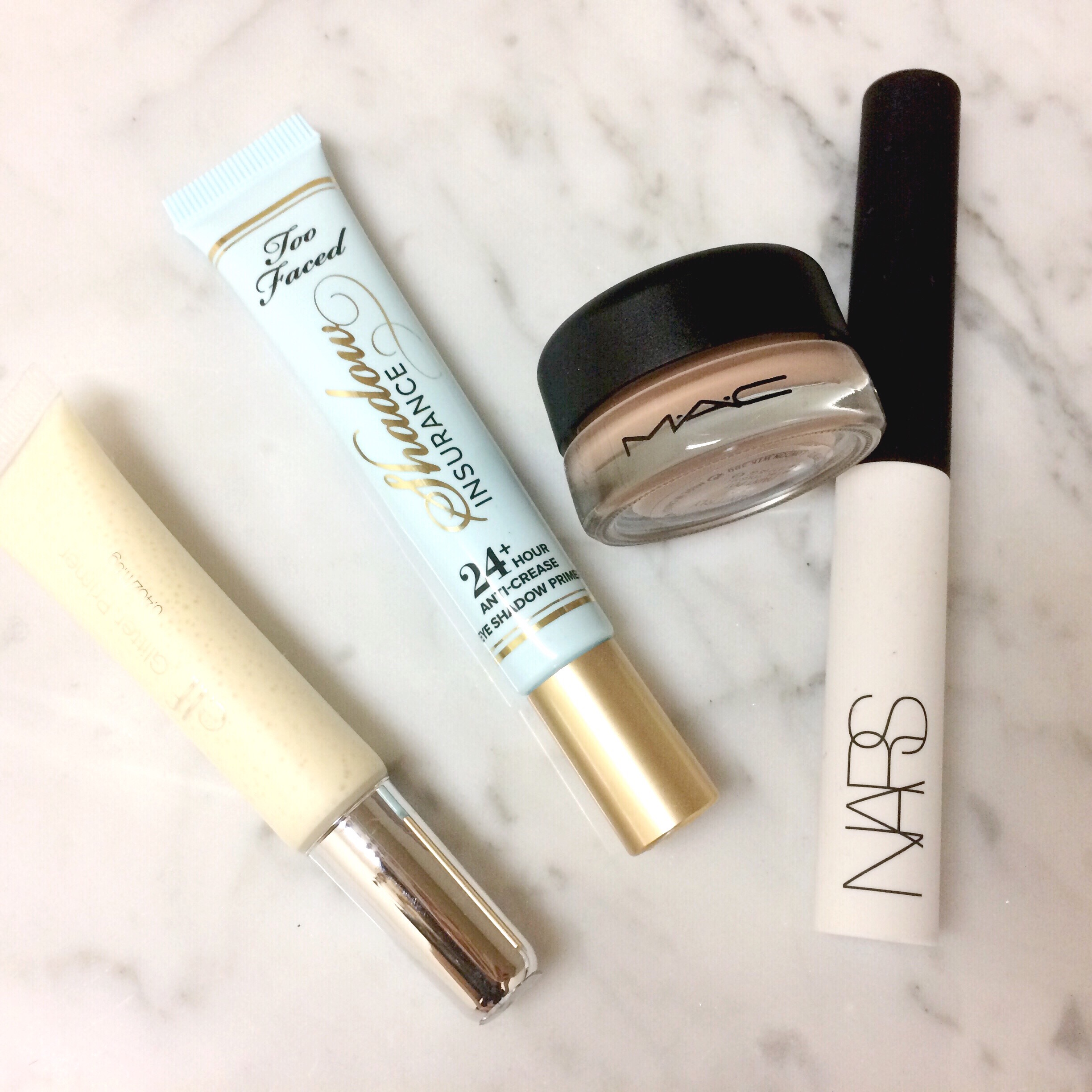 First off, I start with an eyeshadow primer. You can use any primer you like; even concealer works. My favorites are the NARS Eyeshadow Base, Too Faced Shadow Insurance, ELF Glitter Primer and MAC’s Painterly Paint Pot. You just want a nice even base on your lids to help the shadows blend out evenly, and also help them to last.