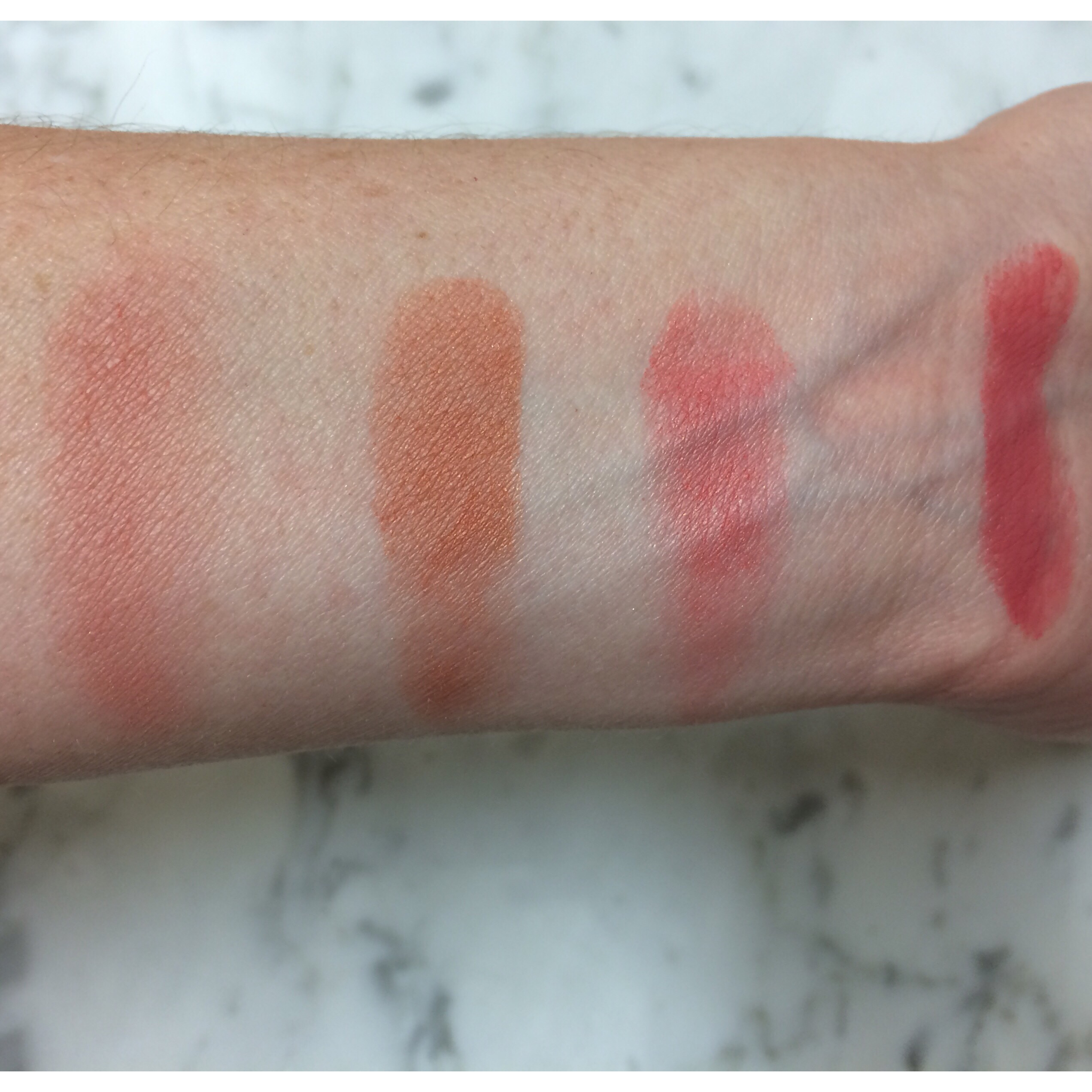 Here are some swatches of the blush palette and the lipstick: