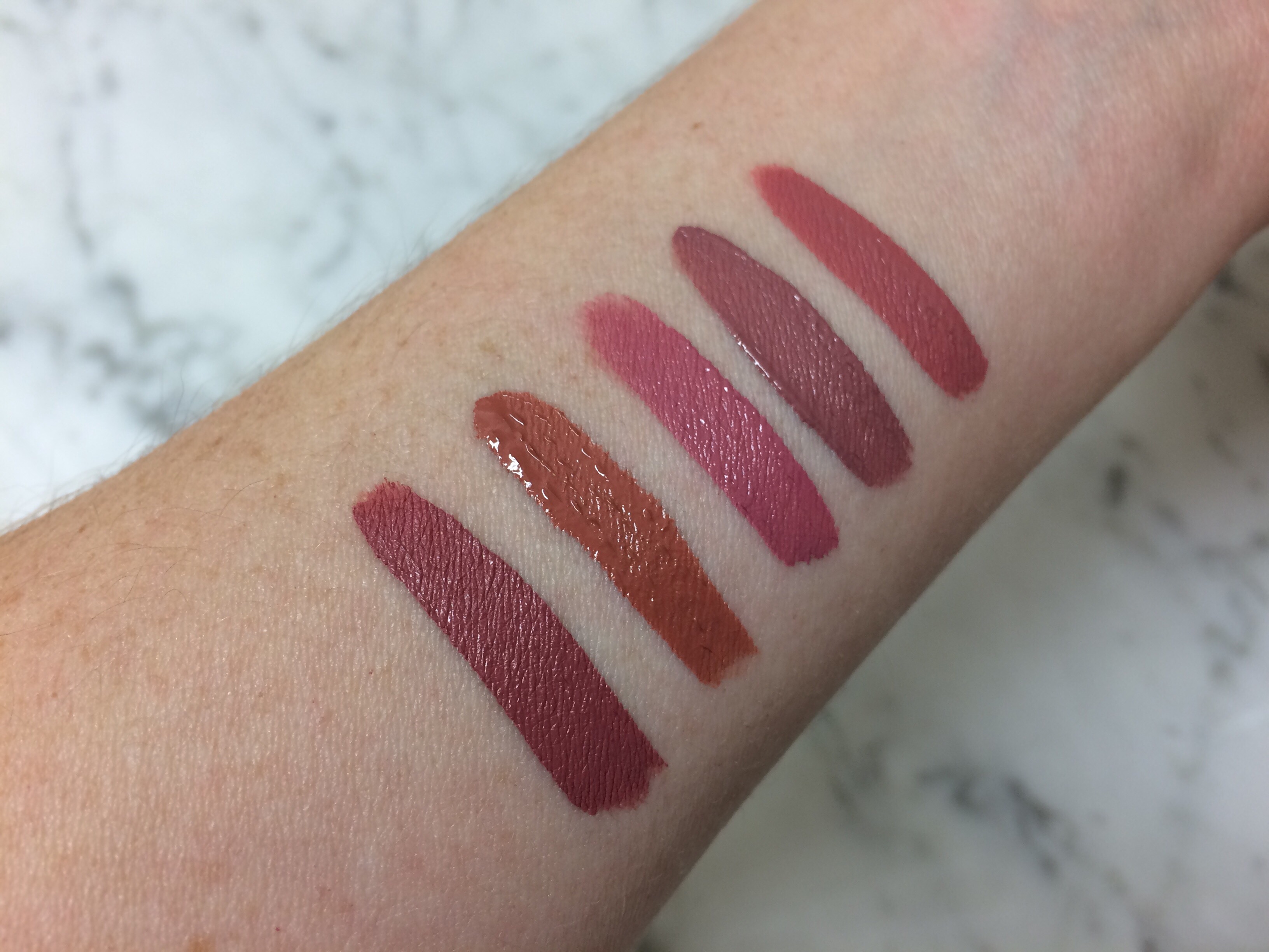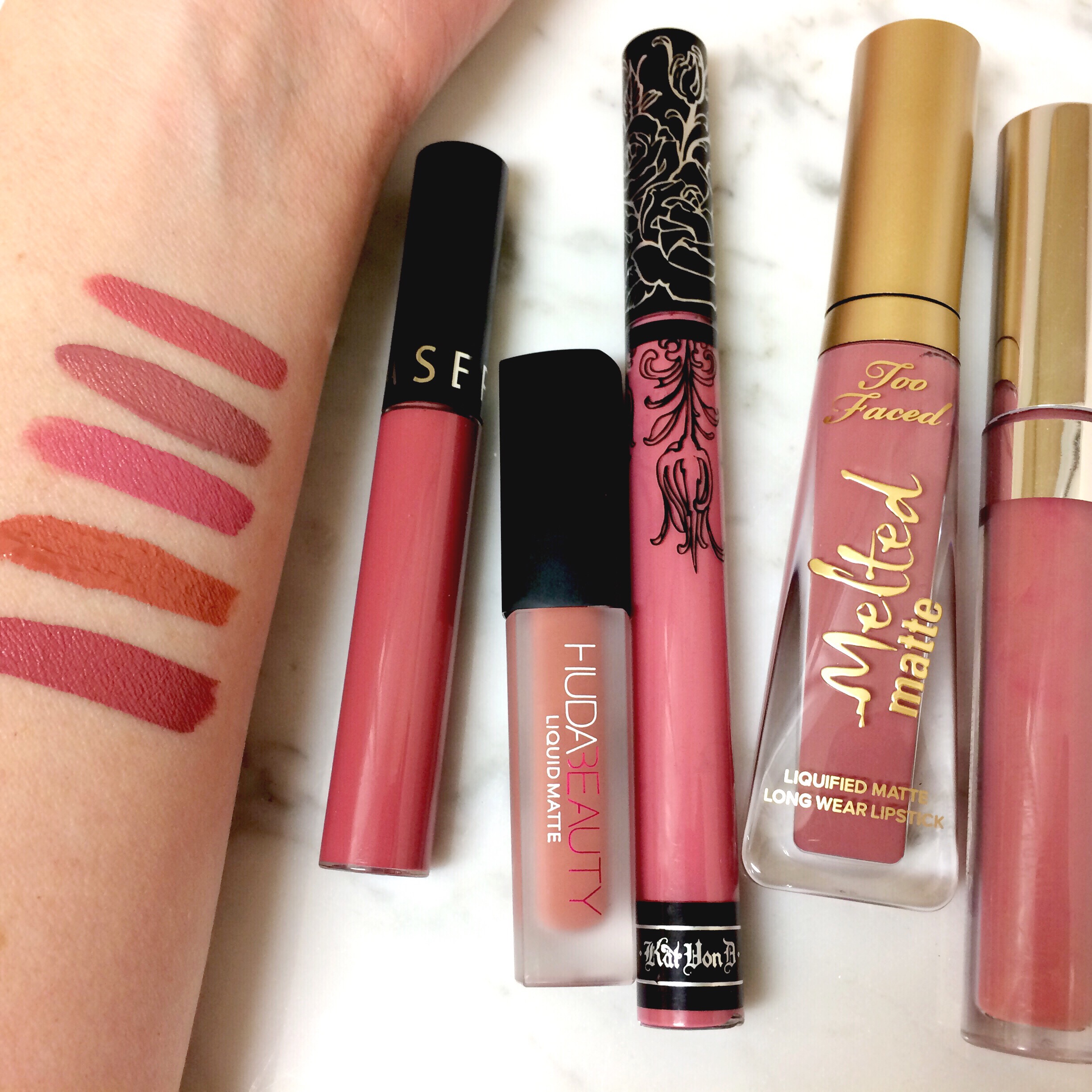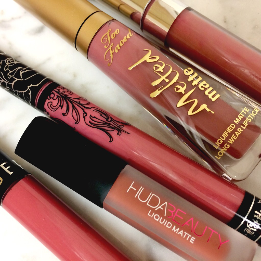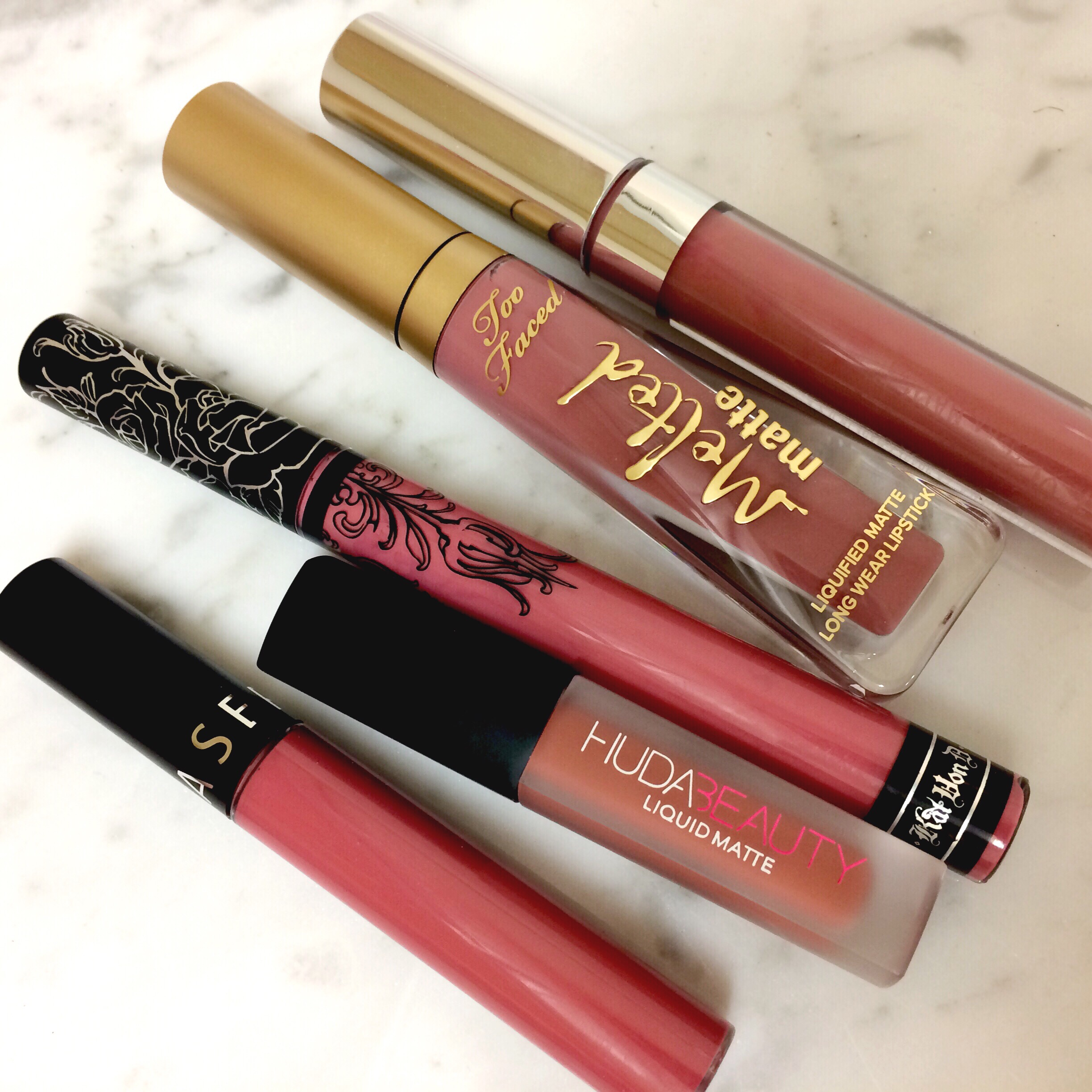 The Huda Beauty Liquid Matte in Bombshell is a more warmer, brown-y toned color, and more liquid in consistency than the others. I also love the smell of these! If you are looking for a true mauve with some grayish purple to it, Too Faced Queen B is so so so pretty.