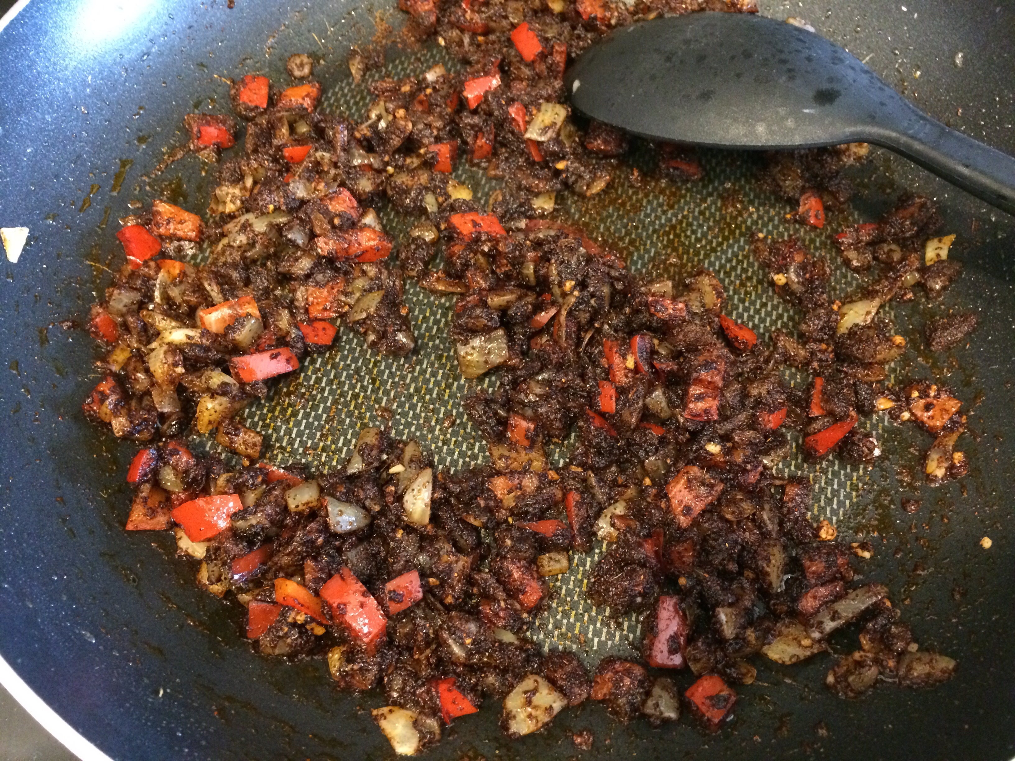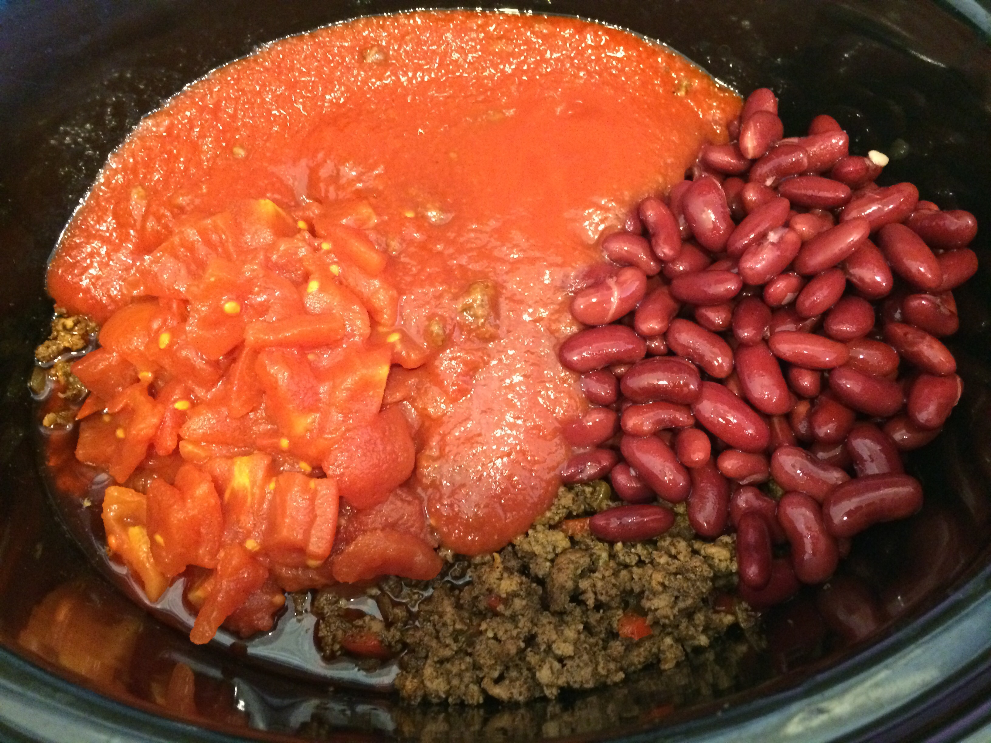 Pour mixture into the crockpot, add tomato sauce, diced tomatoes (with juice) and beans (optional).