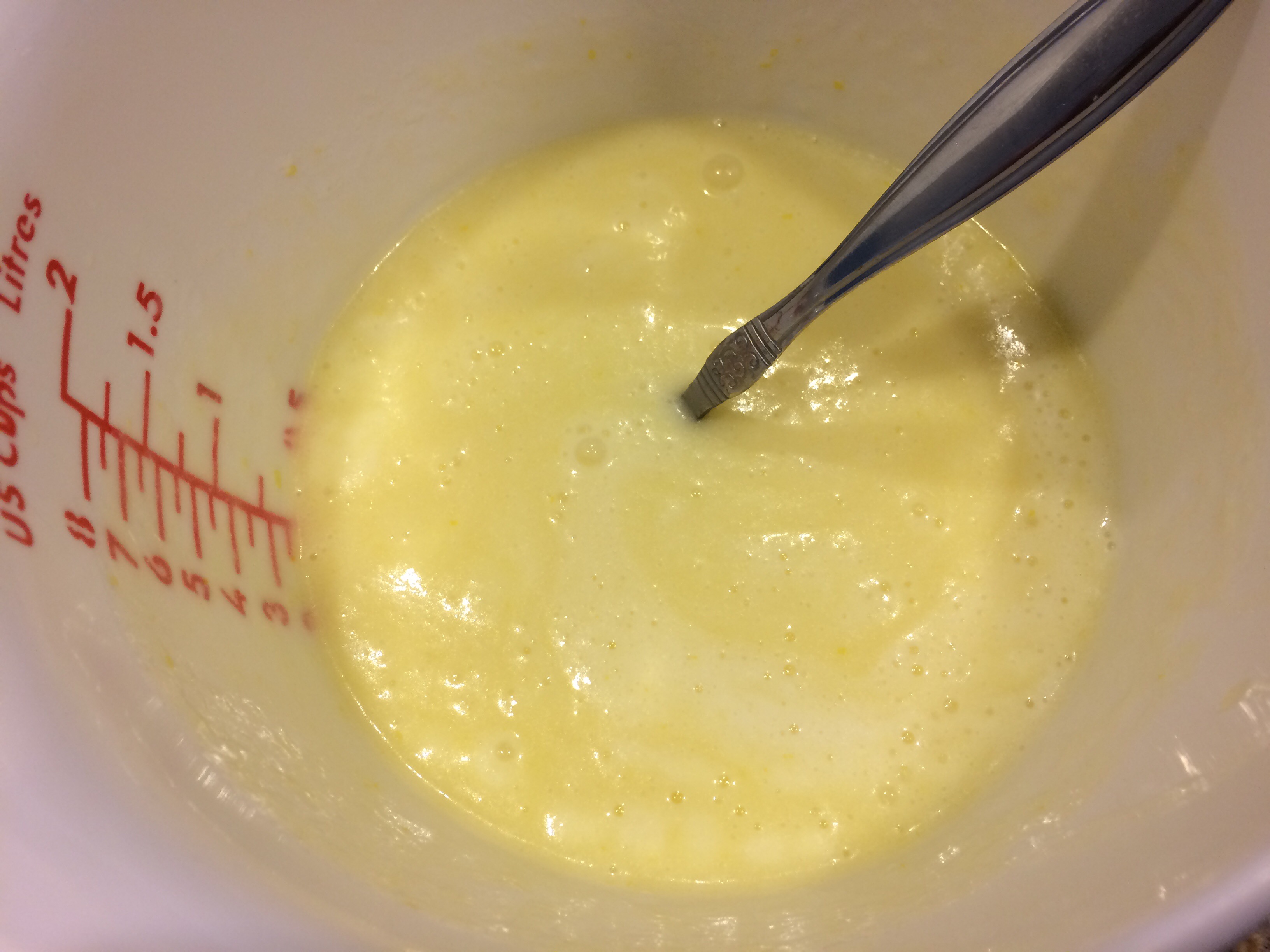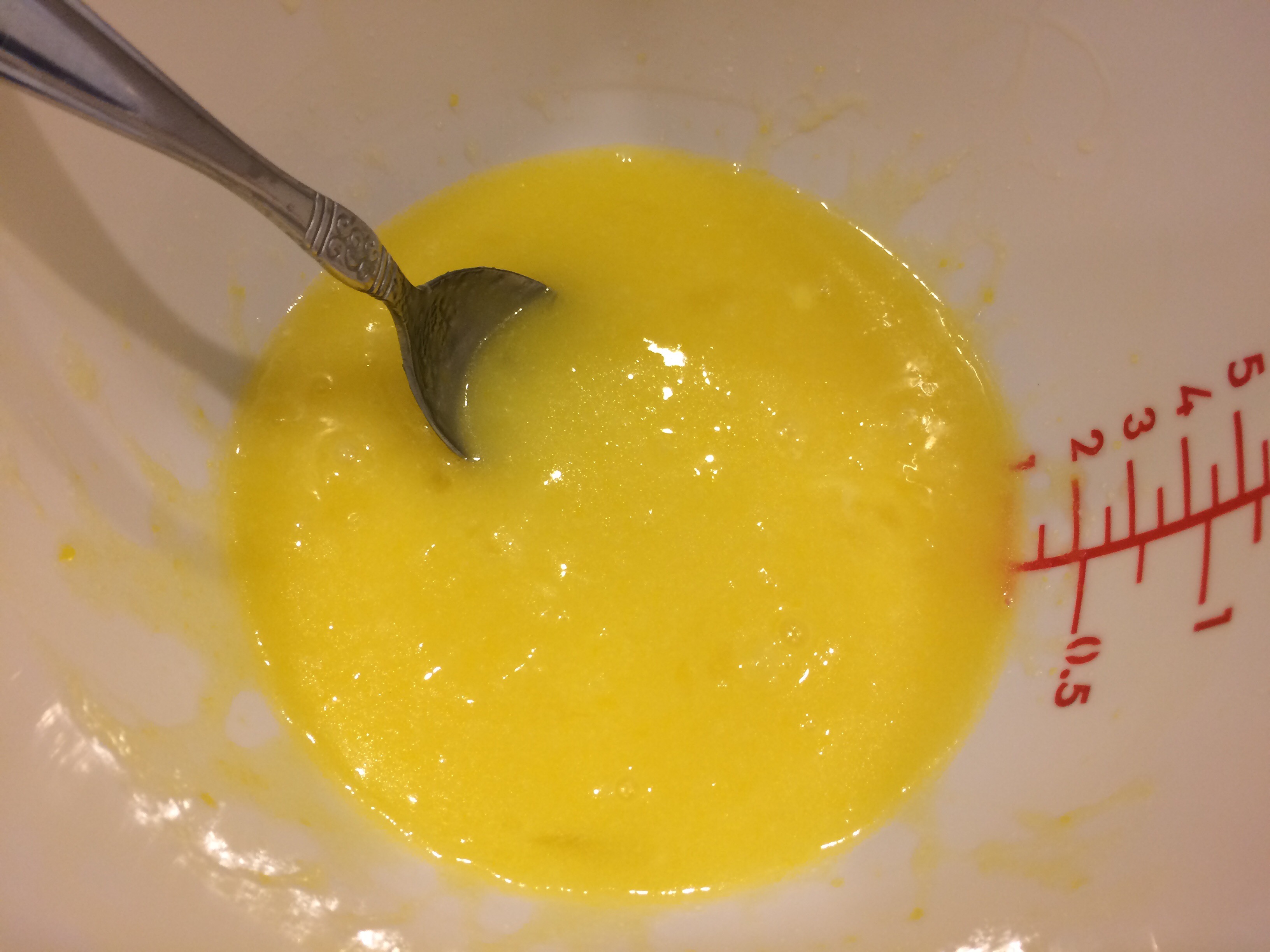 Preheat your oven to 350 degrees. Melt butter, add sugar, eggs, and stir.