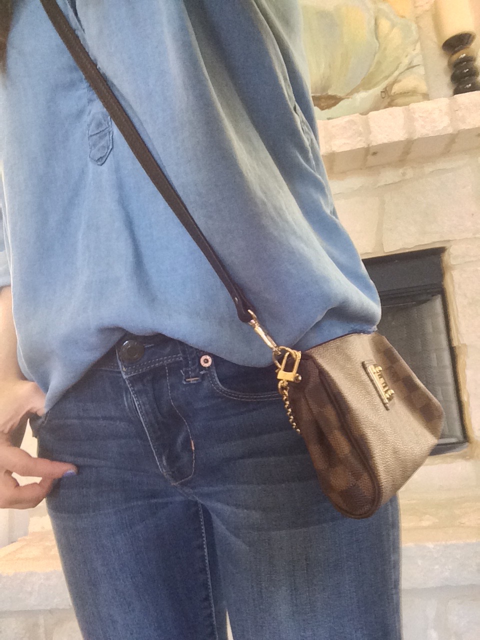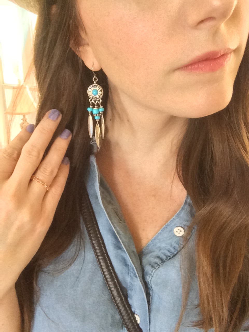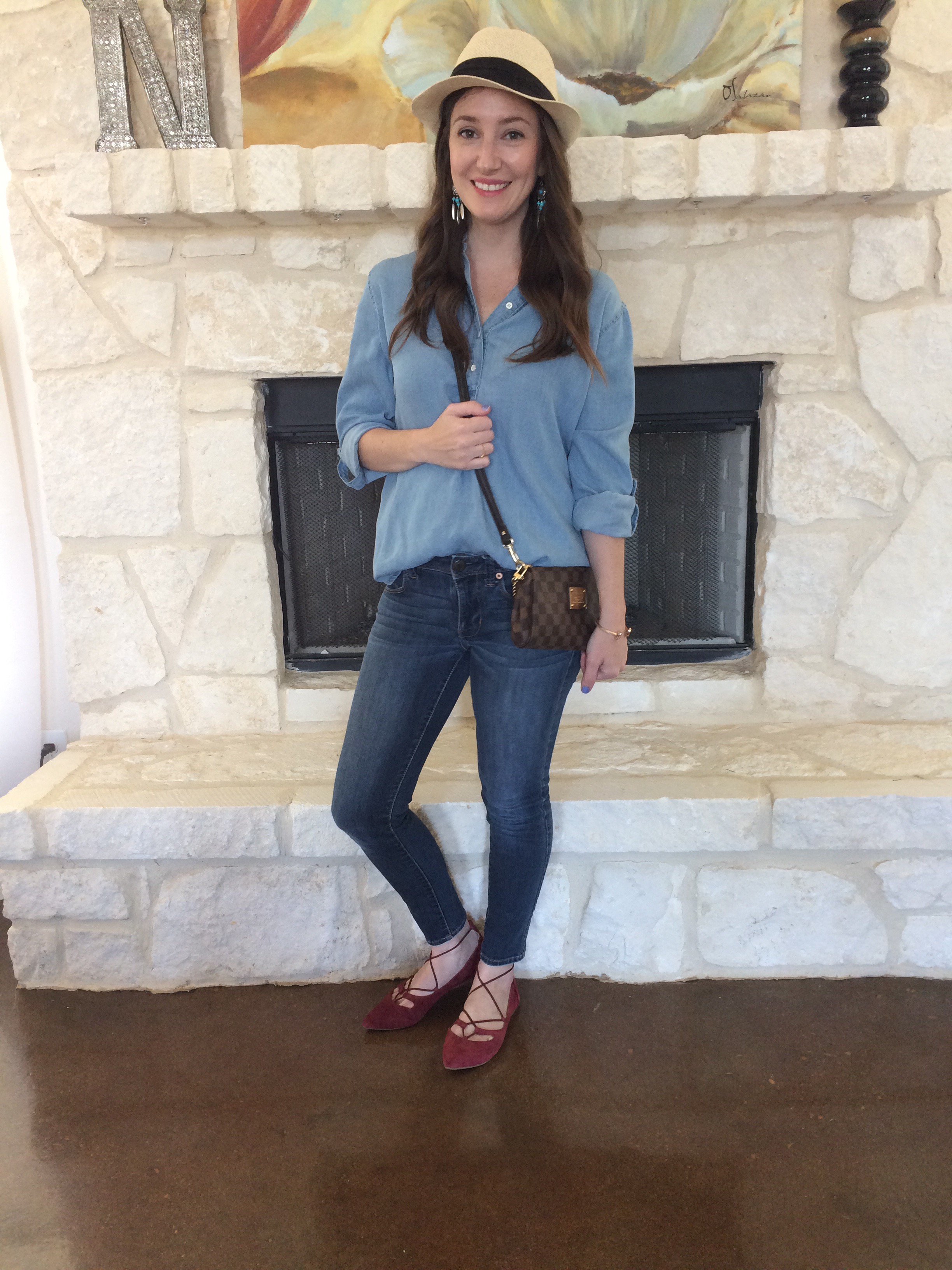 I paired the top with some darker wash skinny jeans and some comfy flats for this day to day outfit. The jeans aren’t the same color as the top, but I still love the monochromatic denim look to it. The flats are super cute and give the outfit a nice pop of color. I finished the look with a crossbody bag, dream catcher earrings, and favorite hat.