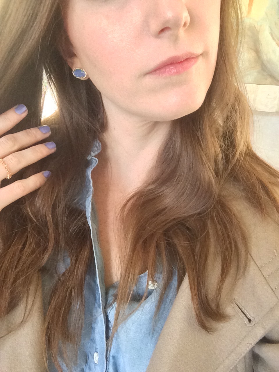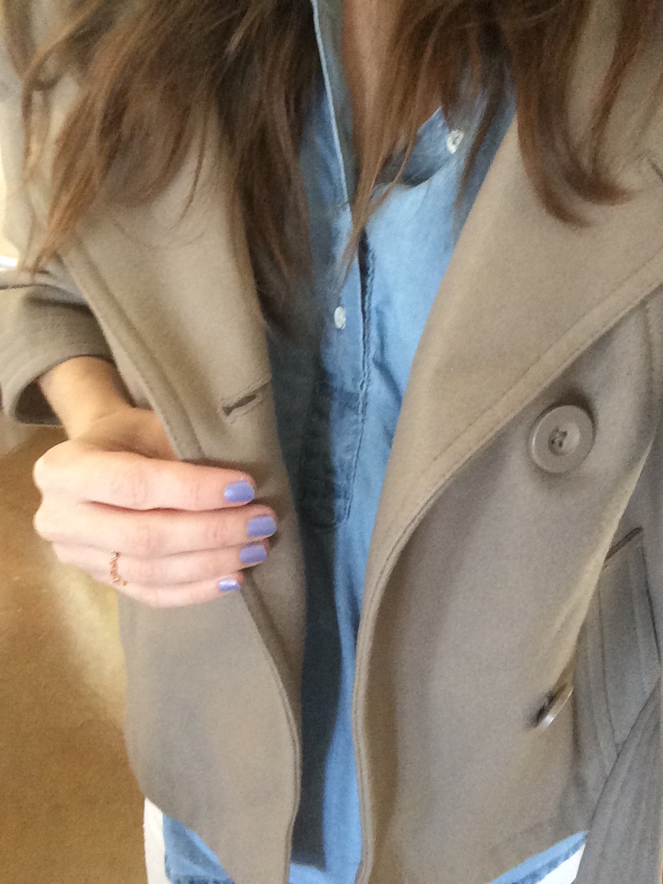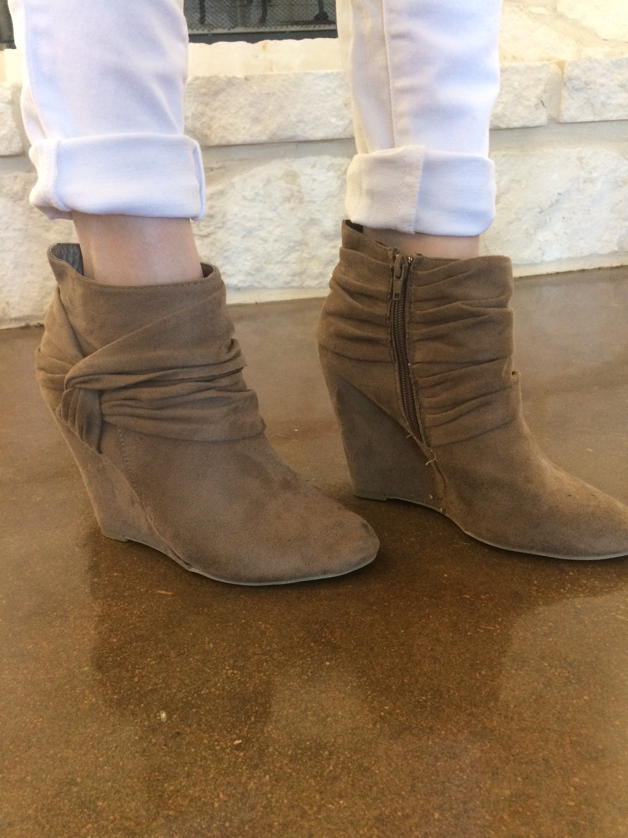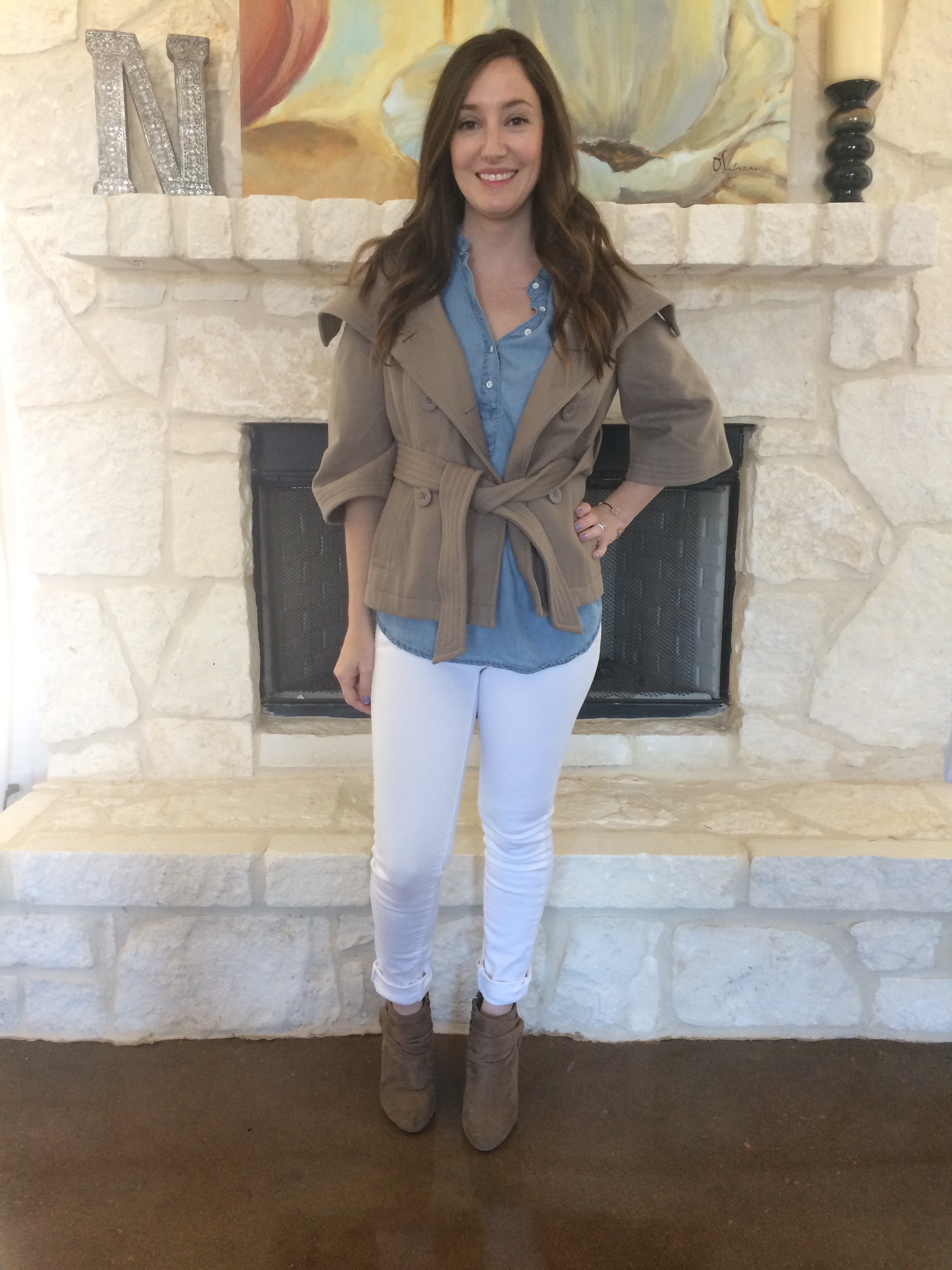 For the last outfit, I chose white skinny jeans because I love wearing them, and they go with everything! I threw on this little tan cropped trench over it and put on some tan colored wedge booties to match. I like to roll my pants because I like a little bit of skin to show between the boots and pants. I finished it off with some blue stone stud earrings.