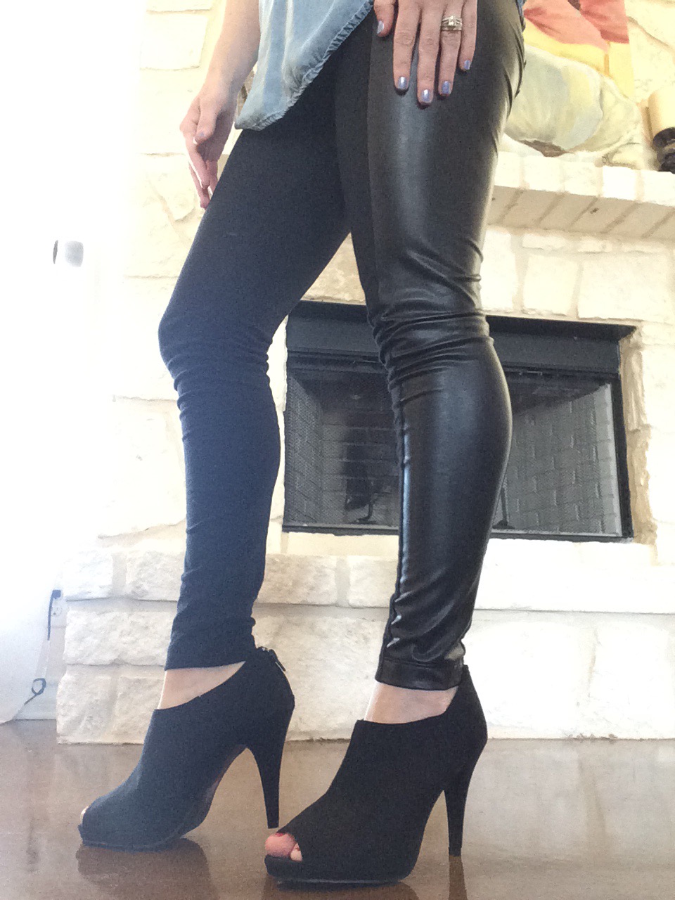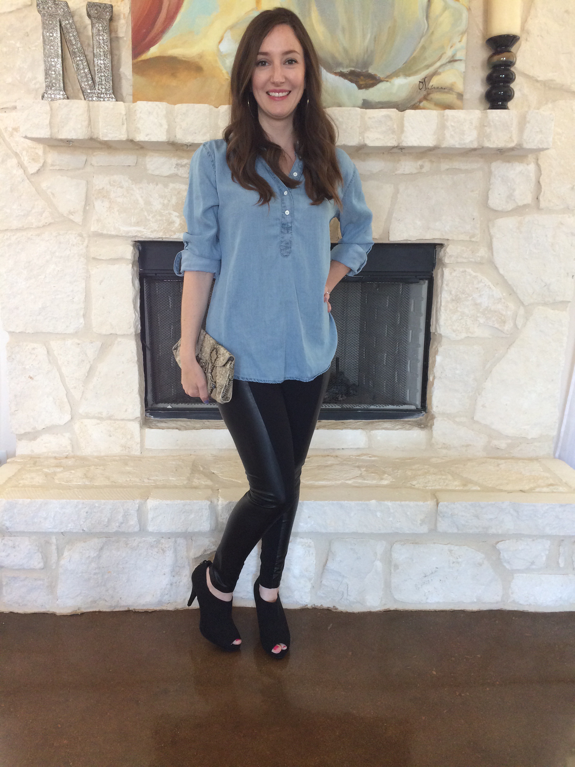 I paired this top with some leggings with a faux leather panel on the side. I think the casual vibe of the shirt goes well with these pants that have a little bit of an edge to them. I also chose these heeled booties with a tiny bit of a peep toe, and finished it off with some gold hoops and a faux snakeskin clutch. I think this is super cute for a casual date night.