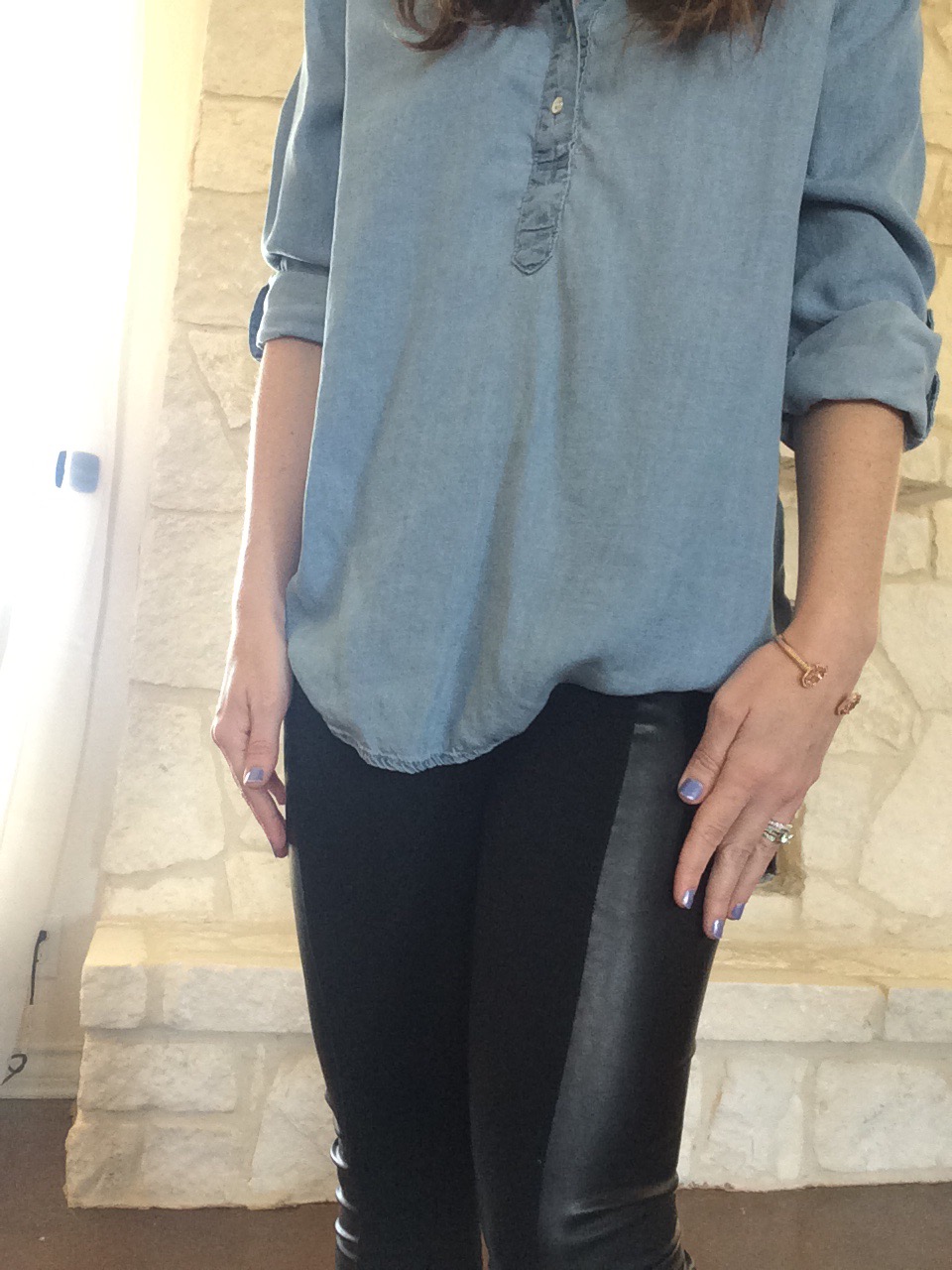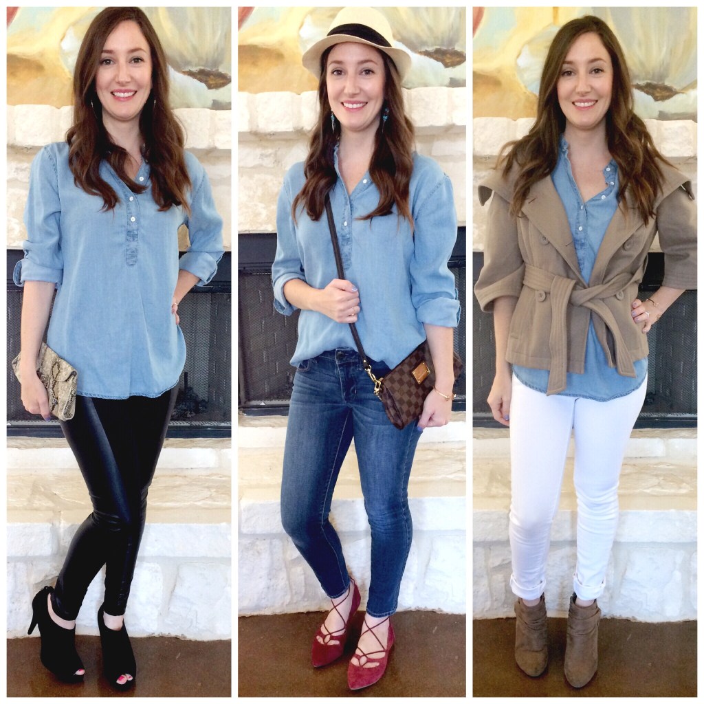 I thought I’d start off with chambray, which is one of my favorite fabrics to wear. It’s loose, super light, comfy, and casual. I like my sleeves rolled up, and I like how this shirt in particular doesn’t have a fold down collar. I think a nice chambray top can go with ANYTHING, but here are my favorite ways to wear it. ENJOY!