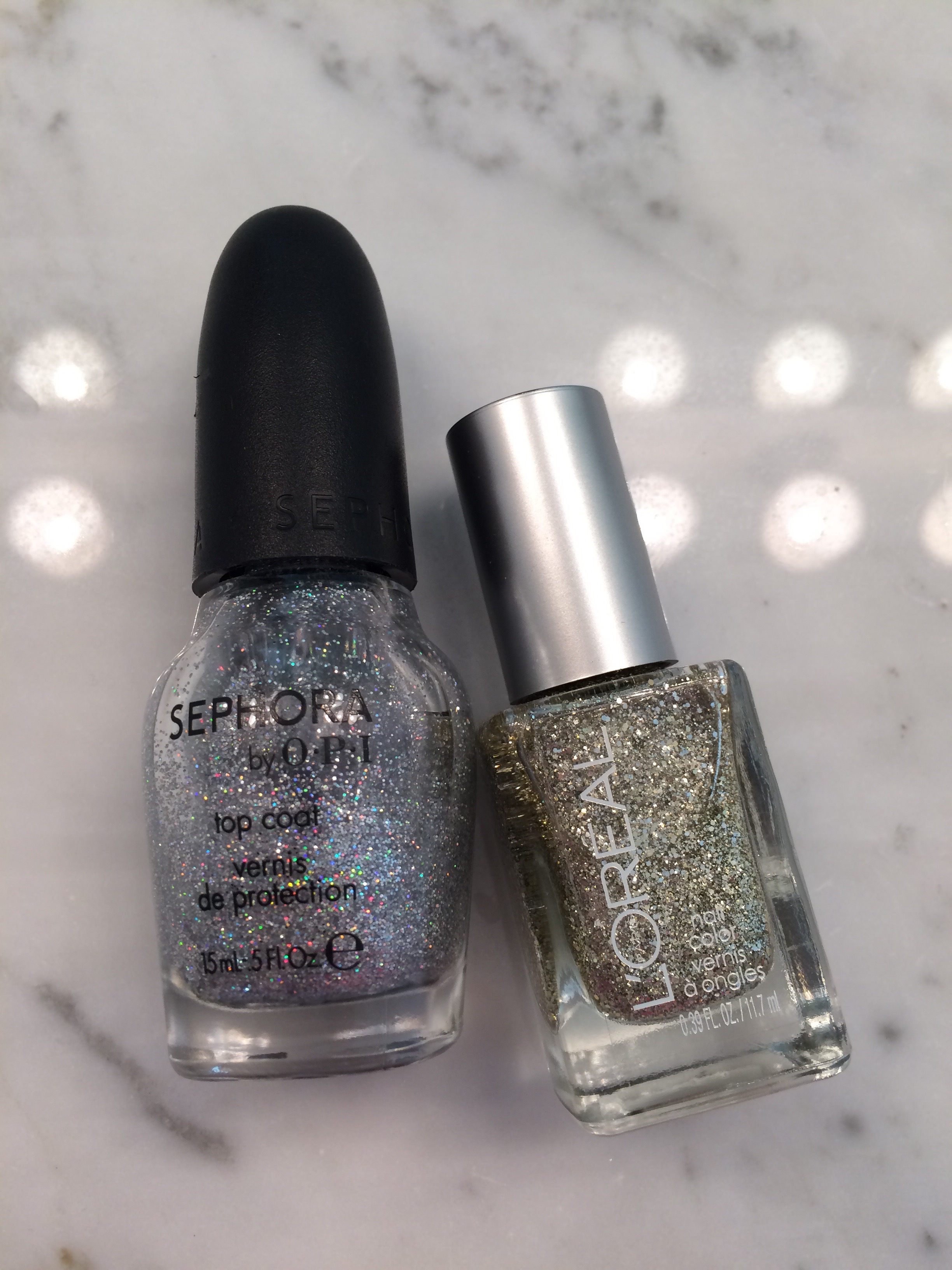 For the topcoat here, I have a fine holographic glitter- a VERRRY old one from Sephora By OPI (they don’t make this brand anymore). I know it’s old, but I just love it!