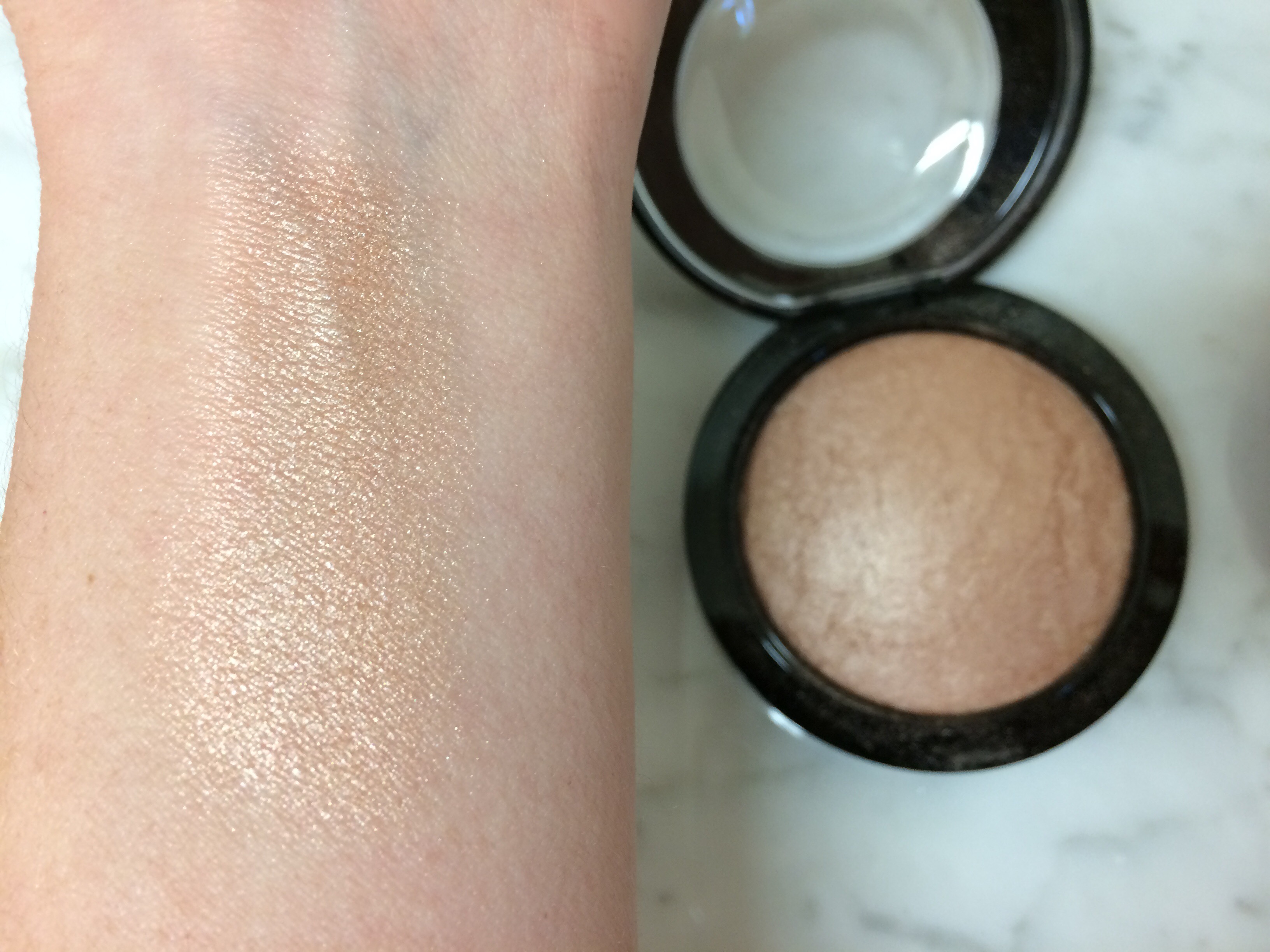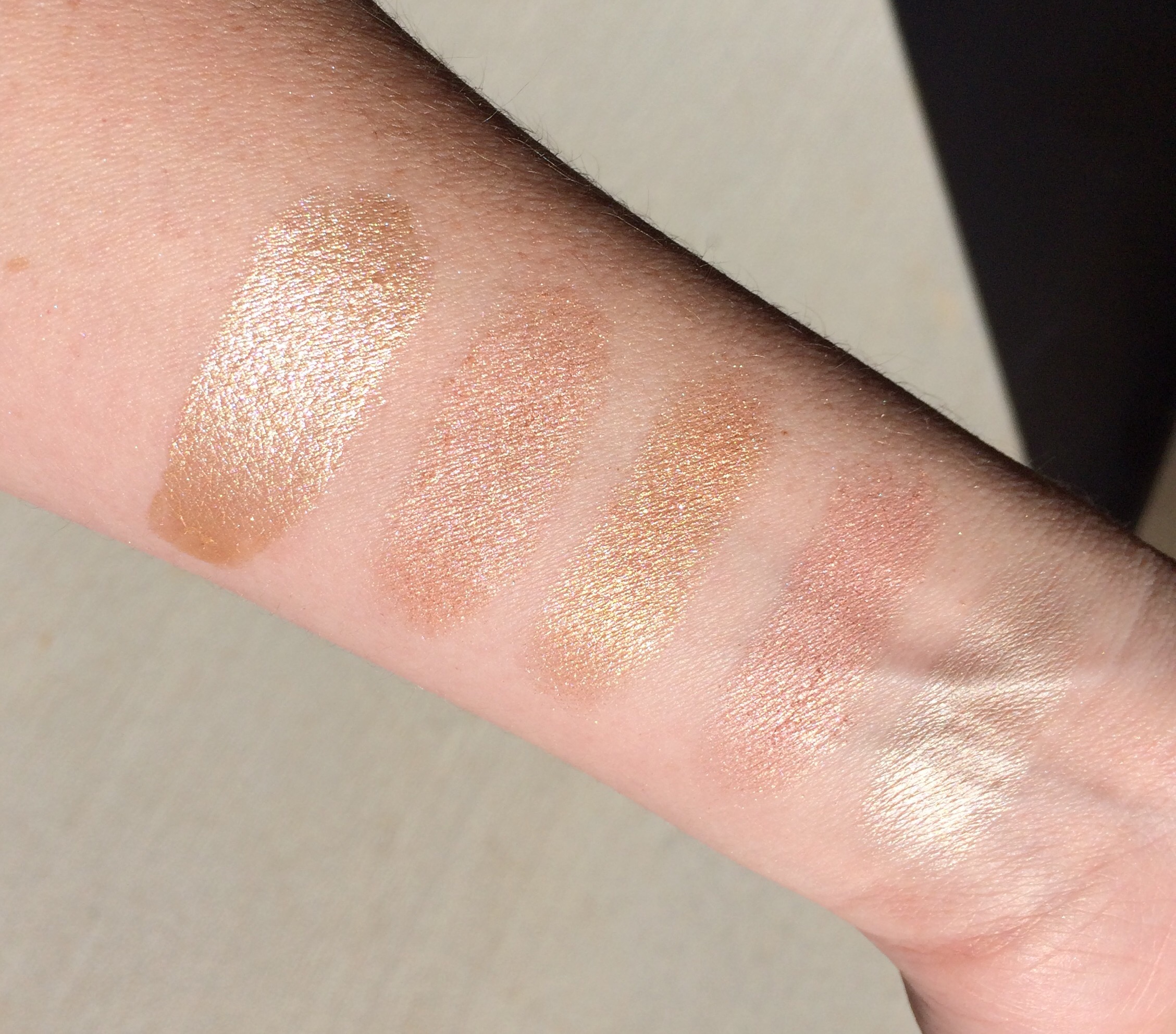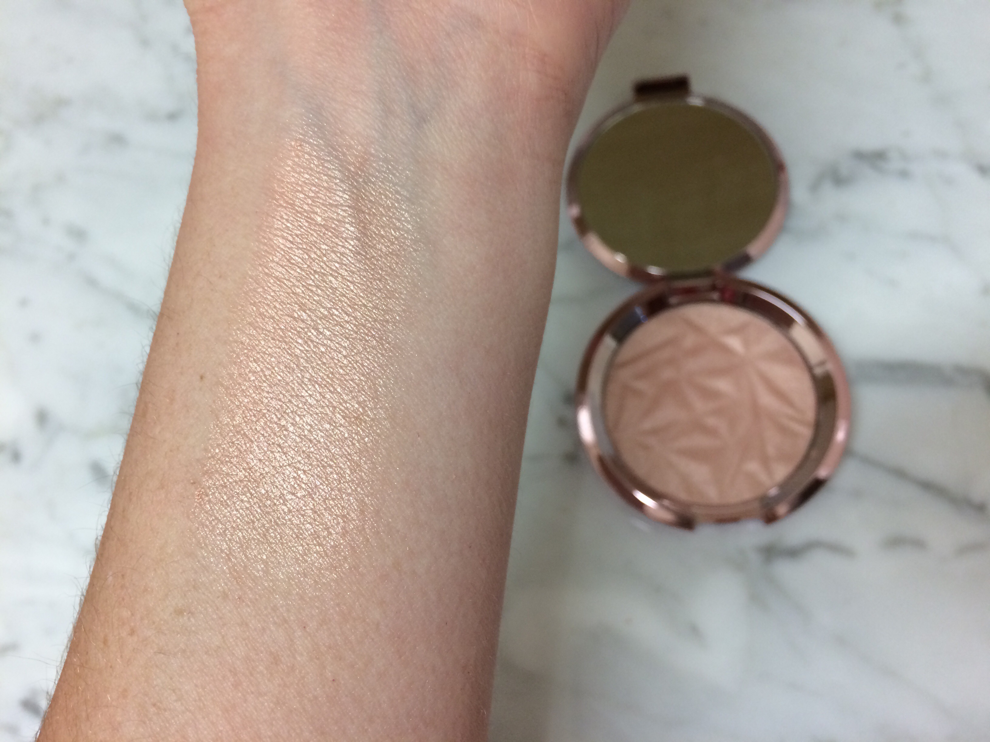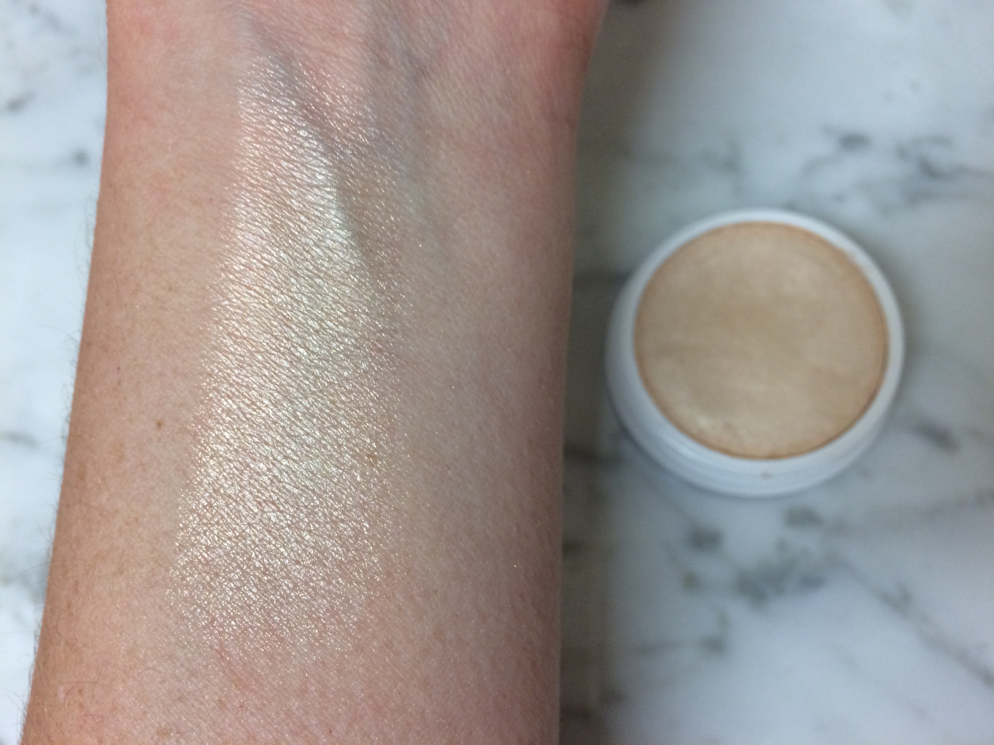 This is a soft cream highlight that dries down to a powder finish quickly. The color is a very pale light gold, but with tons of shimmer and adds such a pretty sheen to the skin. I like to just use my fingers to apply this one.