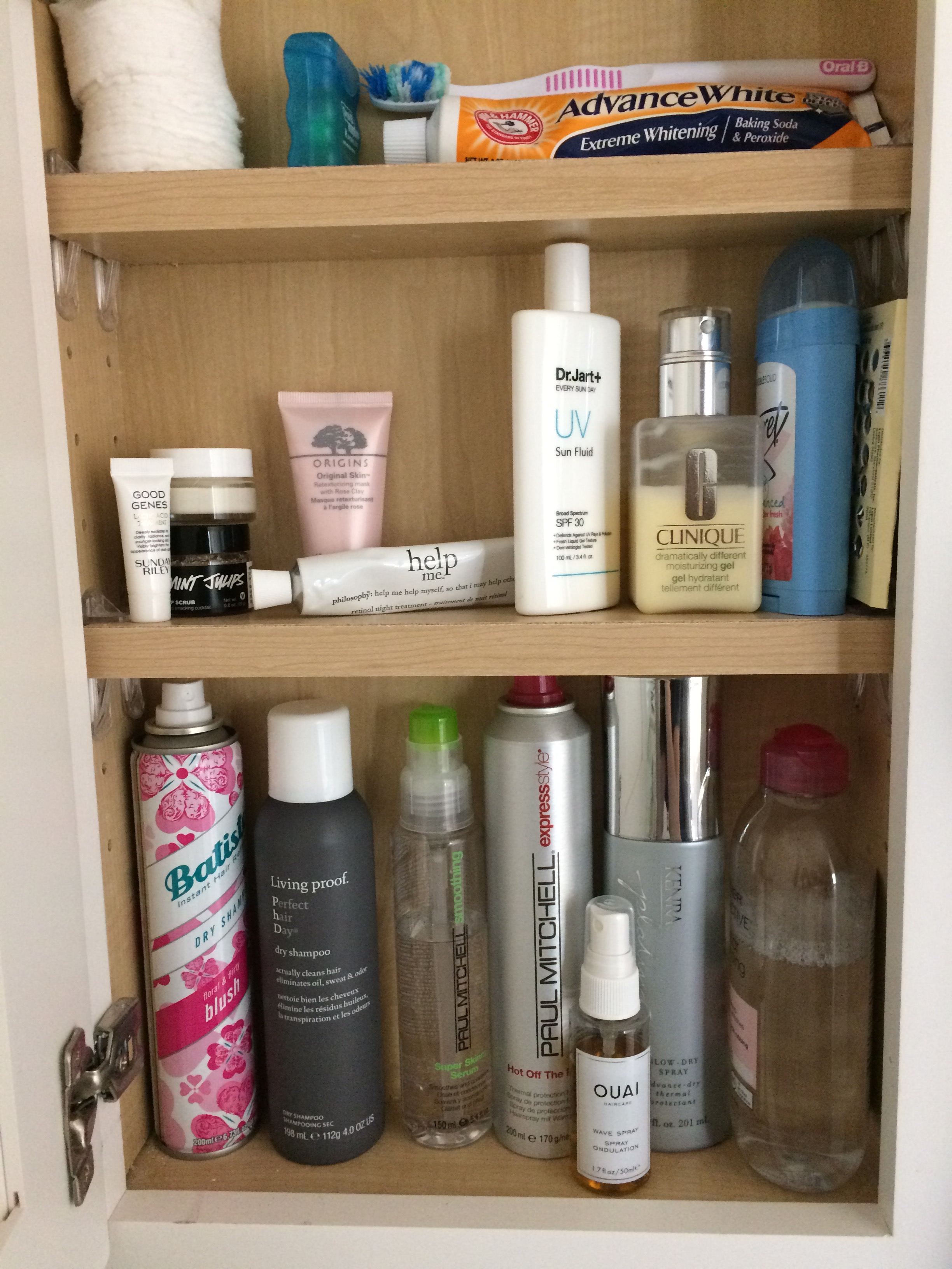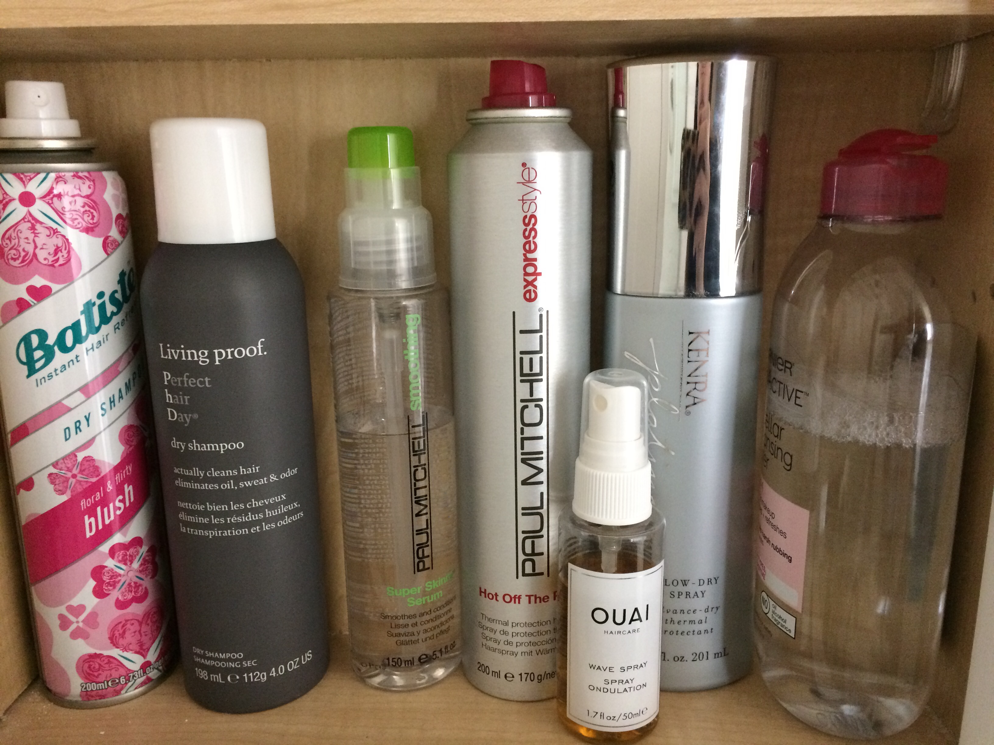On the bottom shelf I keep mostly hair products. This shelf is the tallest, so I can fit larger items here. I have a couple of my favorite dry shampoos, a hair serum to apply to my hair if I’m wearing it straight and want a sleek look, a hairspray, a blow dry/heat protectant spray, a wave/texturizing spray, and lastly (not a hair product) but my makeup removing water.