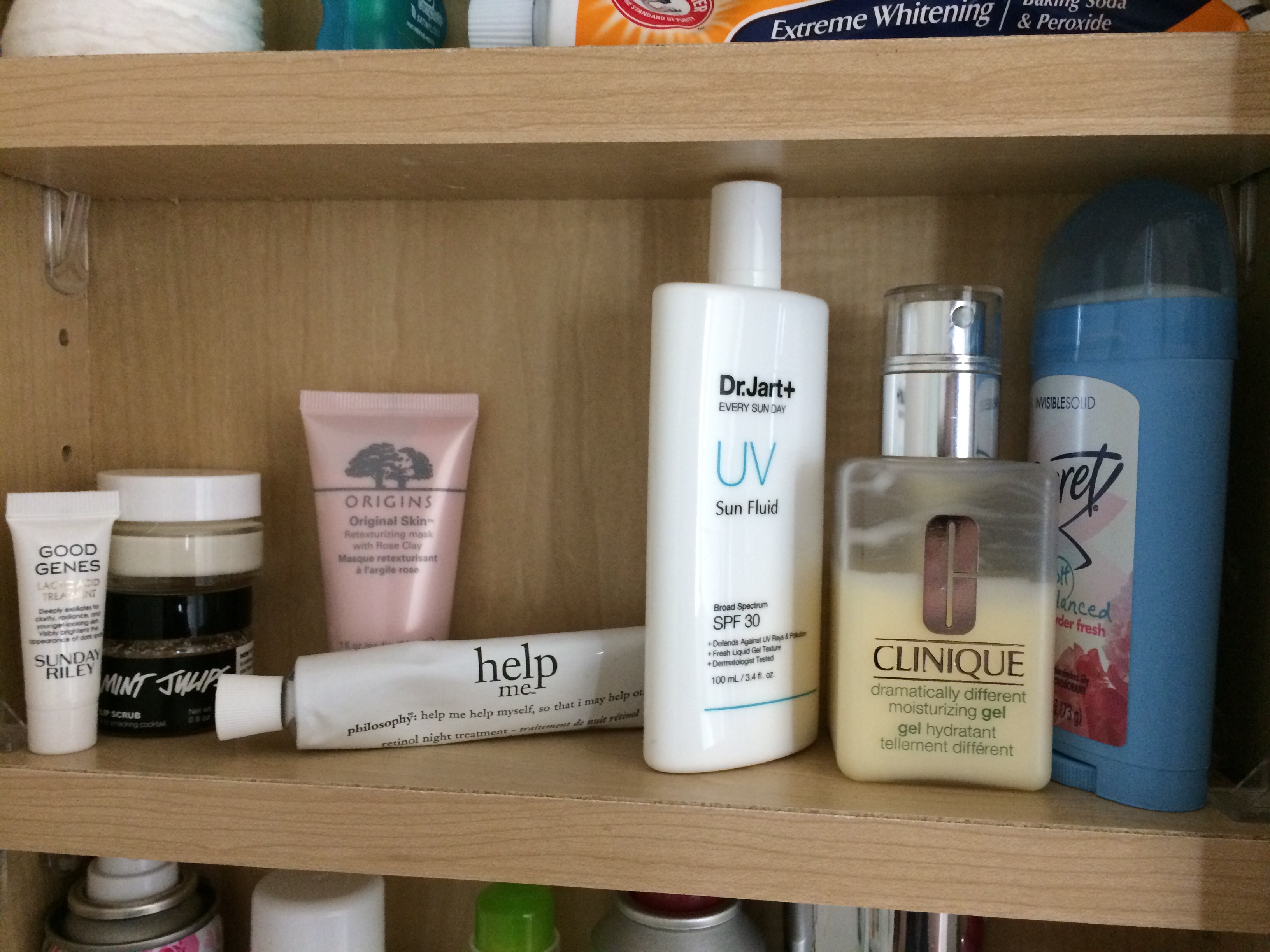The next shelf up has my skincare. I’ve got a few samples I’m trying to use up, my lip scrub, eye cream, my retinol treatment, sunscreen, my everyday moisturizer, and deodorant.