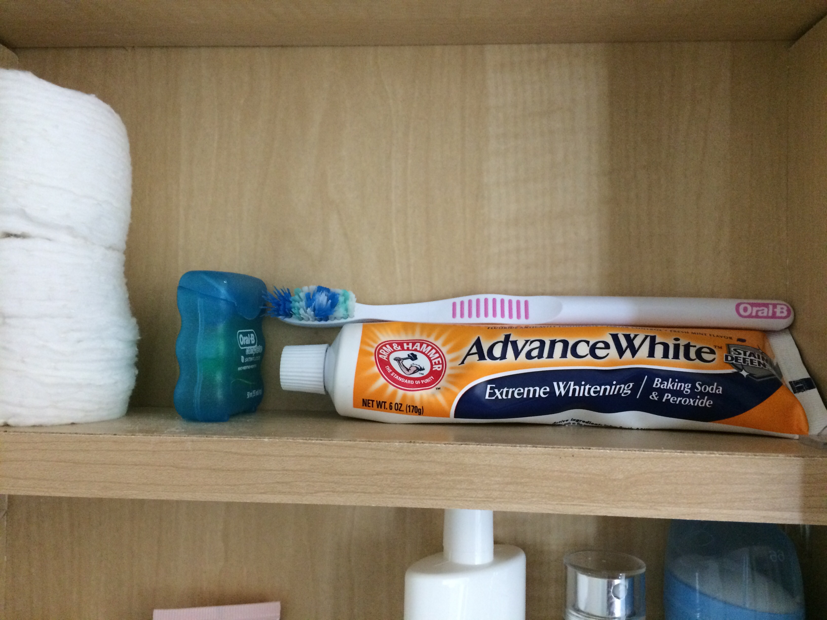 Lastly, the top shelf has my dental products and some cotton pads. I’ve got dental floss, my toothpaste, and toothbrush up here.