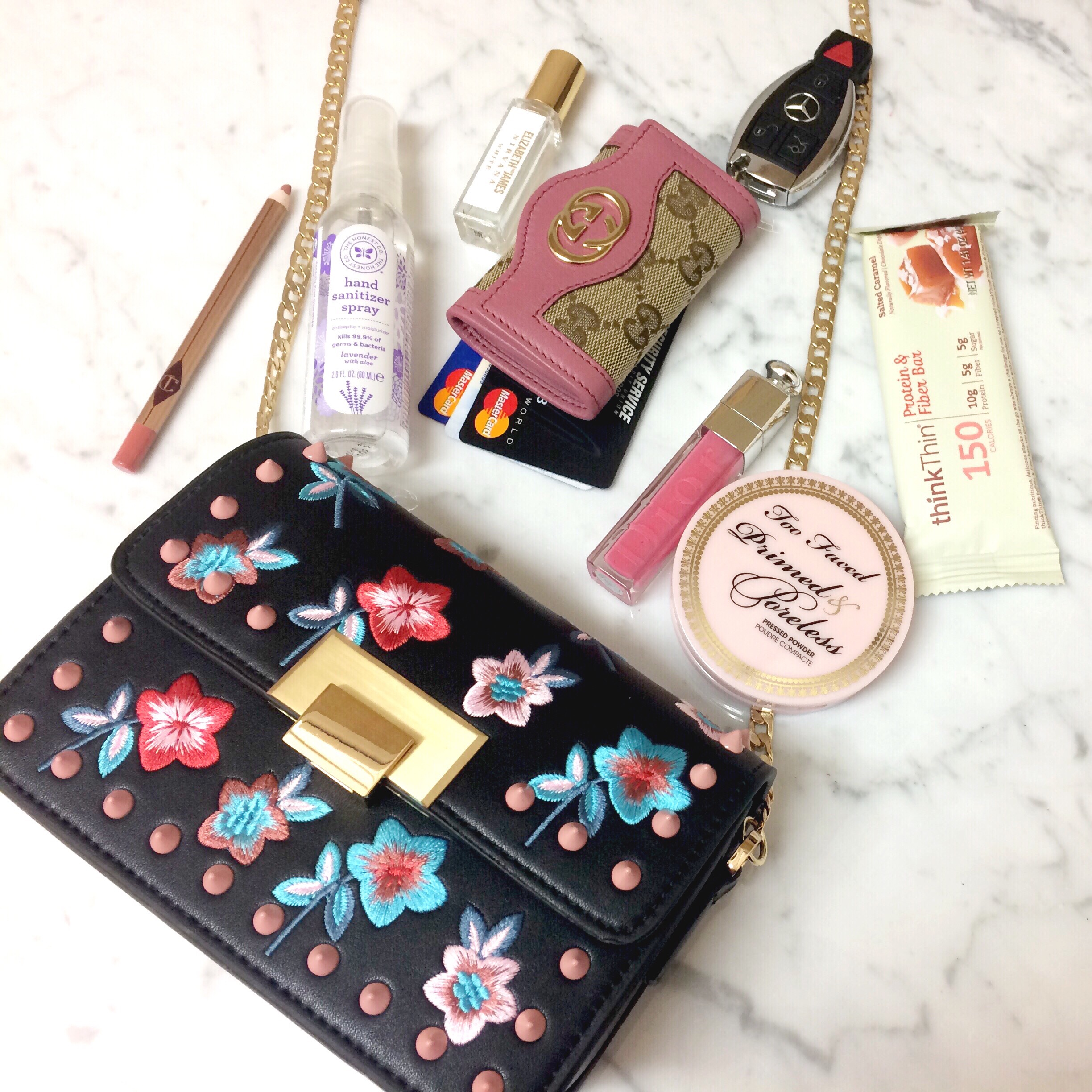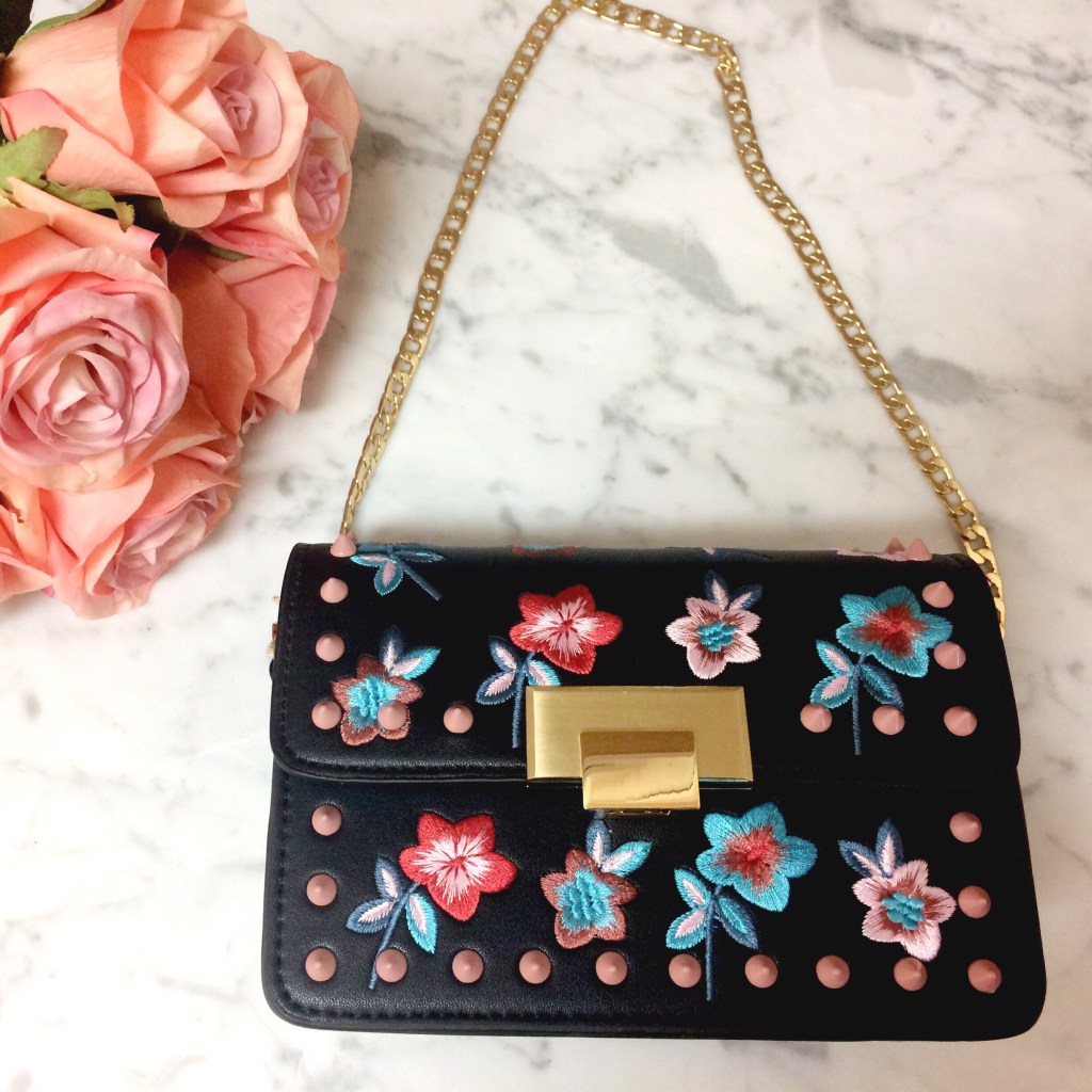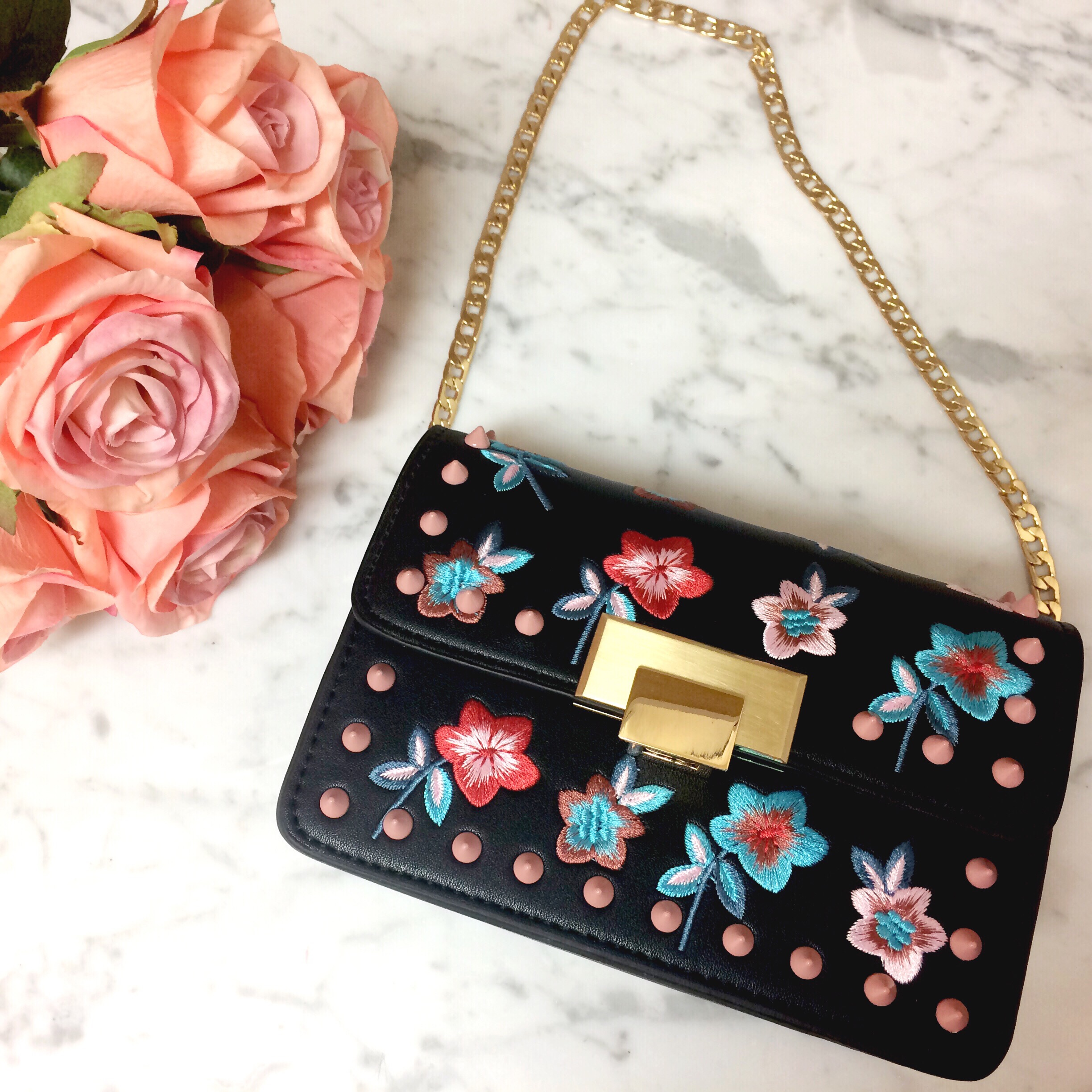 I saw this bag at Nordstrom, and I HAD to have it. I usually go for brown instead of black when it comes to shoes and bags, but I made an exception for this! The pink studs and embroidered flowers totally won me over.