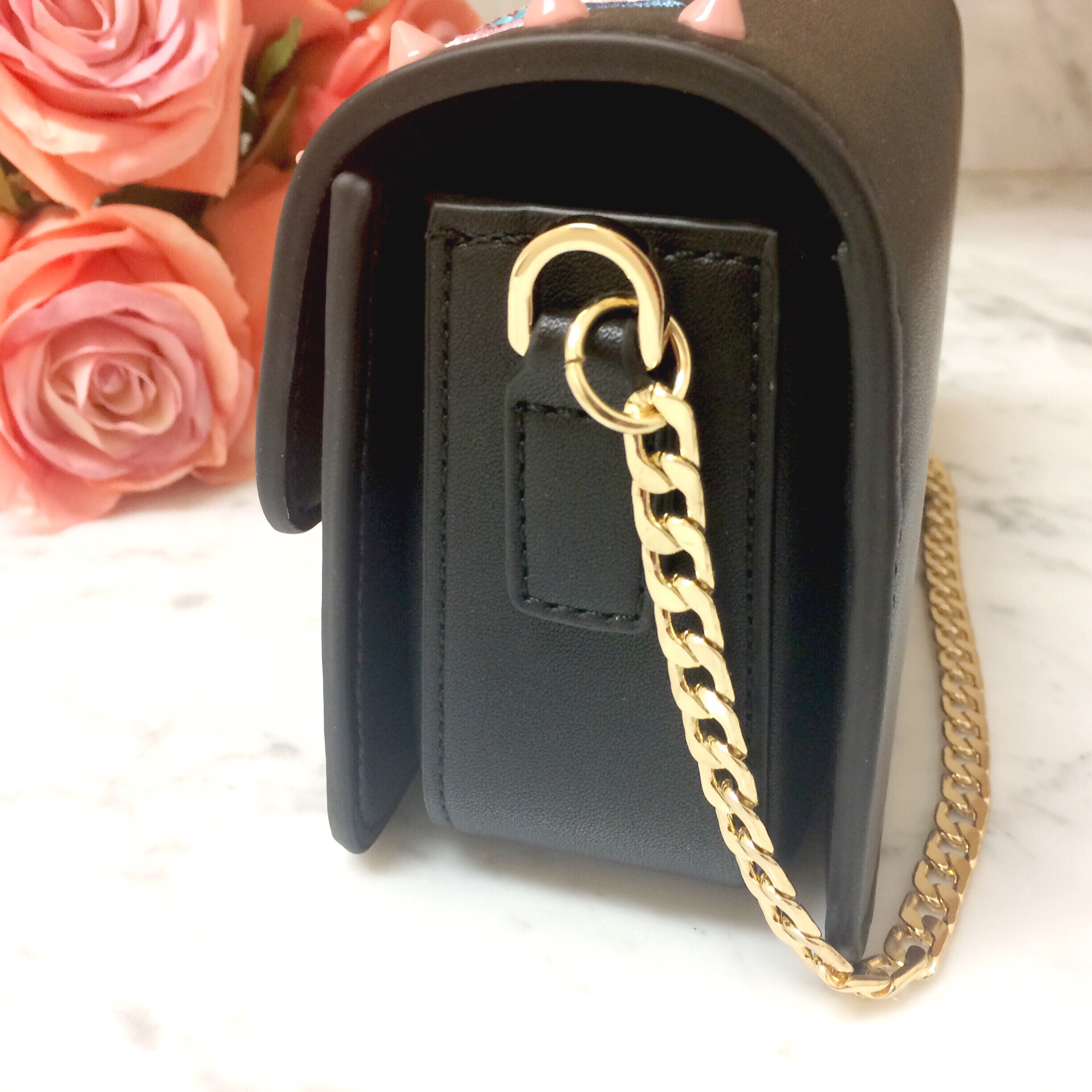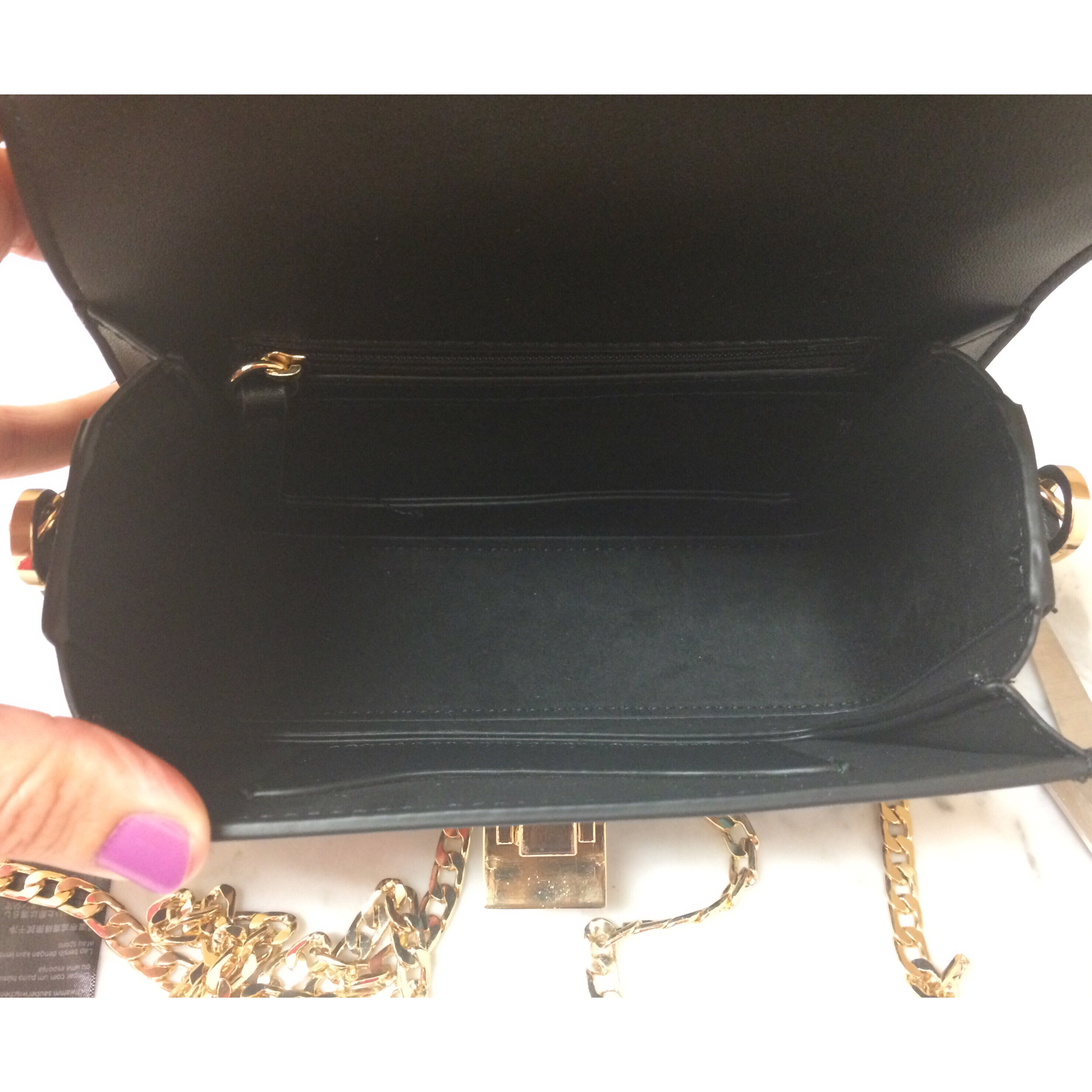 This bag is very small, but is thicker, so I can fit everything I need in here. It has a long gold chain that you can use to wear crossbody, or you can tuck it into the bag for a chic, night out clutch! Inside, there is a zip pouch and a little pocket to put cards into.