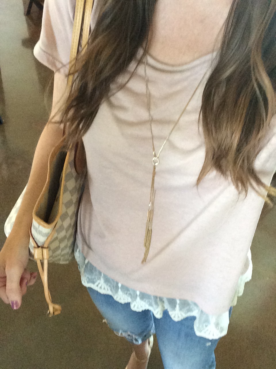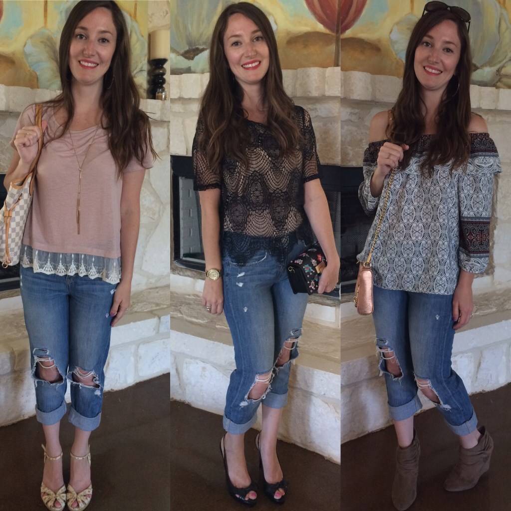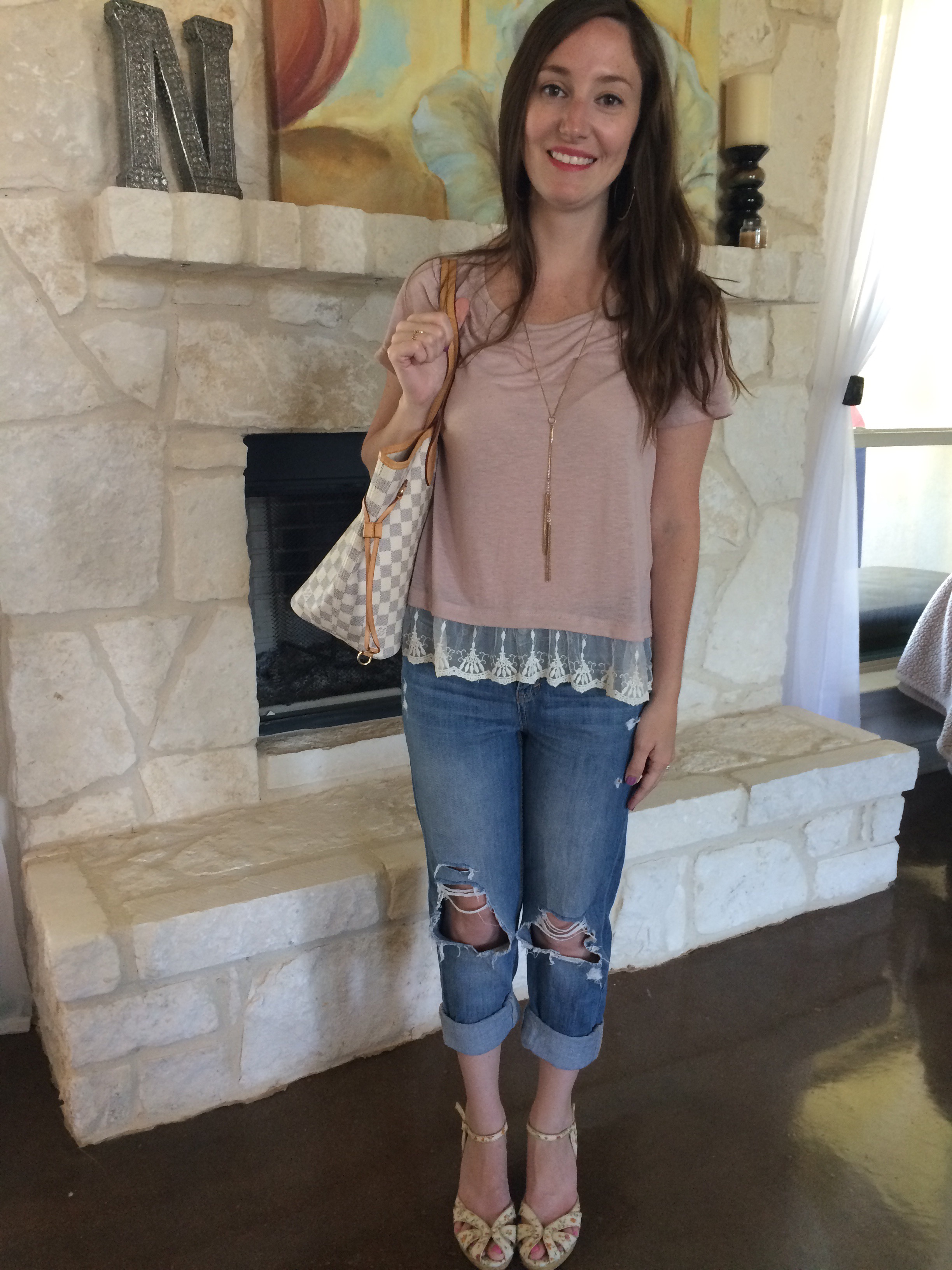 This outfit is the most casual out of the bunch. I’m wearing just a simple blush colored tee with some lace detail at the bottom. So comfy, but still cute!