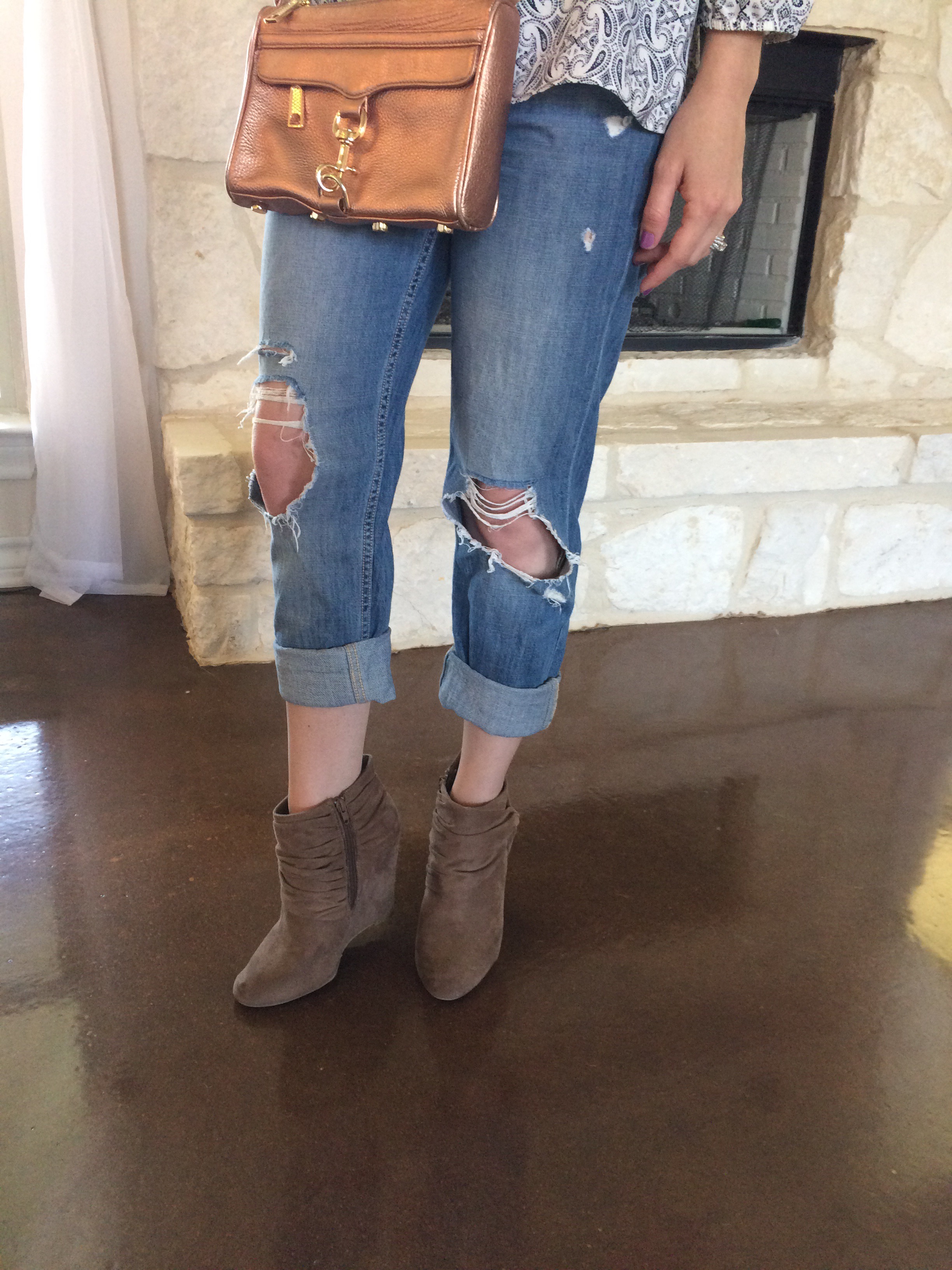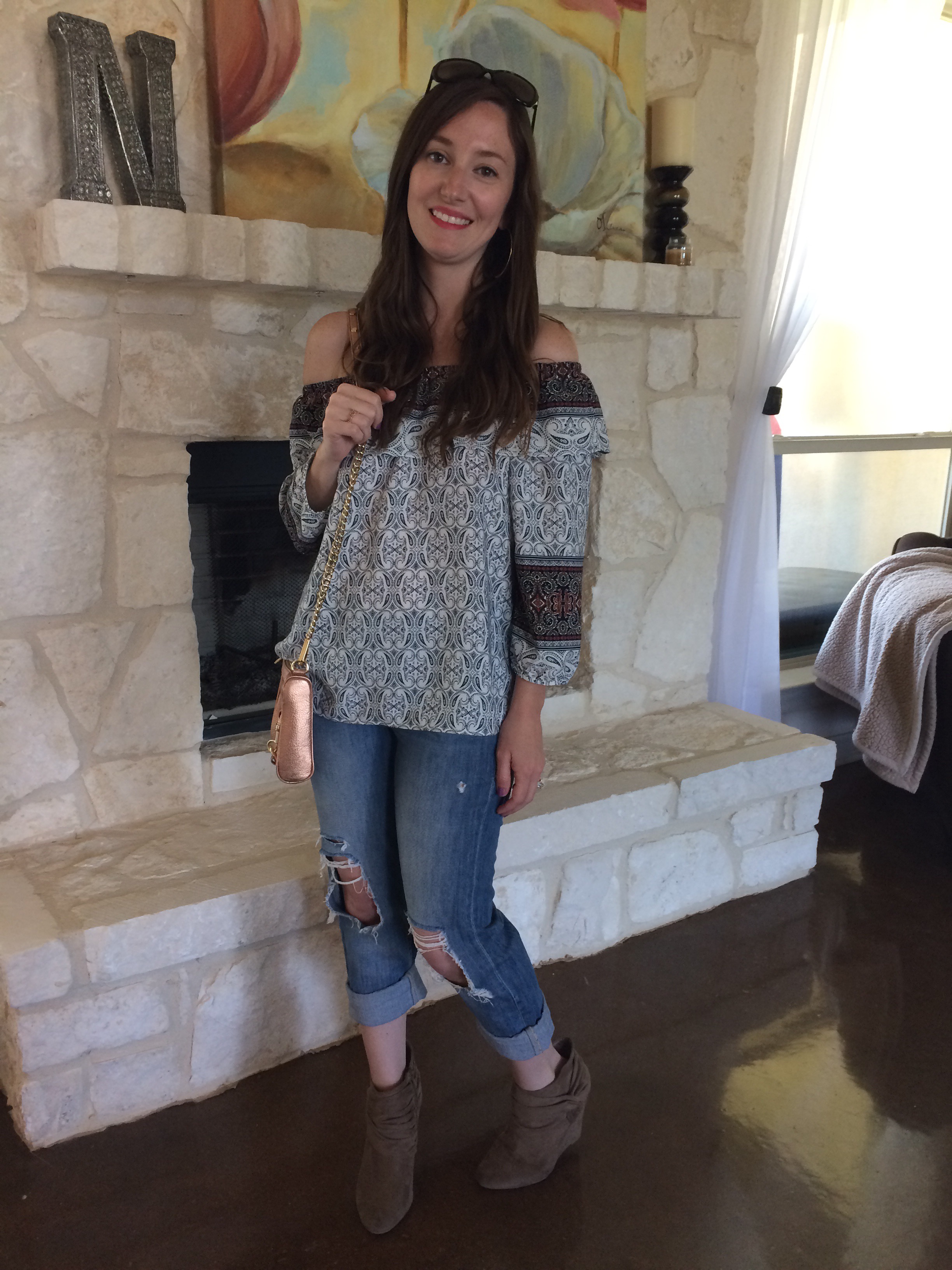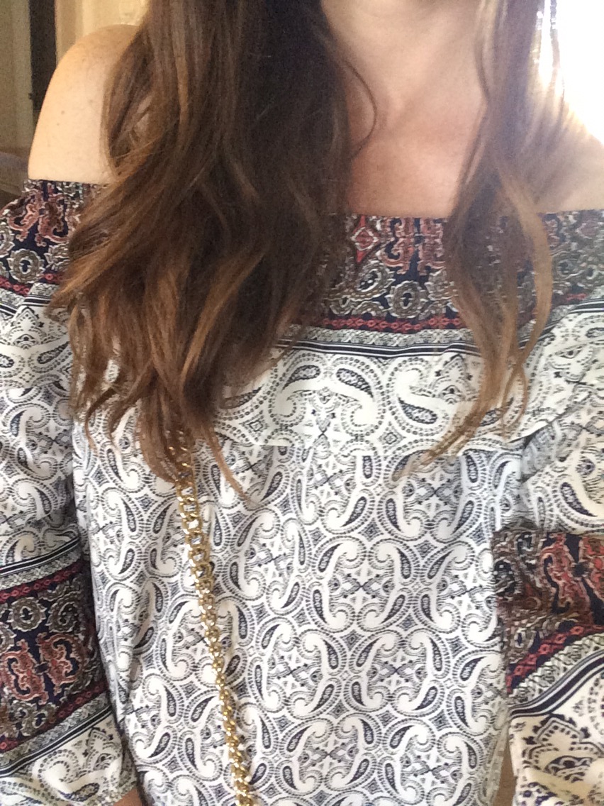 This outfit is a lot more casual, I paired the jeans with this off shoulder, 3/4 sleeve peasant-type top. I love the paisley print, and it’s so comfortable and flowy. Off the shoulder tops are so in and I am loving how feminine they look.