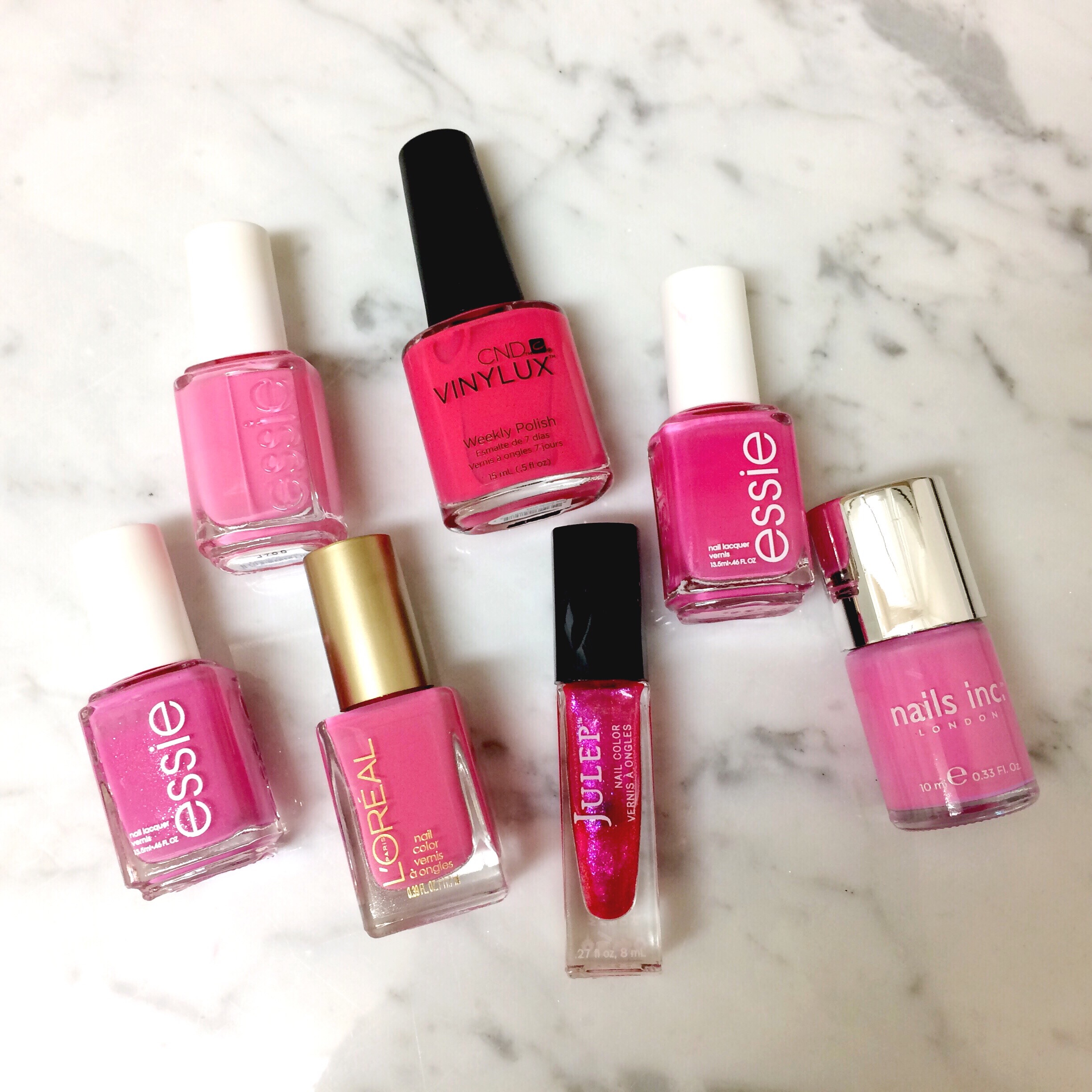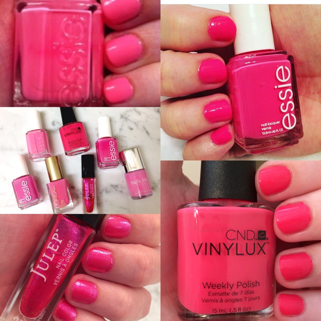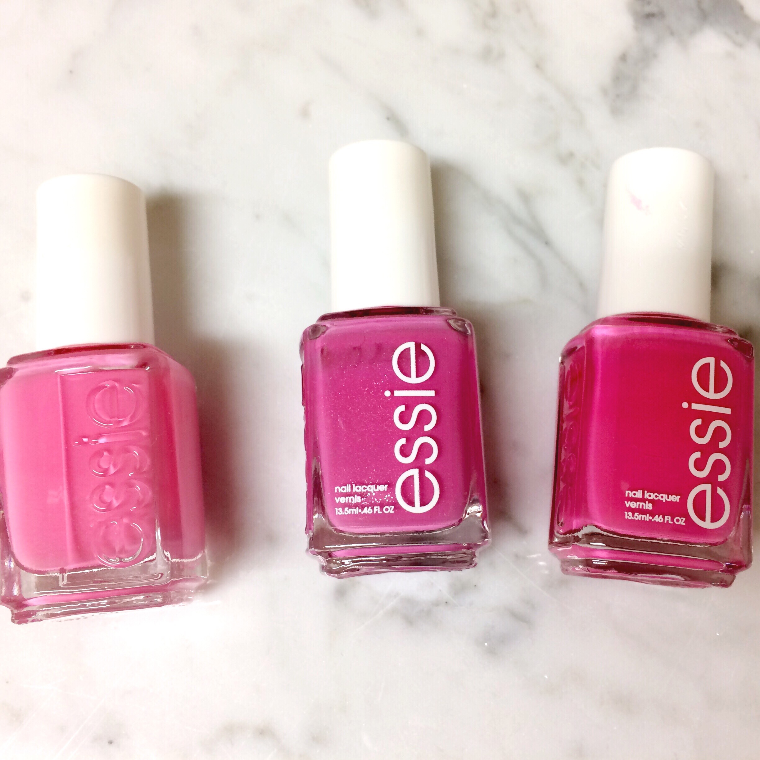 For a pinky purple vibe with a teeny bit of shimmer, here’s Essie The Girls Are Out. For a true hot fuchsia pink (and toe polish staple for me) Essie Mod Square. I think this is my 3rd bottle of this color!