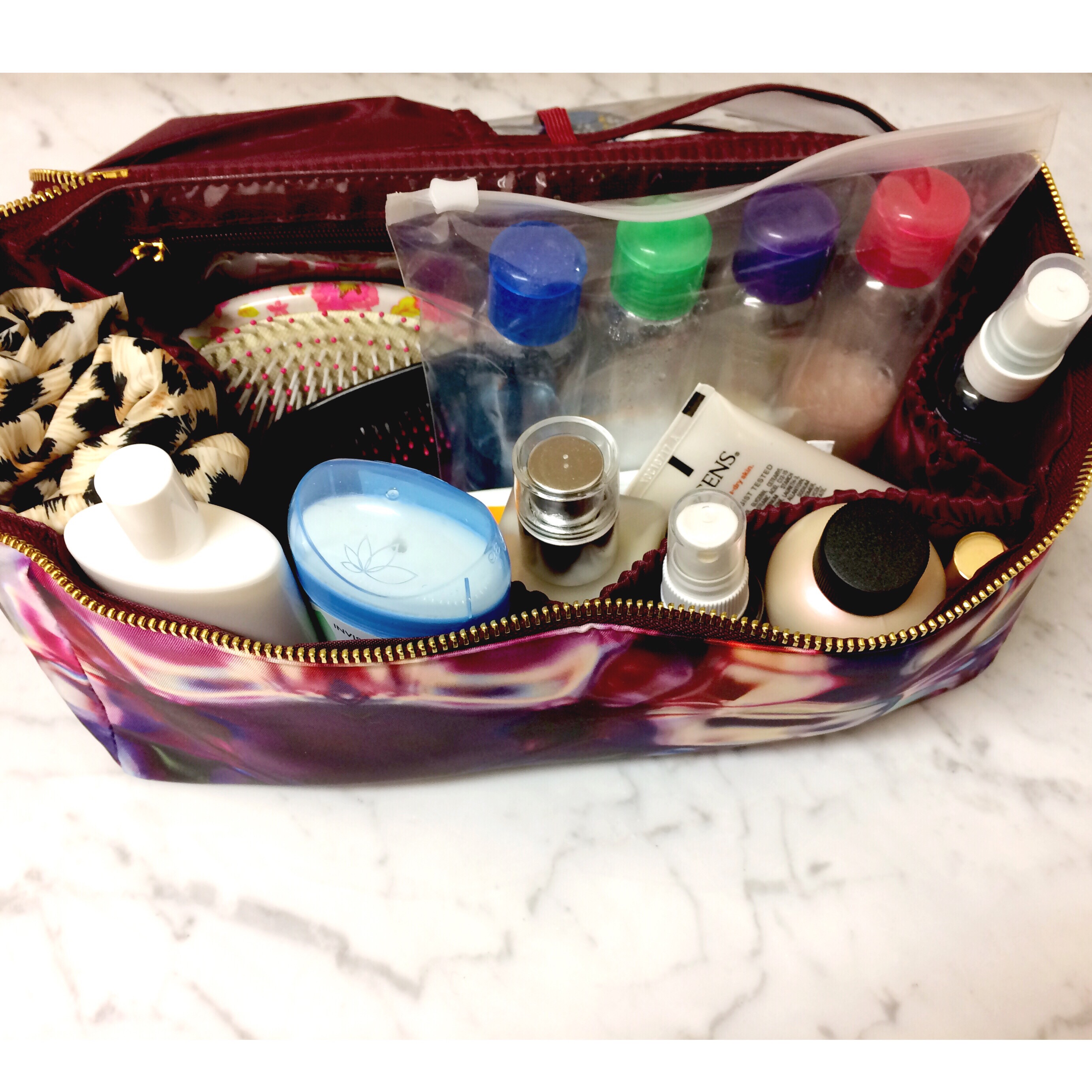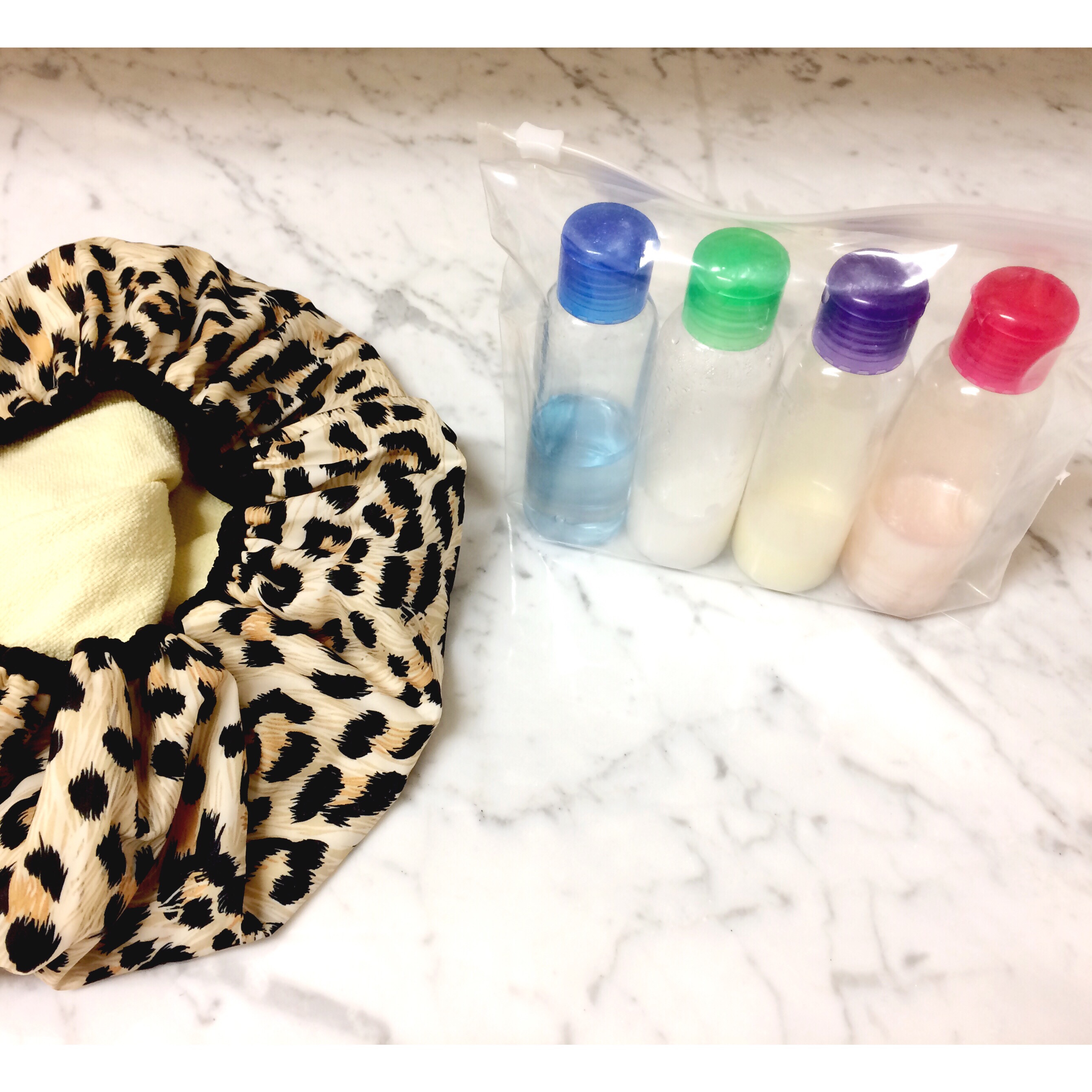 I always pack a shower cap cause let’s be honest, I’m not gonna wash my hair everyday. I also pack this little set of clear plastic bottles that I fill with my products. I have shampoo, conditioner, face wash, and body wash. This is so much easier and economical than buying a bunch of travel sized things I always end up throwing away.