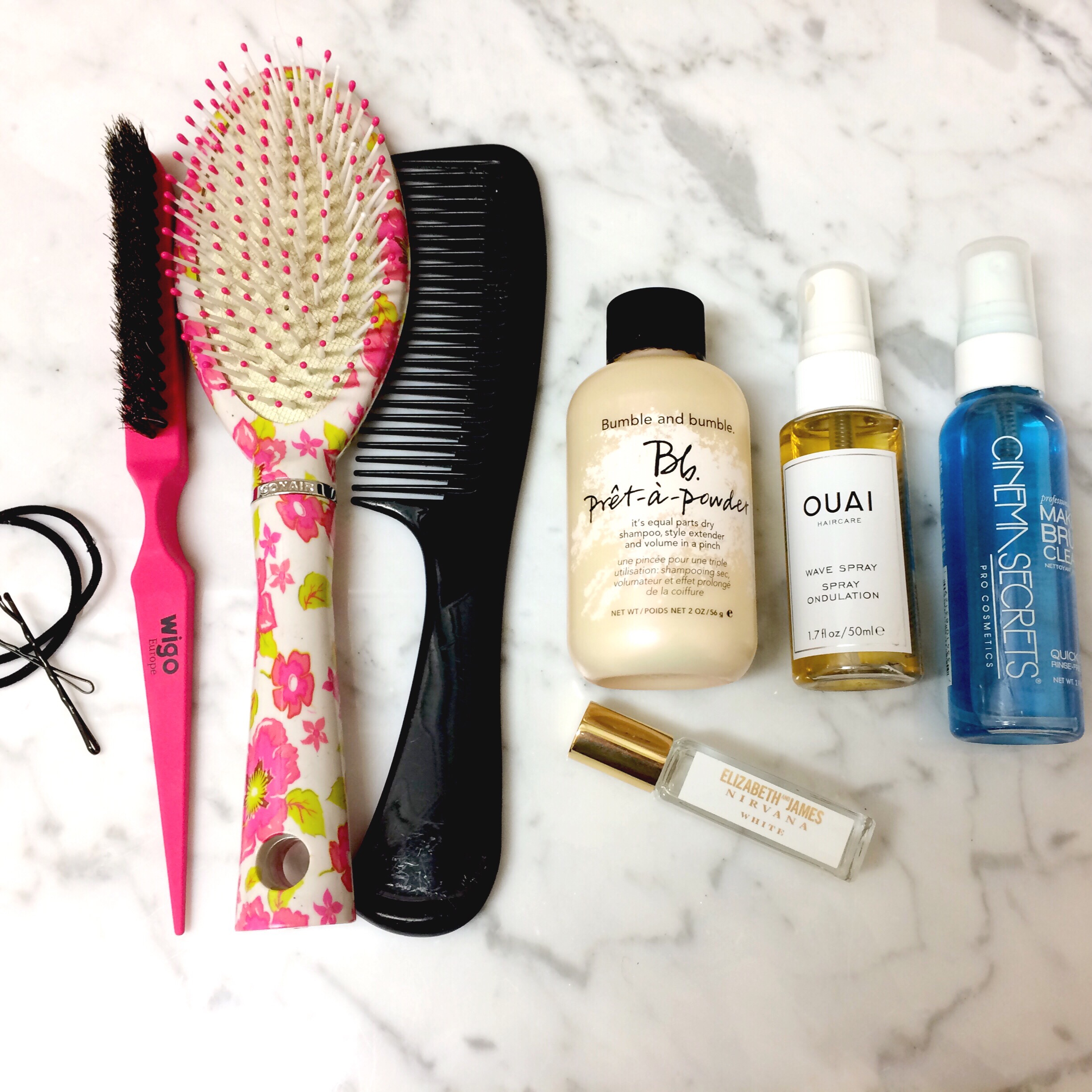 Now, for haircare, I always throw a few hair ties and pins in with my hair brushes and comb. I pack my Bumble and Bumble Dry Shampoo Powder for a hair refresh and my Ouai Wave Spray, that you can use on wet or dry hair. I also throw in a Cinema Secrets Brush Cleaning Spray for quick eye brush cleaning and an Elizabeth and James Nirvana White Perfume Rollerball.