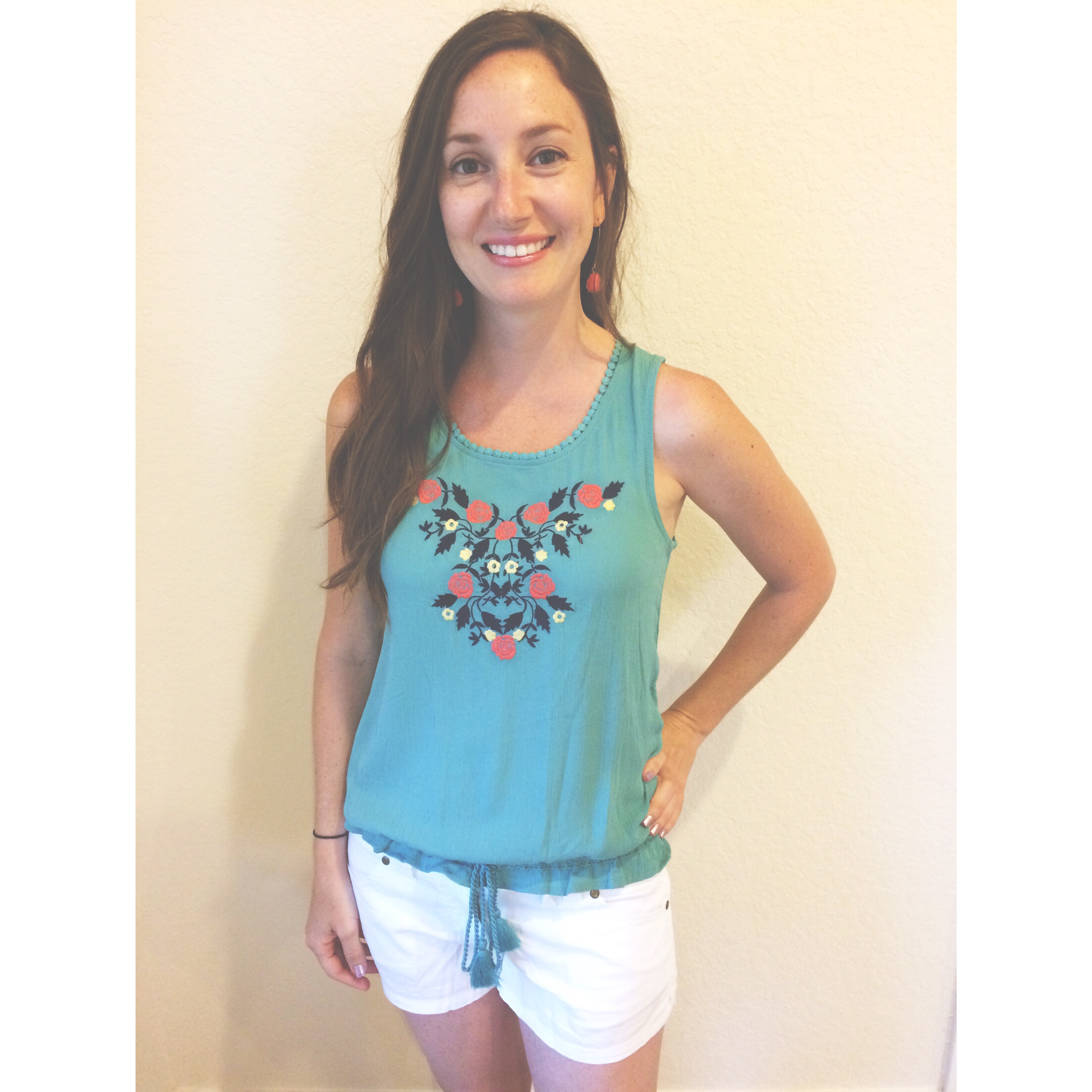 Lastly is this sleeveless top with some pretty embroidery detail. This has a really cute tie at the waist that cinches in. I’ve been wearing this top with white shorts, and I even wore it with a blue jean skirt the other day and it was so cute.