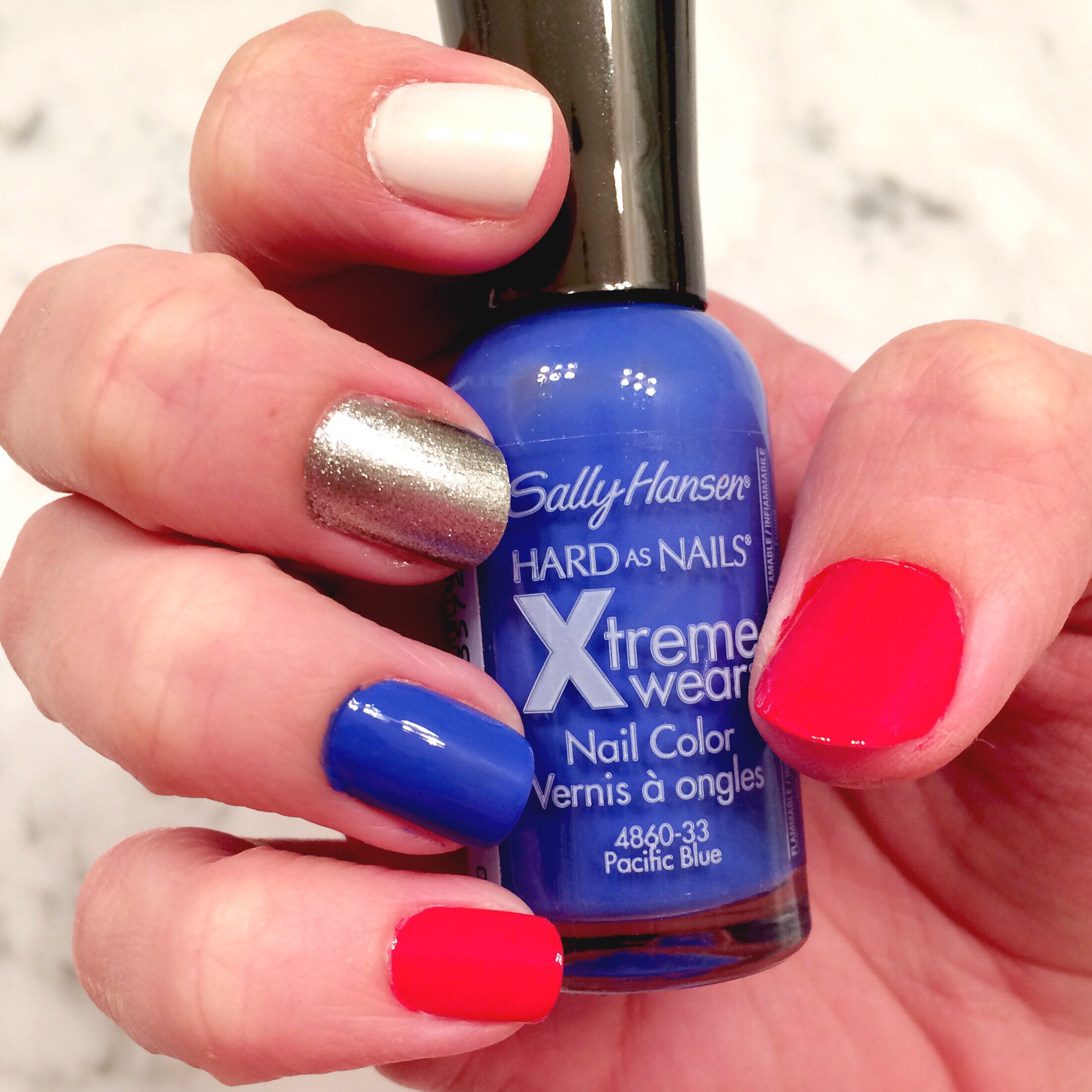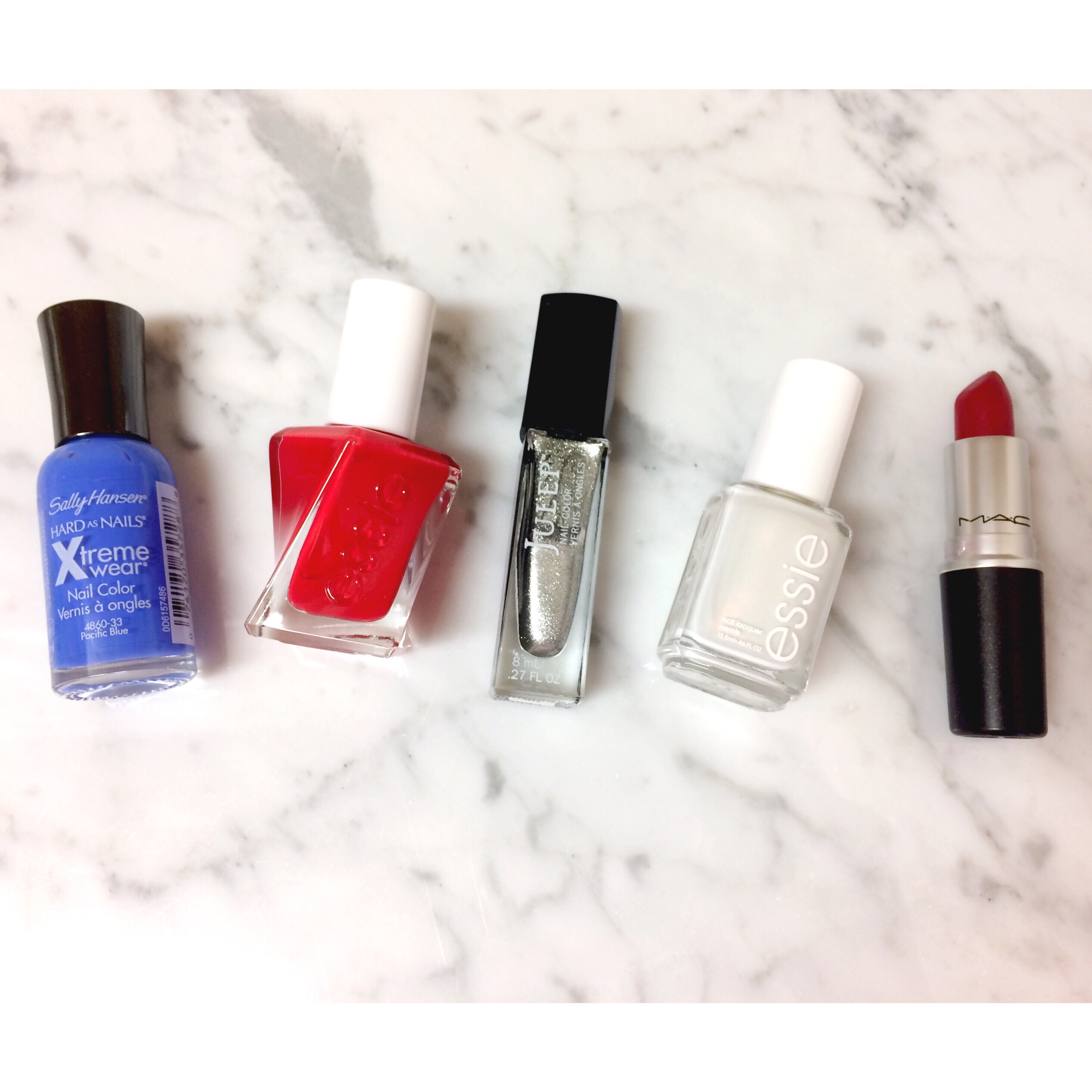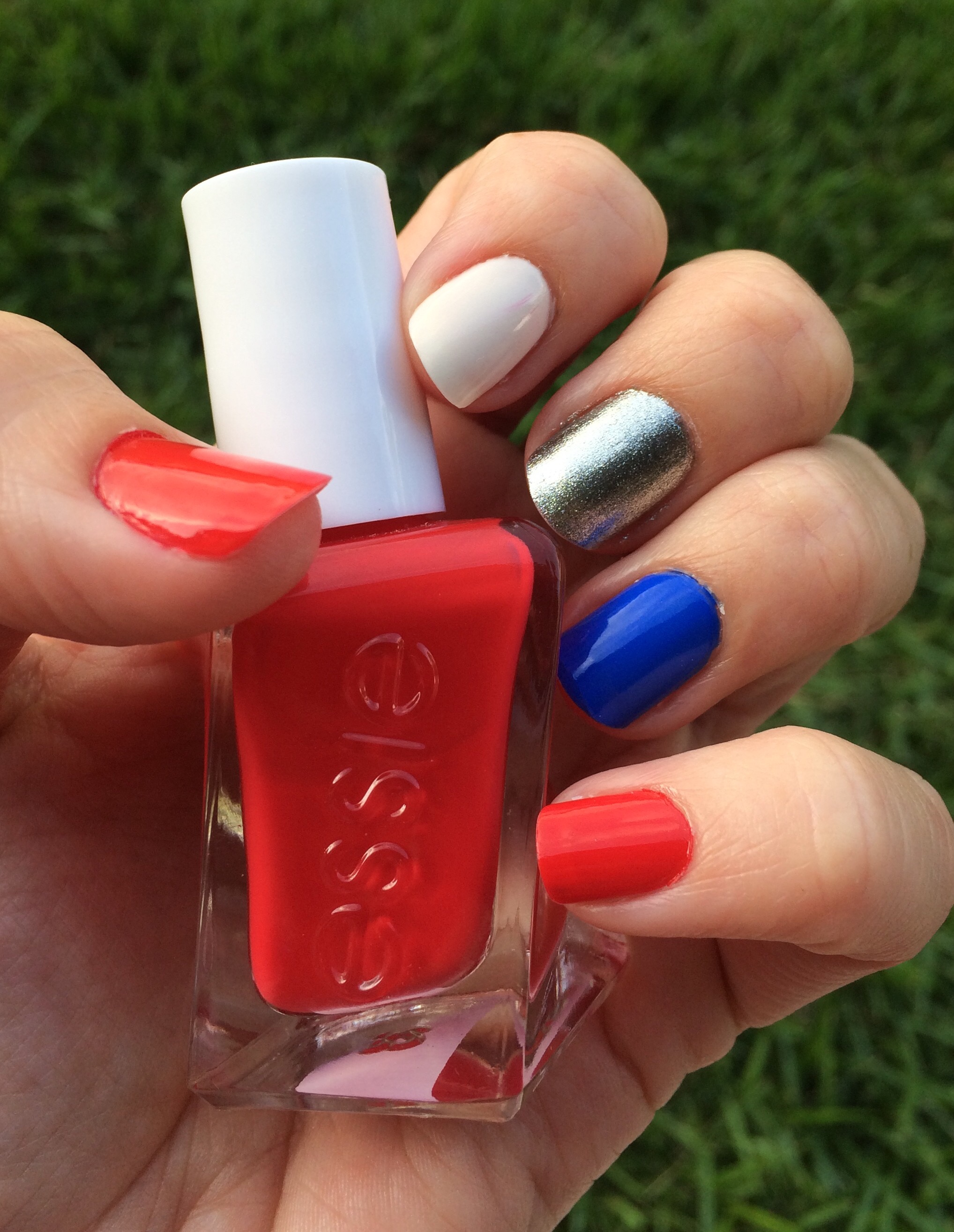 The blue I love is Sally Hansen Pacific Blue, which is the prettiest bright royal creamy blue.  For the red, I love Essie Gel Couture in Rock the Runway, because it’s bright and the perfect red (it’s on my toes too).  I like to do a silver to give it some sparkle, and Julep Missy is my favorite opaque metallic silver.  For the white, I chose Essie Sweet Souffle because it’s got a little bit of gold iridescence to it that is gorgeous.