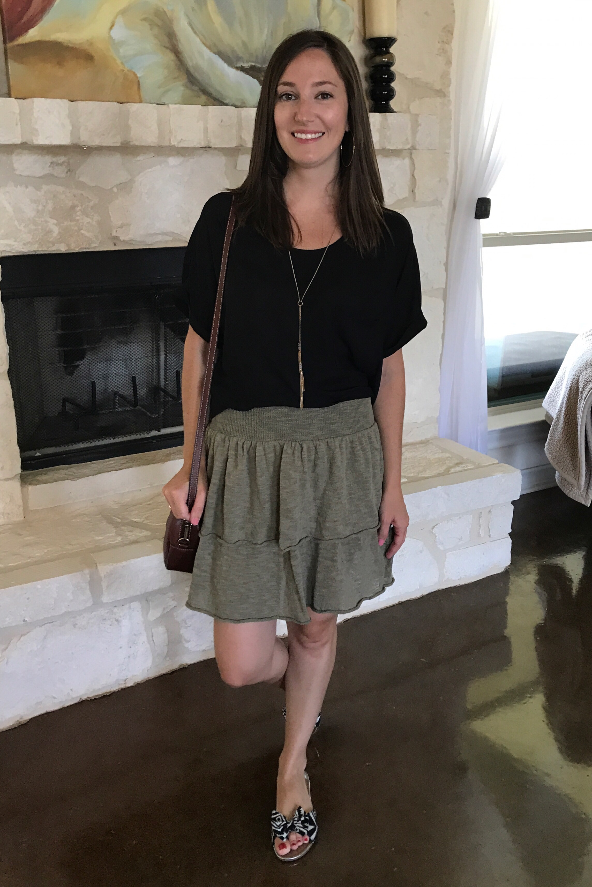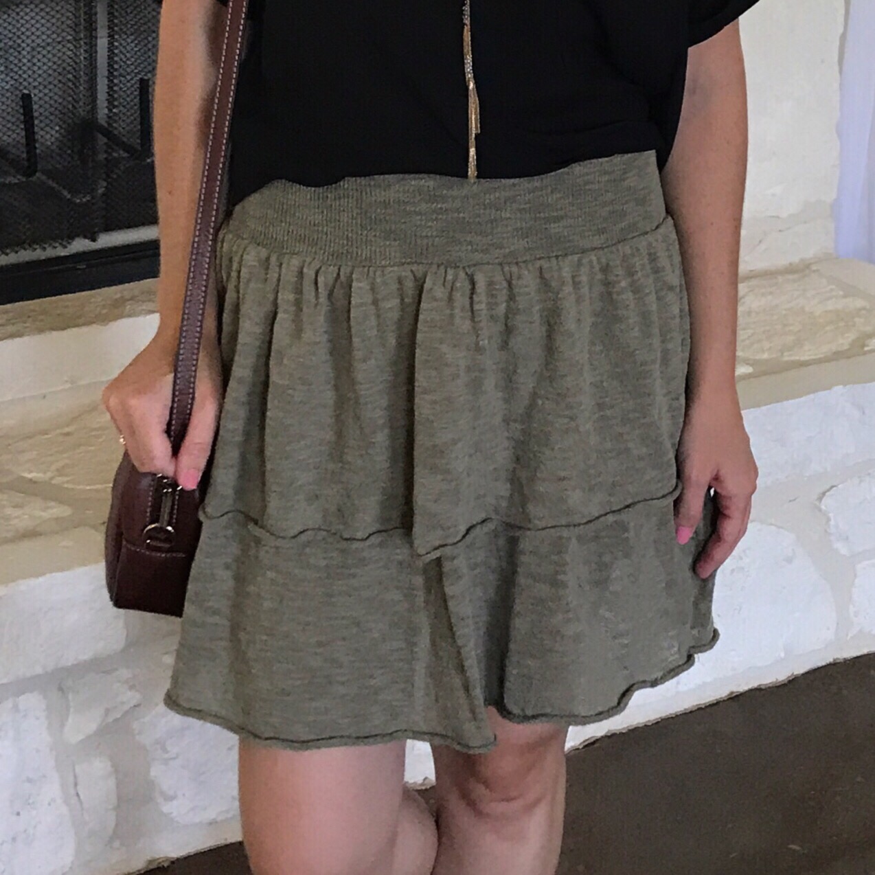 First off, I love the color. They call it khaki, but I think it’s more of an army green. I feel like this color really flatters my skin tone and I just love the soft material. It has a nice thick waistband and it’s tiered. It’s a short skirt, but not too short. I also love this with a plain white tank.