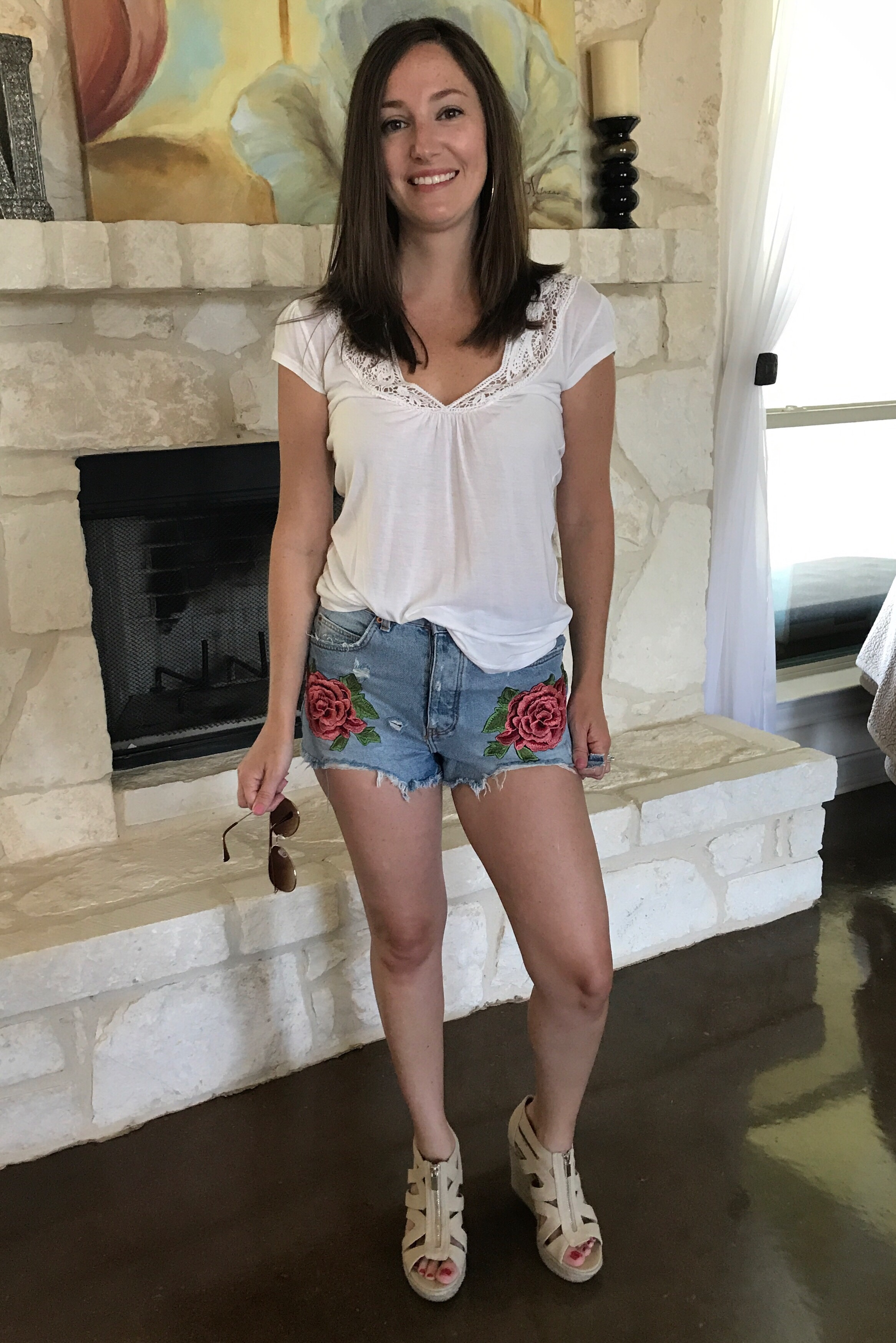 As soon as I saw these, I knew I needed them! The embroidered flowers are totally 80’s- they remind me of Guns N Roses! I love that they are distressed and high waisted. I’m totally into the “mom shorts” trend.