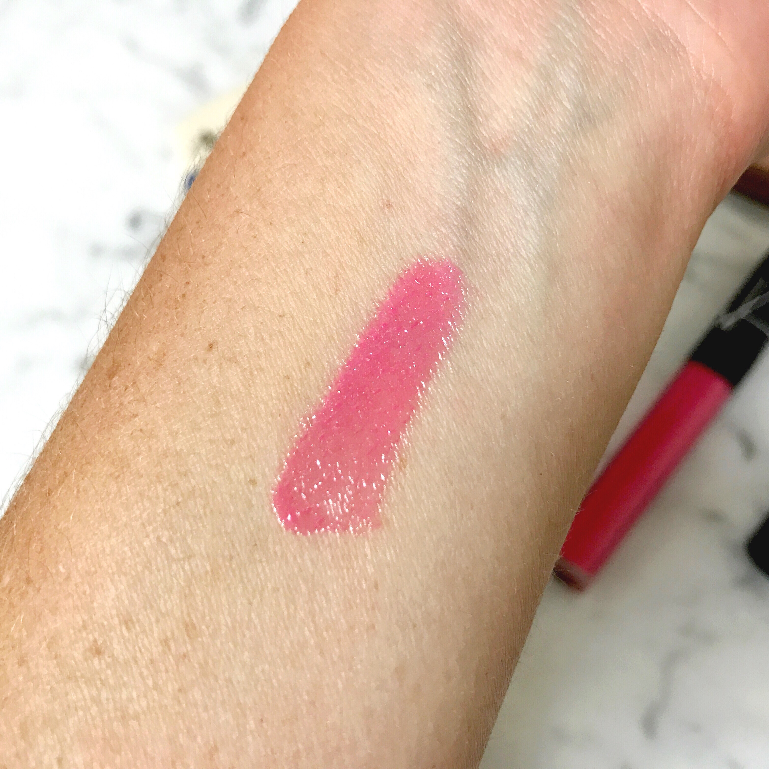 First off, this pink gloss. NARS is my second favorite brand for gloss (Dior is first), because I don’t find the glosses to be too sticky, and they last pretty long on the lips! This color here is called Angelika, and it is described as a “cotton candy pink with gold particles”. This is a cool toned medium pink that is sheer, but still looks so pretty on the lips. Here’s a swatch.