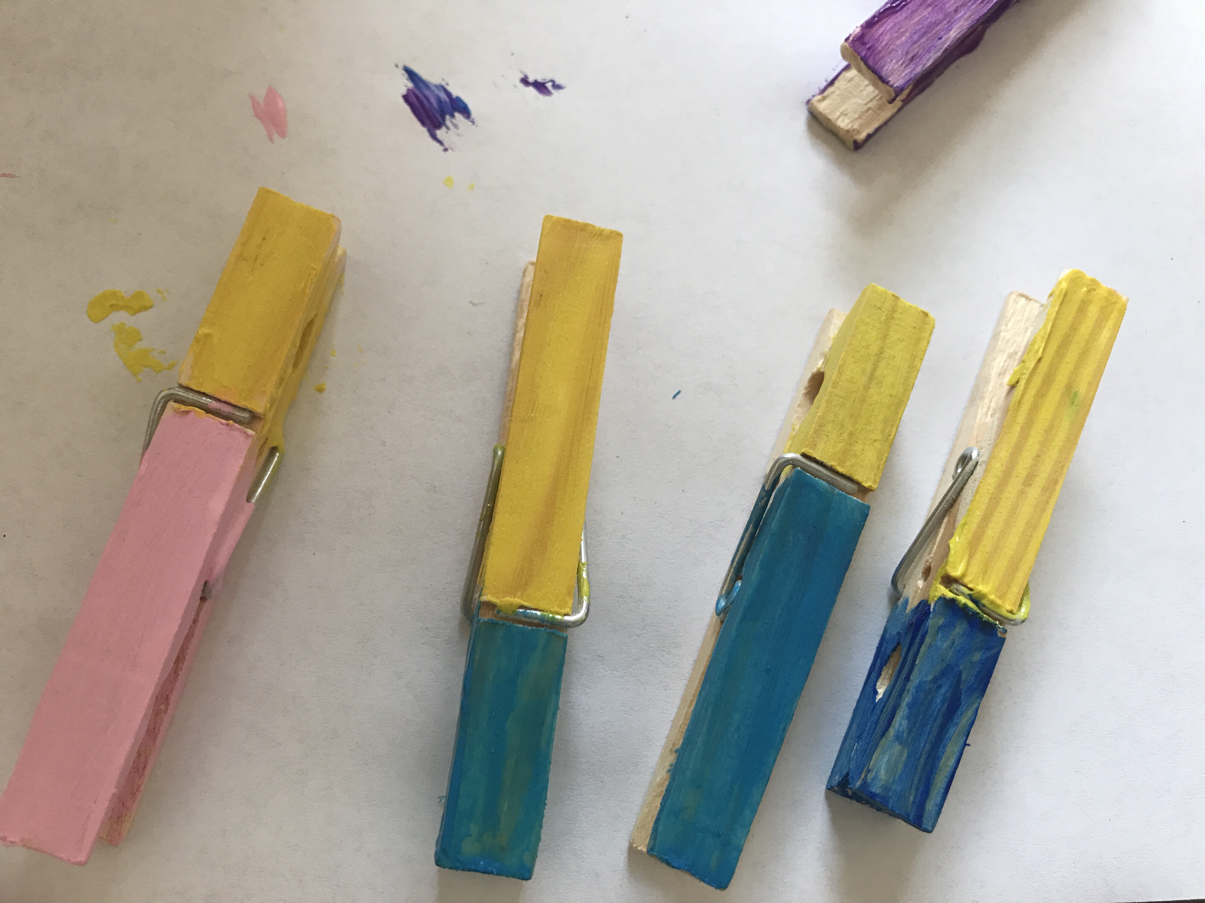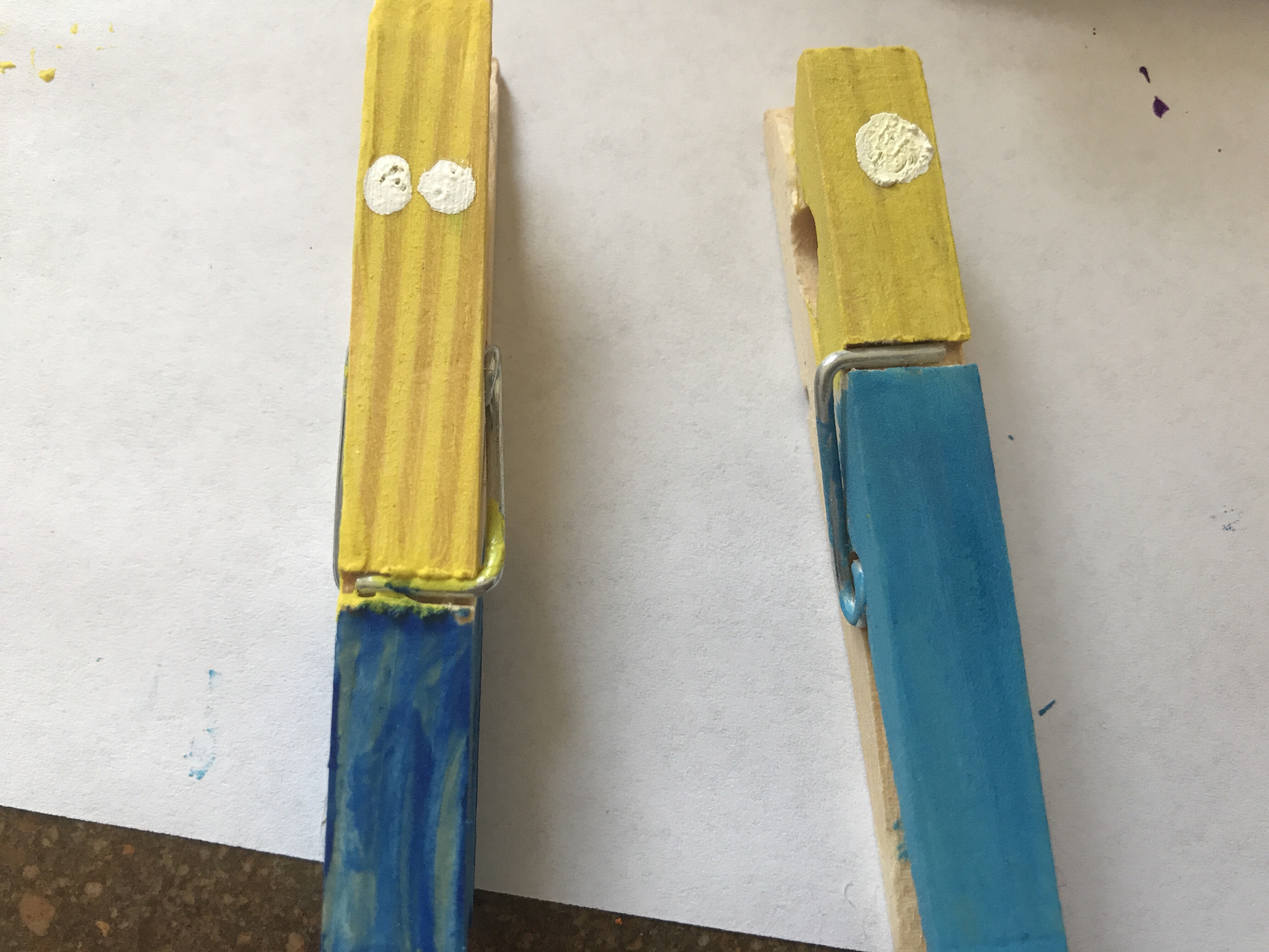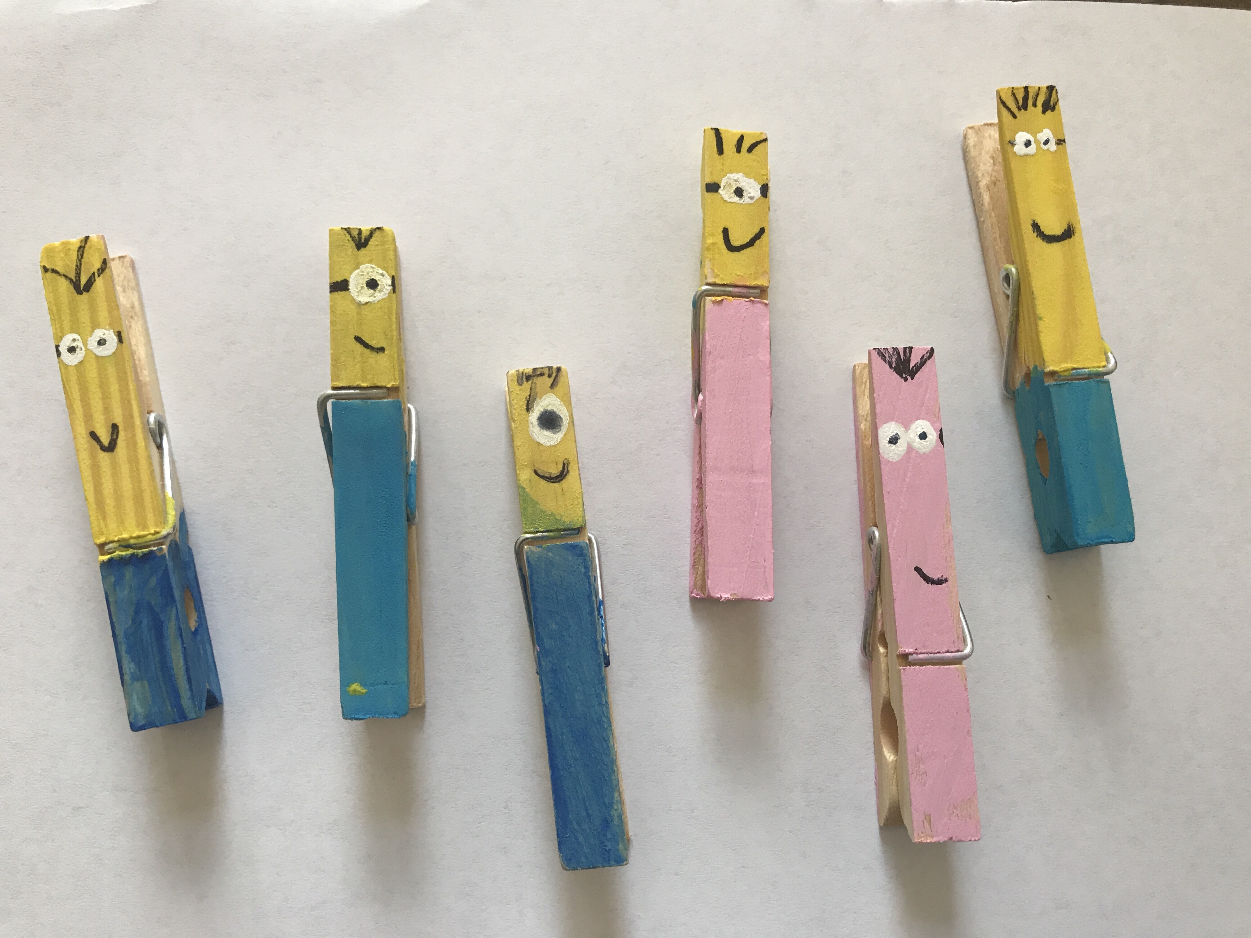 These are just clothespins painted to look like minions. You can use these to hang artwork or for any kind of decoration. My girls also like to have puppet shows with these!