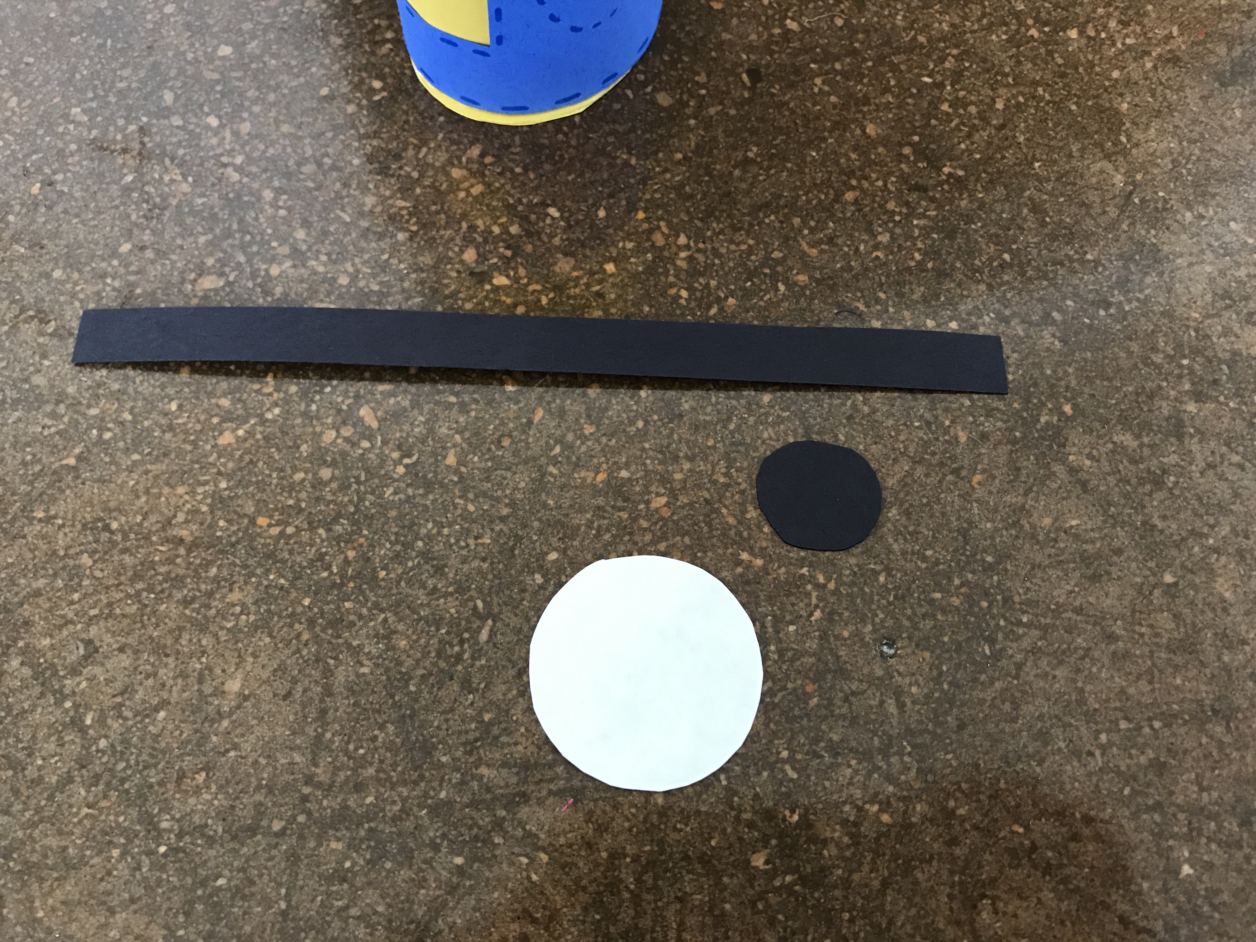Next, cut out a white circle, a smaller black circle, and a strip of black that is 5 1/2 inches long.