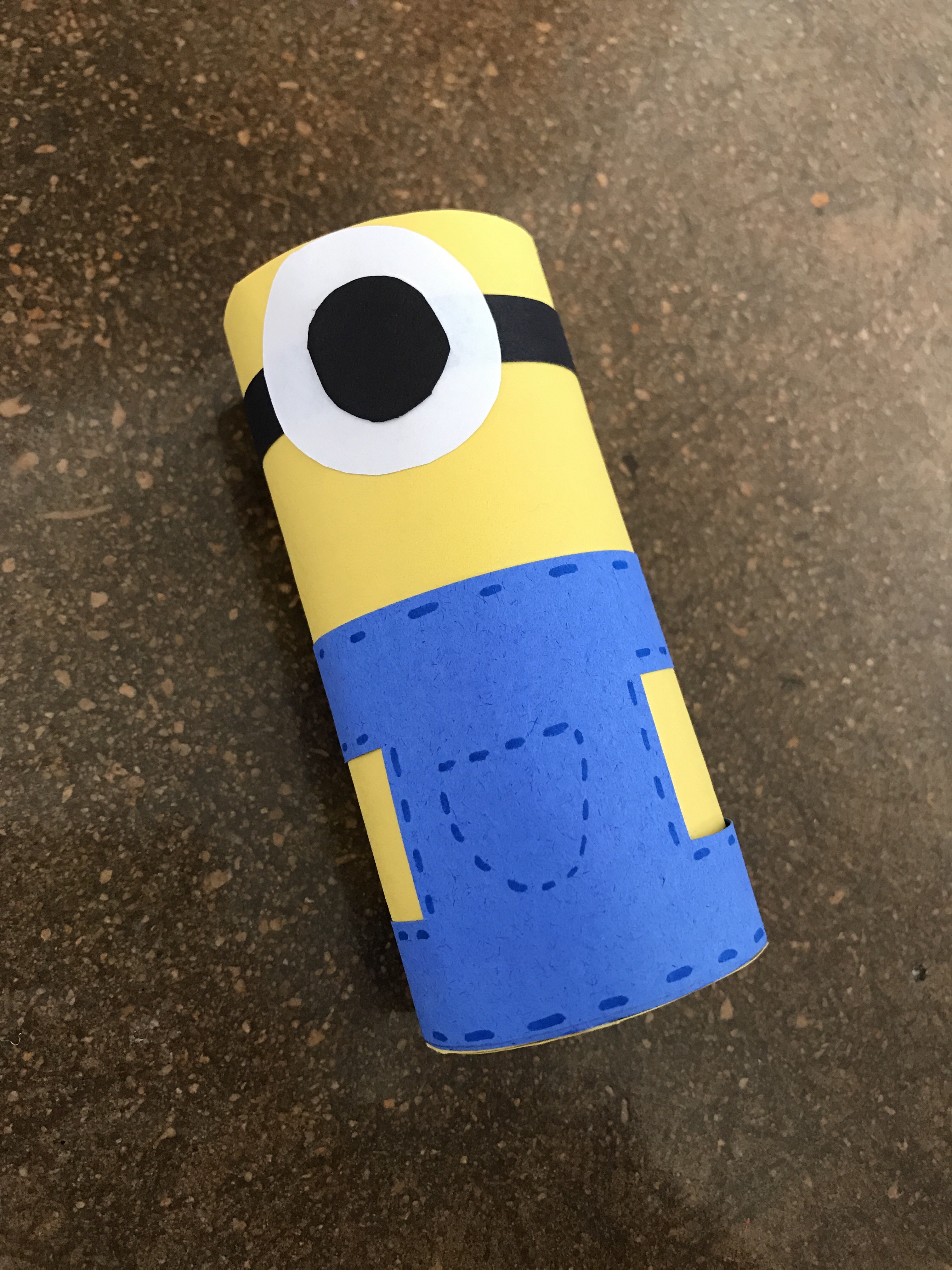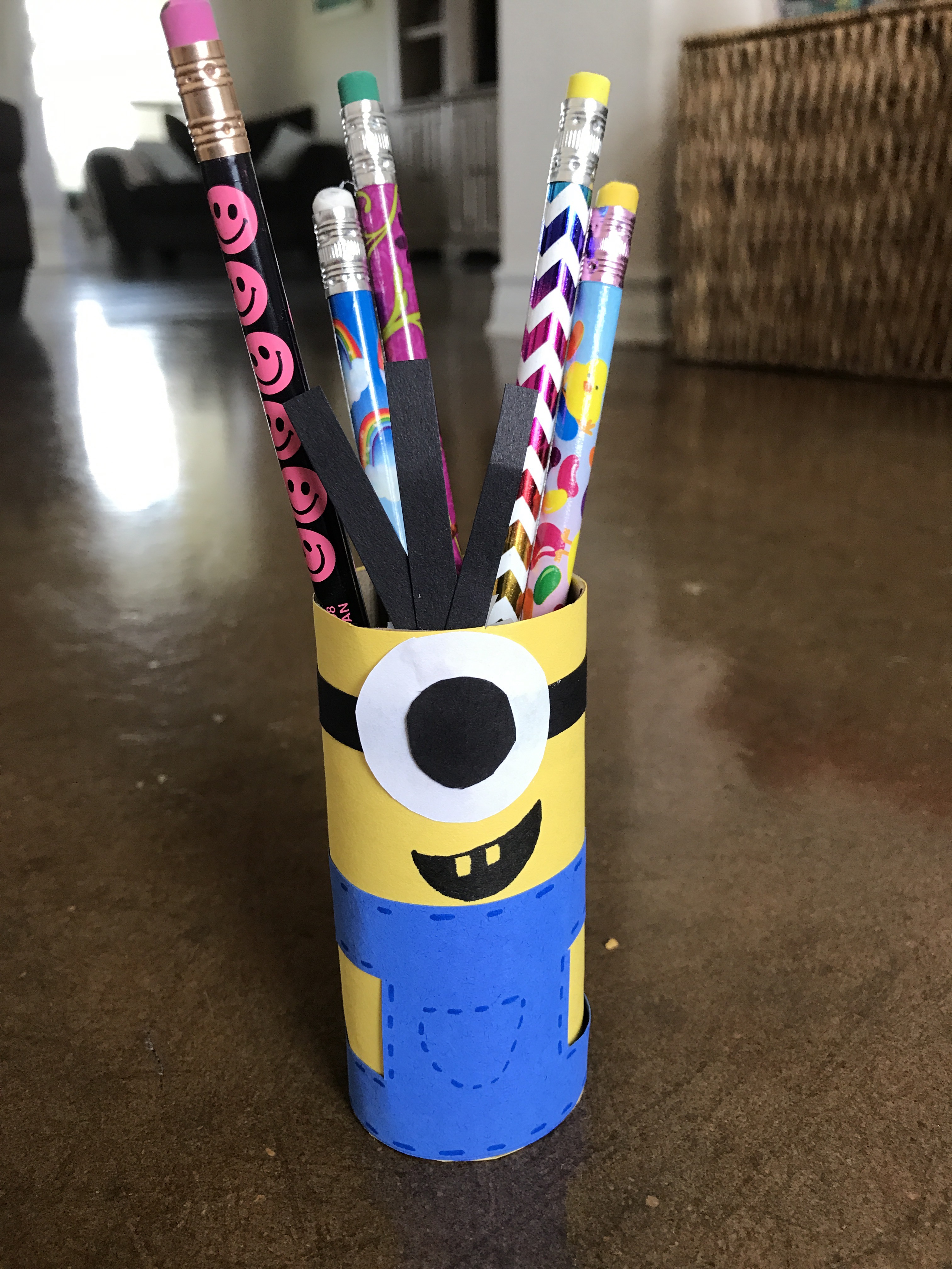 This craft is just a toilet paper roll decorated like a minion. Allie thought it would make a cute pencil holder.