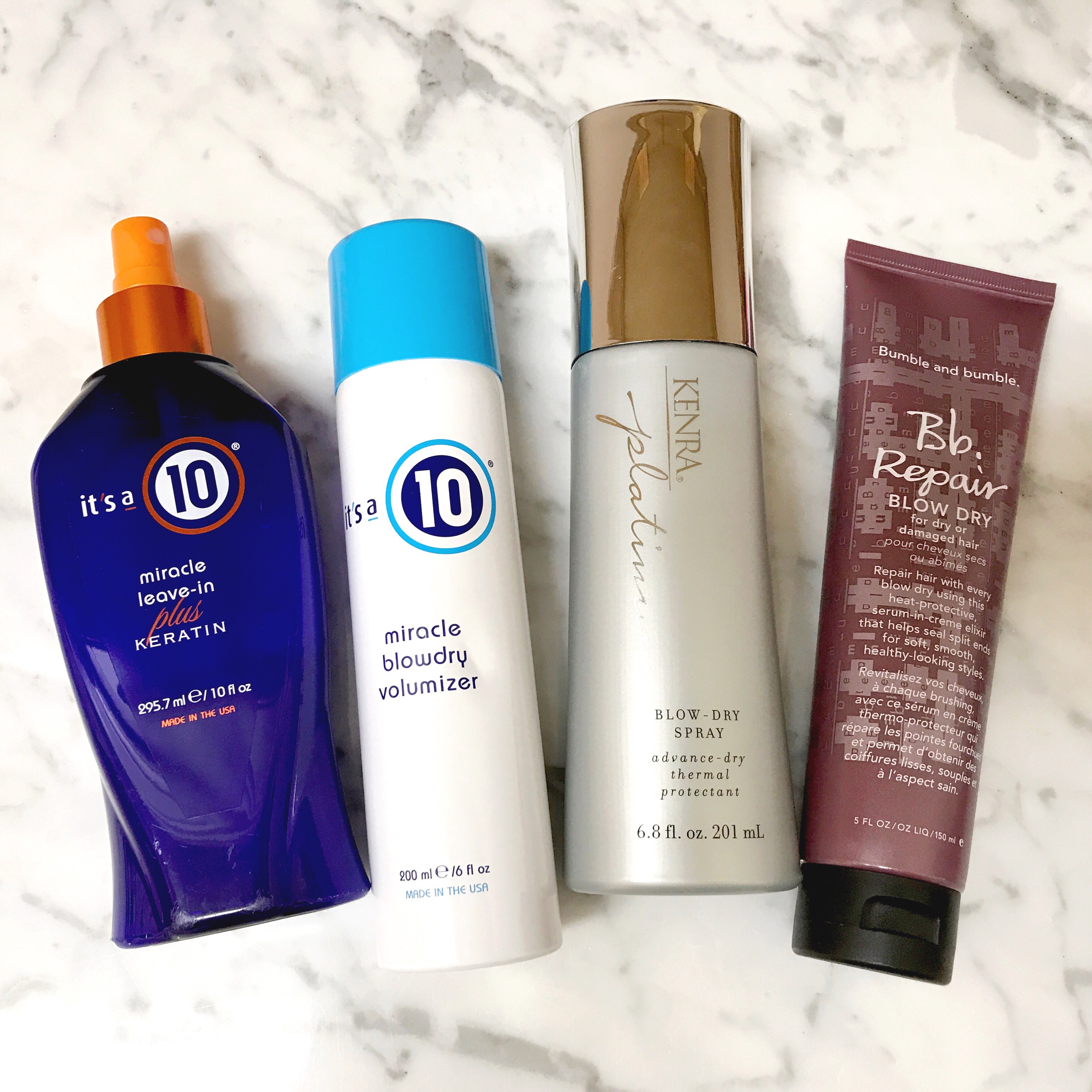 It’s a Ten Miracle Leave in Product Plus Keratin is my favorite because it has ten different benefits for your hair. I use this on my girls when I blowdry their hair. It’s a Ten Miracle Blowdry Volumizer is good if I want to add a lot of volume to the hair, and also has the ten benefits. The Kenra Platinum Blow Dry Spray helps hair to dry faster and smells AMAZING. The Bumble and Bumble Repair Blow Dry is a creme that really smooths the hair- perfect to use before flat ironing. All of these products here protect the hair from heat, help to soften the hair, and help to smooth the hair. I think styling products and finishing cremes like these are more important than the actual conditioner, since you leave them on the hair, and that’s why I tend to like the higher end ones.