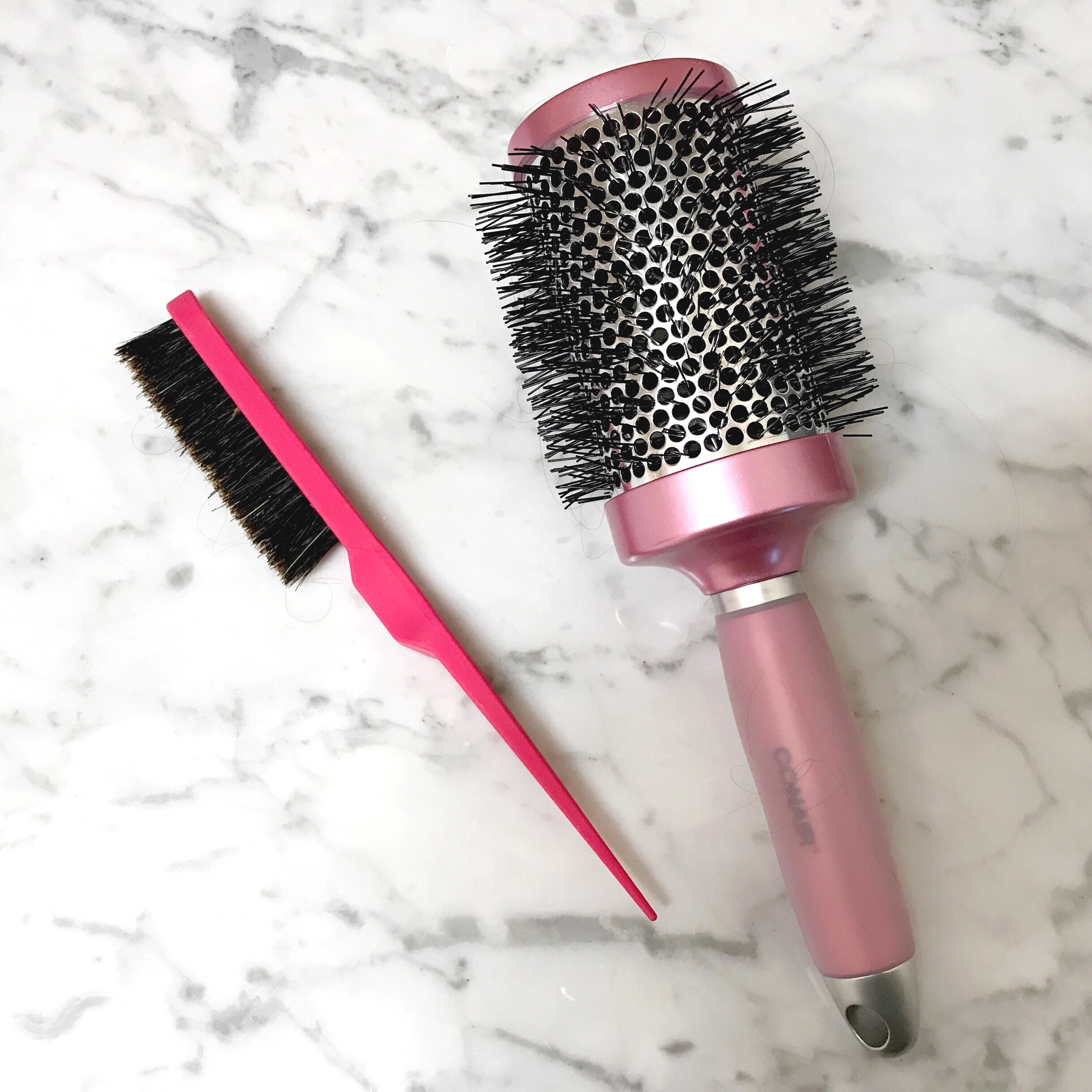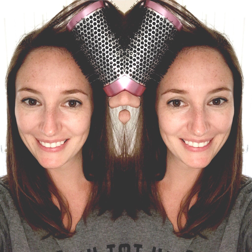If I’m going to blowdry my hair, I’m going to make the most of it and try to style it as best as I can to avoid using a flat iron. Using a large round brush while drying gives a sleek look to the hair while slightly curling the ends. I also use a teasing brush to add volume around the crown.