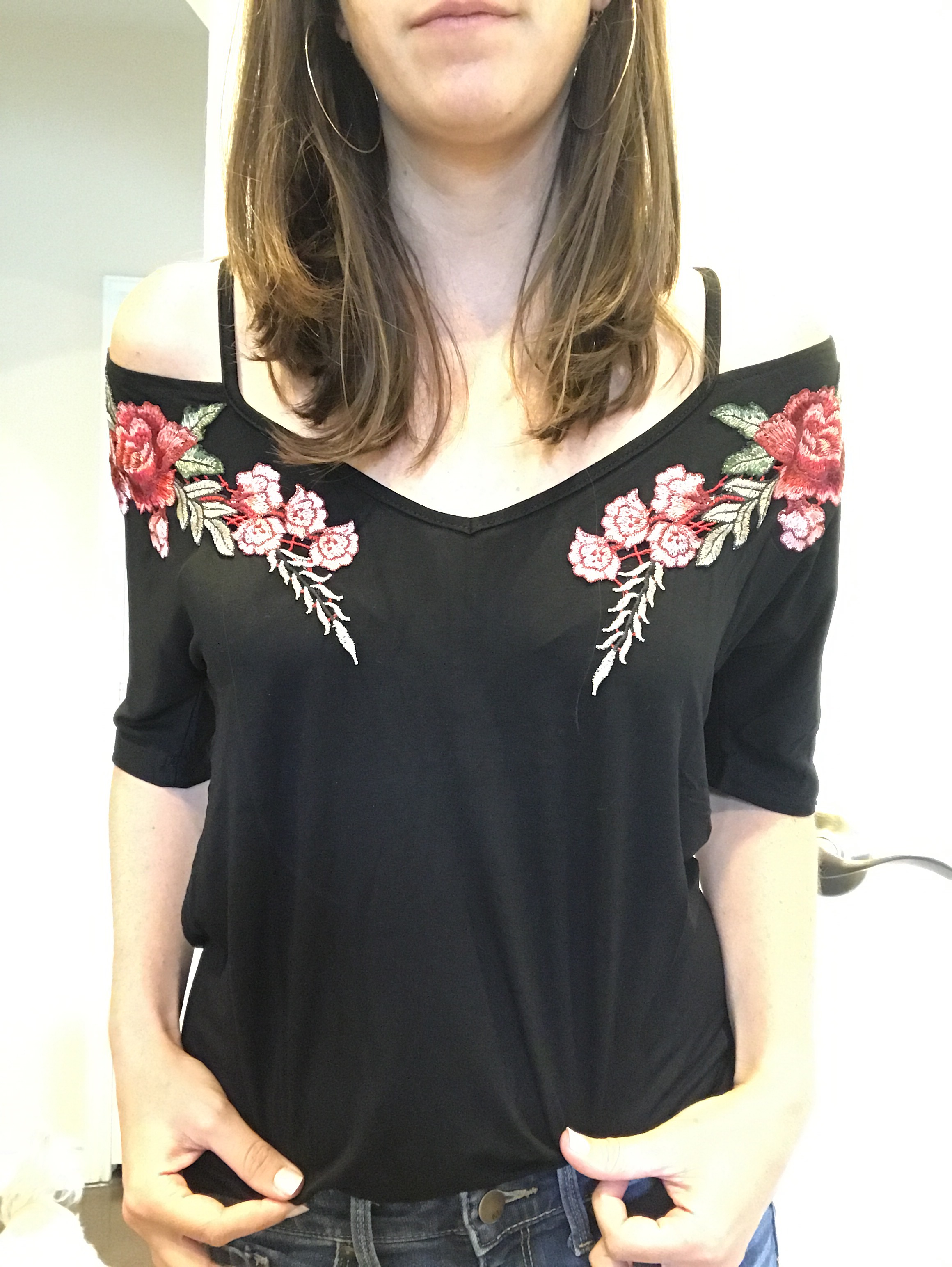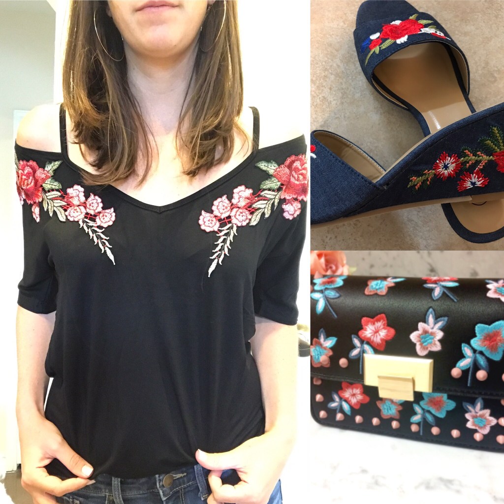 Another top I love is this black cold shoulder tee with embroidered flower patches. This is a little bit more dressy, and I love the placement of the embroidery.