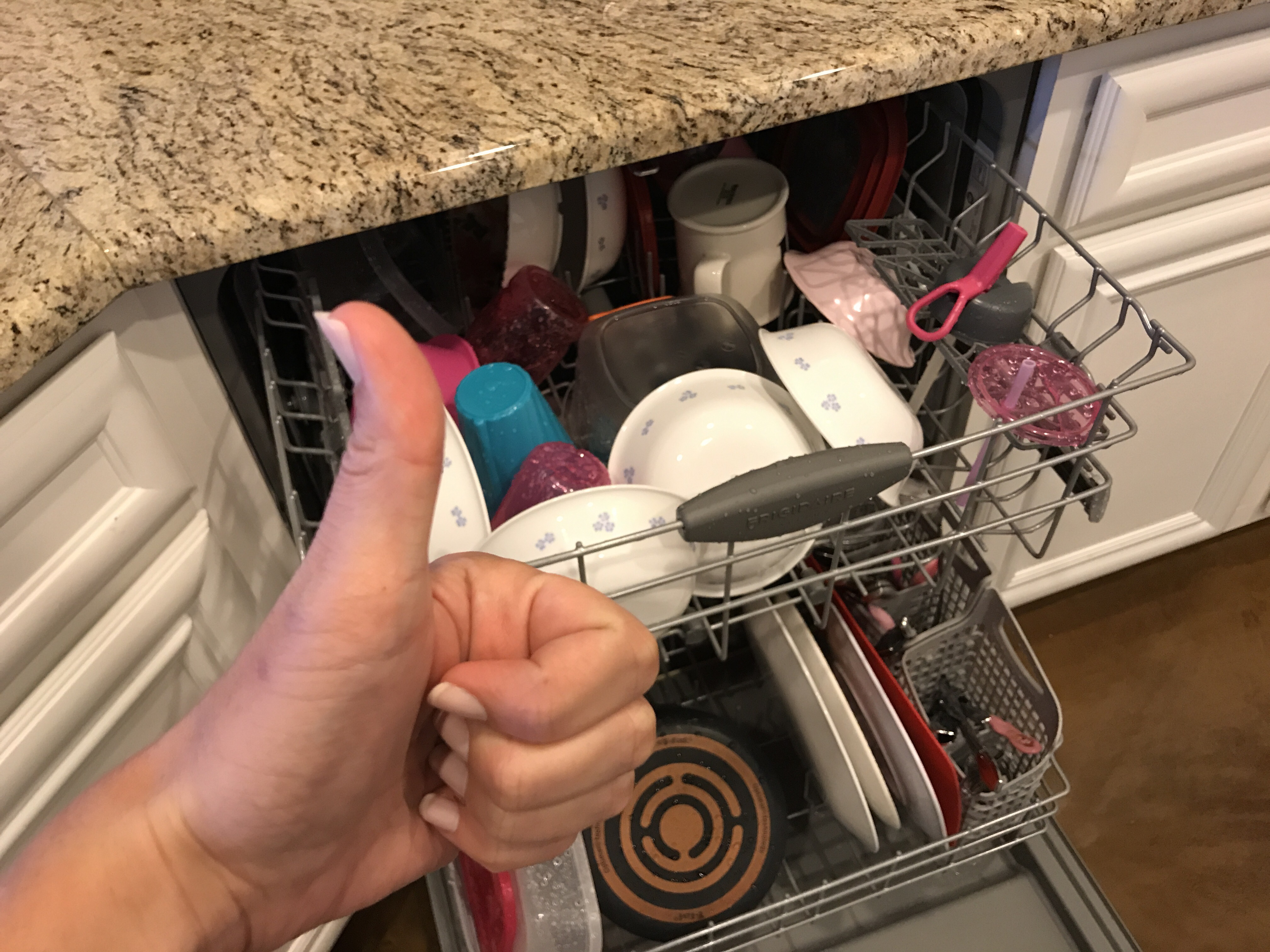 Everyday I do the same chores. I run the dishwasher every night, so I unload the dishwasher every morning. This way, the dishes you use throughout the day can go right into the dishwasher. No dishes in the sink. EVER.