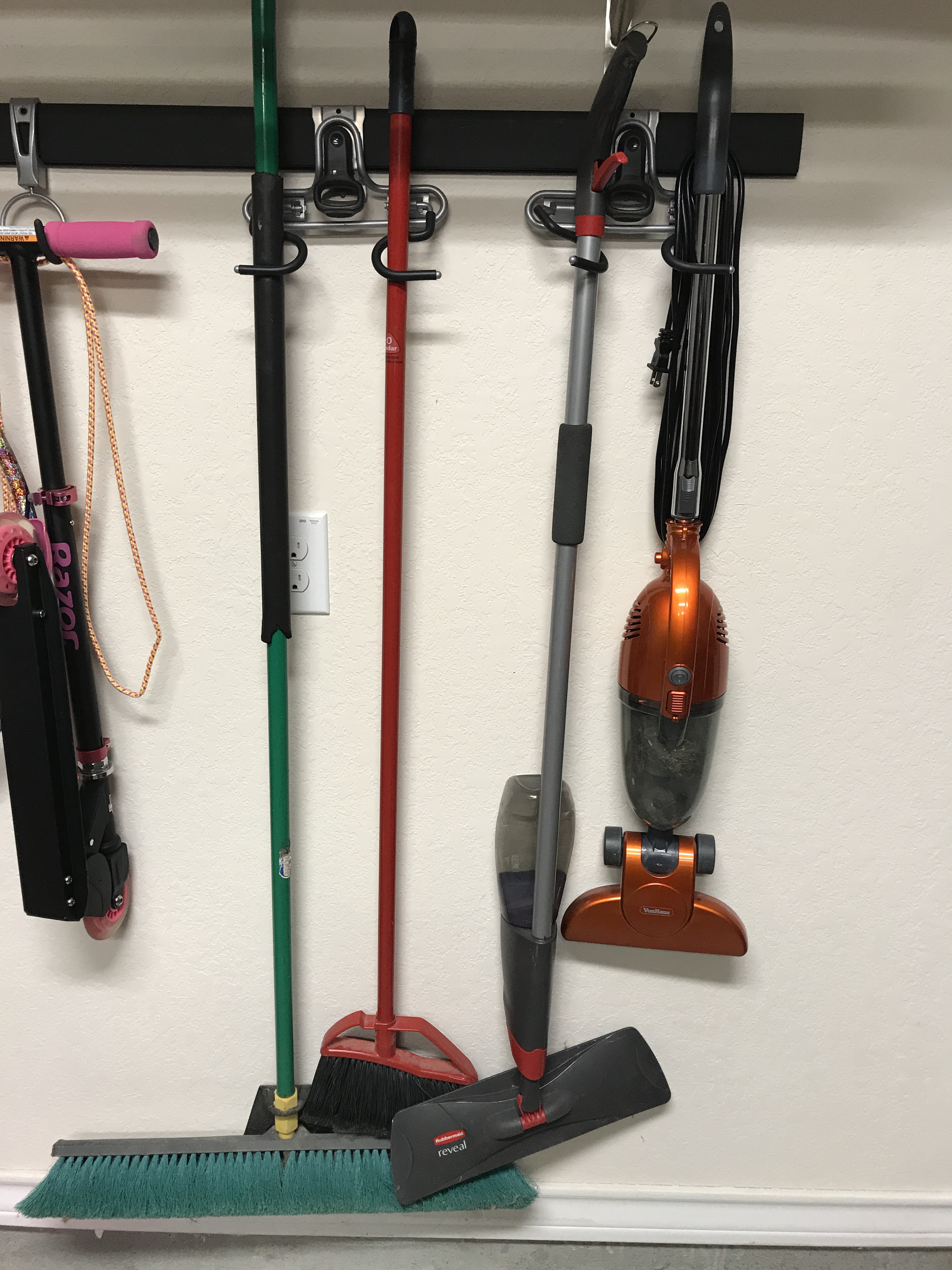 I keep all of my sweepers on this track system in the garage.