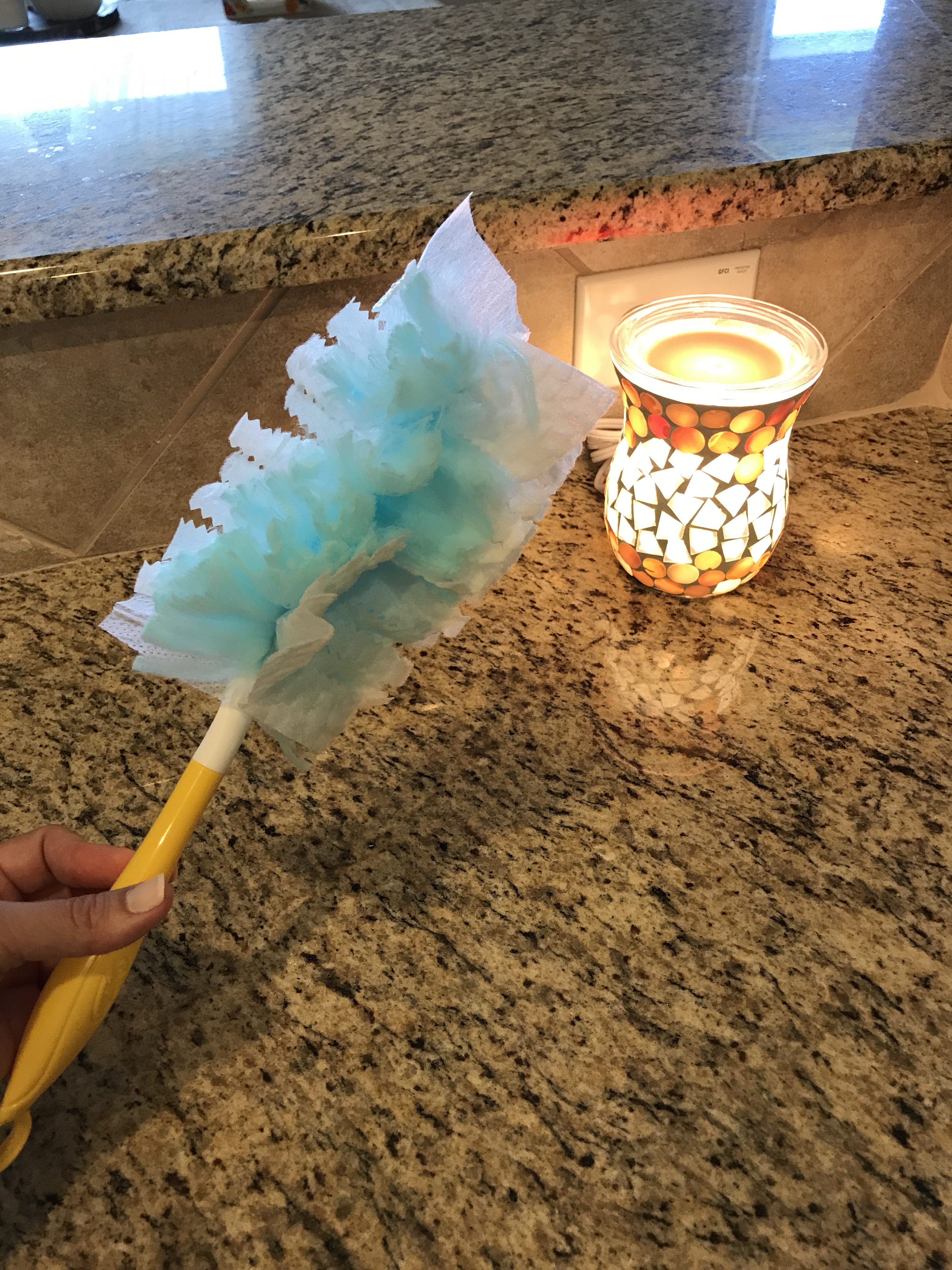 I use the glass cleaner to clean all of the windows in the house, and wipe down with a cloth. I use this little swiffer duster to go around and dust everything in every room. My three year old Ashley loves to help me with this.