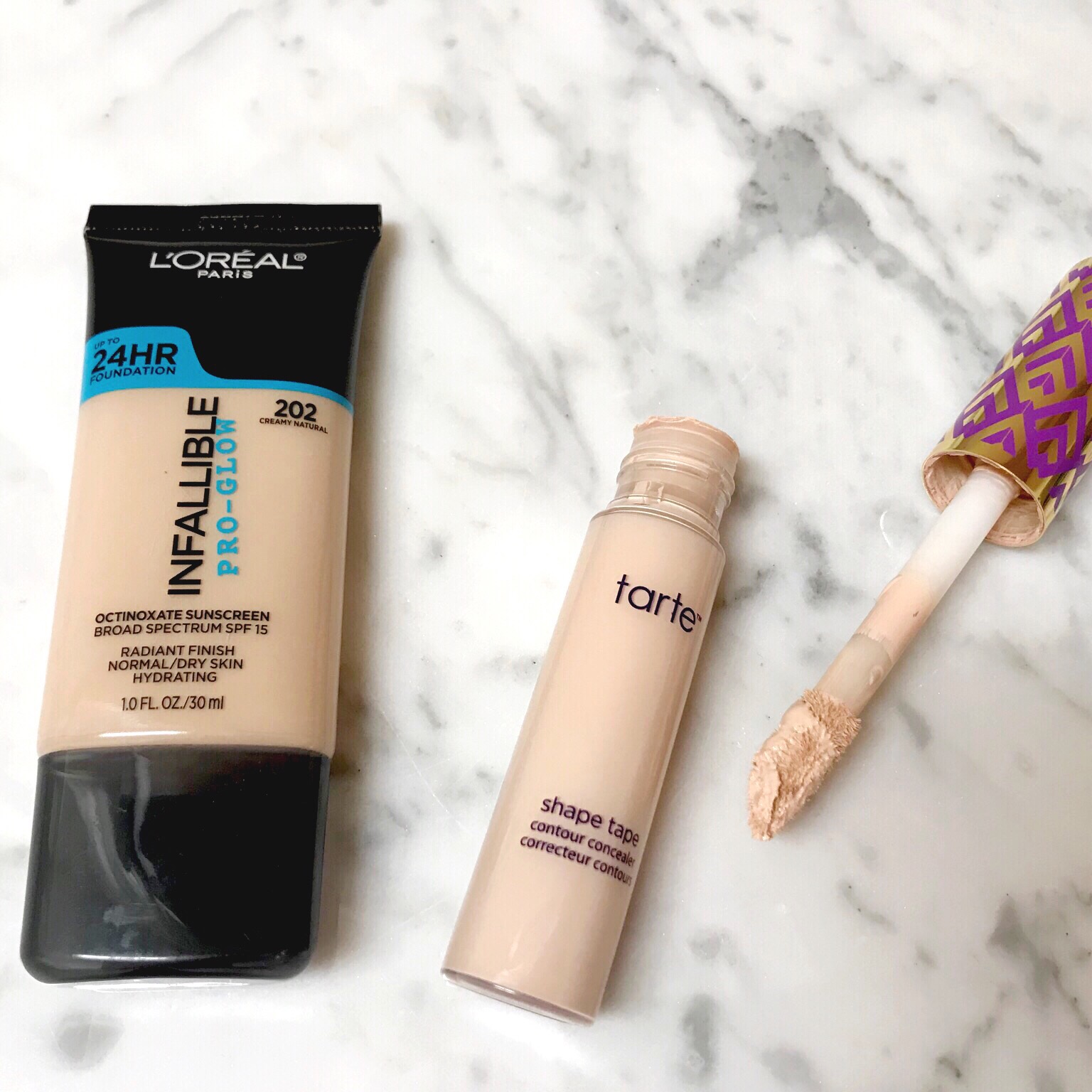 I’m still loving my L’Oréal Infallible Pro- Glow, it gives me a nice medium coverage and a natural dewy finish. It lasts all day and feels weightless in my skin. The other product I’ve been using a lot is this Tarte Shape Tape Concealer. The only place I use concealer is under my eyes, and this is a really good one for dark circles. The key to using this is to use a tiiiiny bit. Like one tiny dot, and then blend it out with a sponge or brush. If you use too much, it will be a cakey mess. It covers my circles nicely and stays all day if I set it.