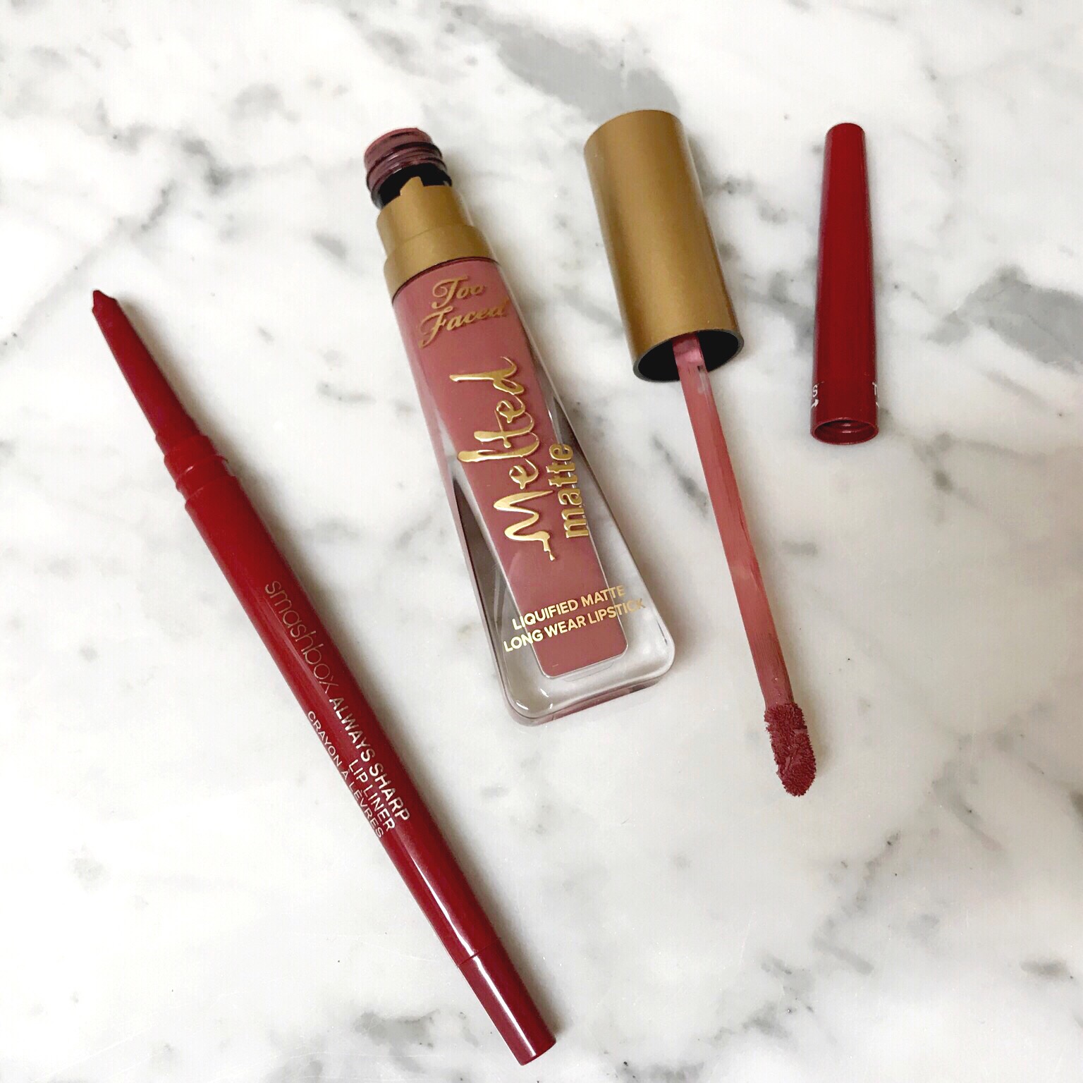 I’ve been using this Smashbox Liner in Figgy, which is a red berry color. I’ve been using this all over the lips for a matte look. I also have been using Too Faced Melted Matte in Queen B. This is a very cool toned pinky gray color that is neutral but still a little bit deeper for fall.