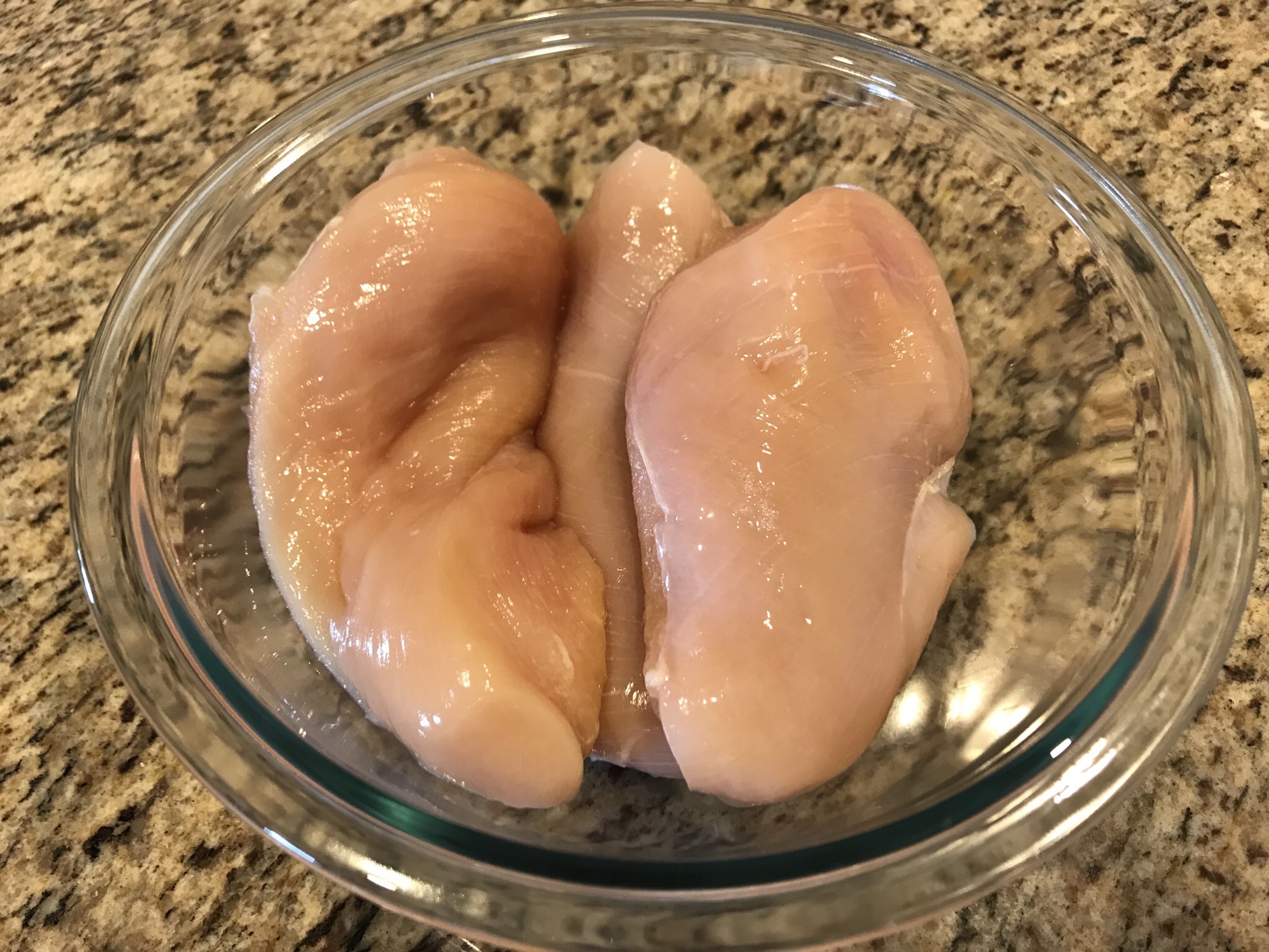 Cut all of the fat off of your chicken breasts and place into a large bowl.