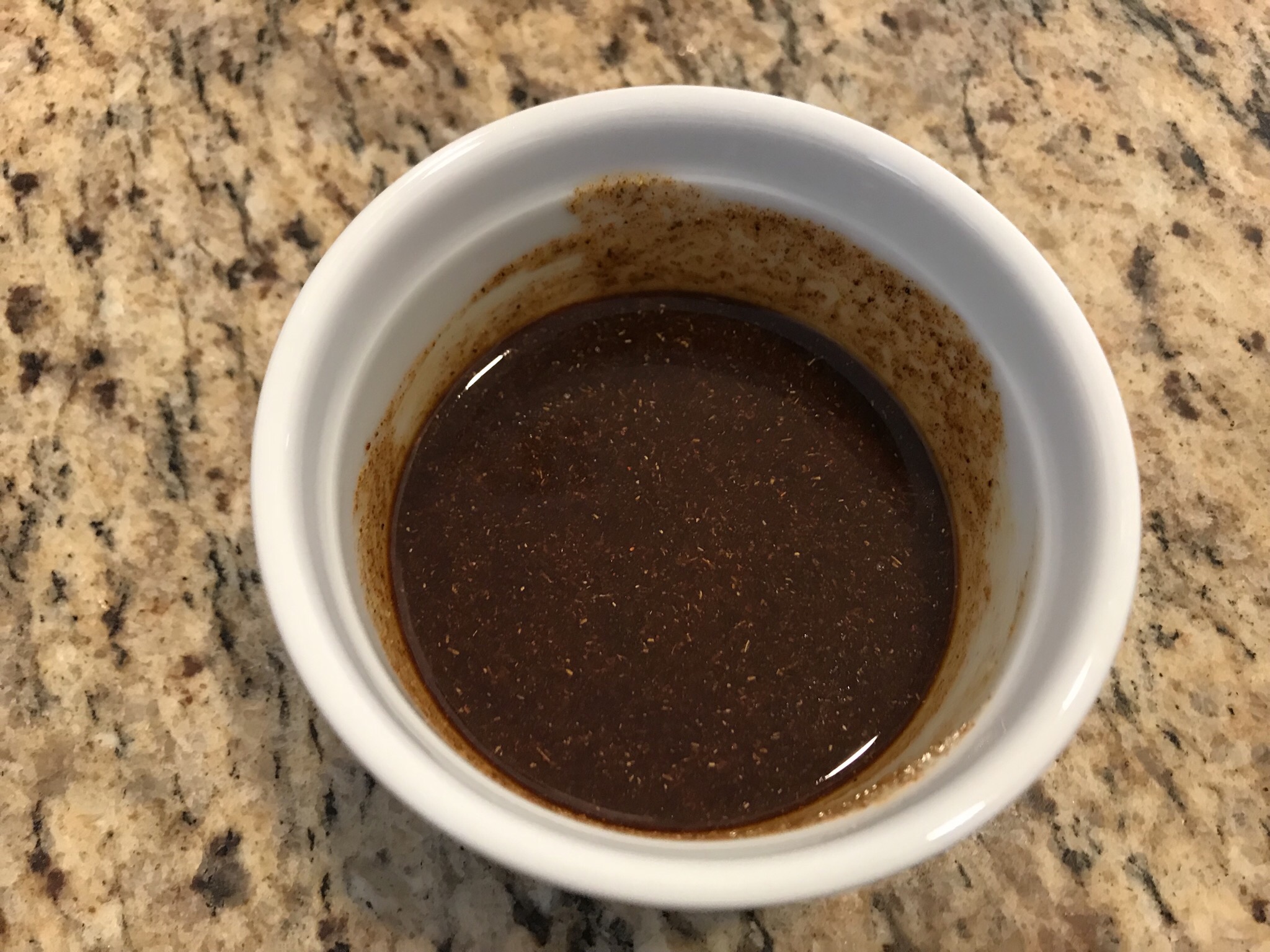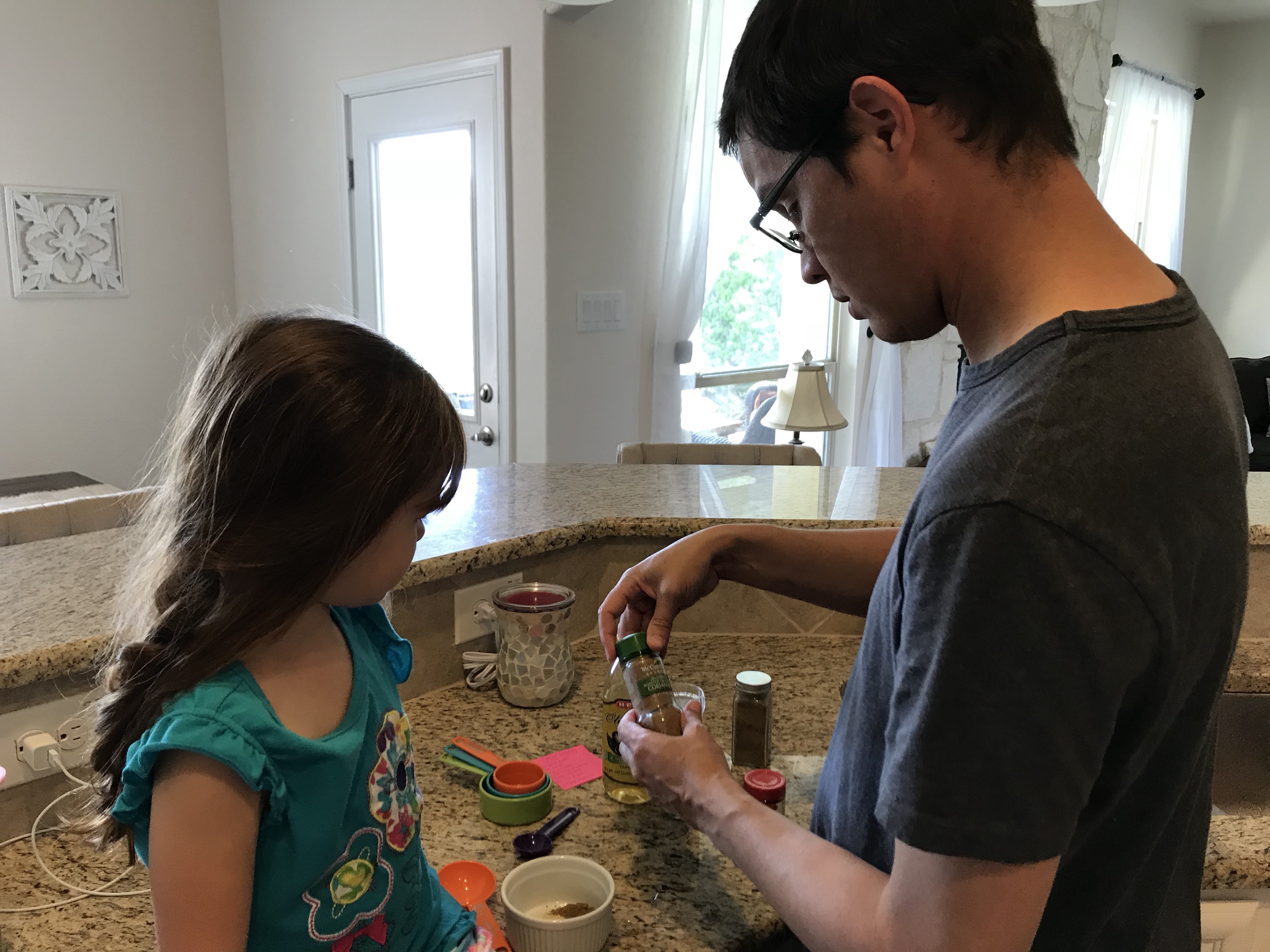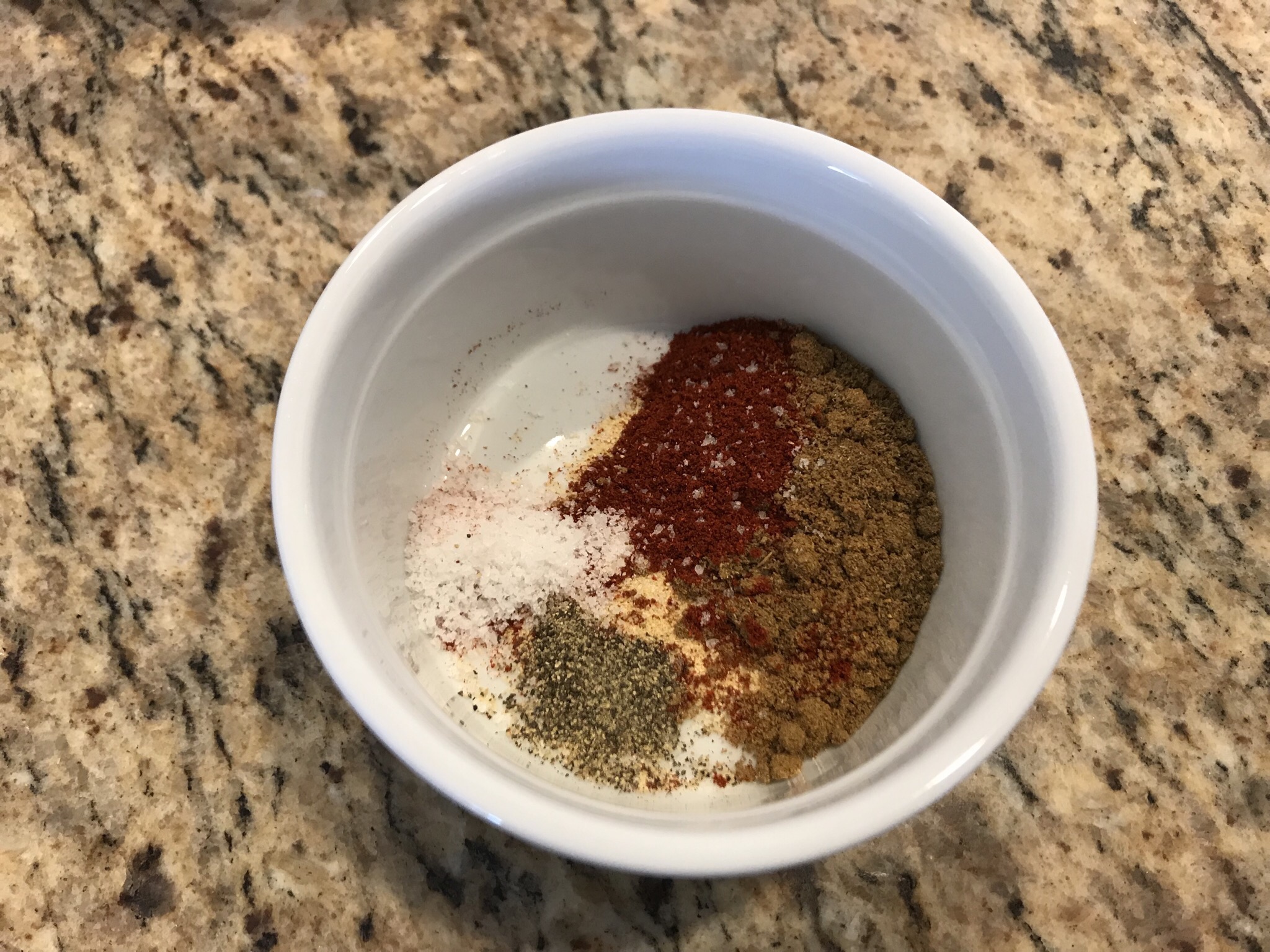 In a small bowl, mix all of your dry seasonings together. He’s got a little helper.