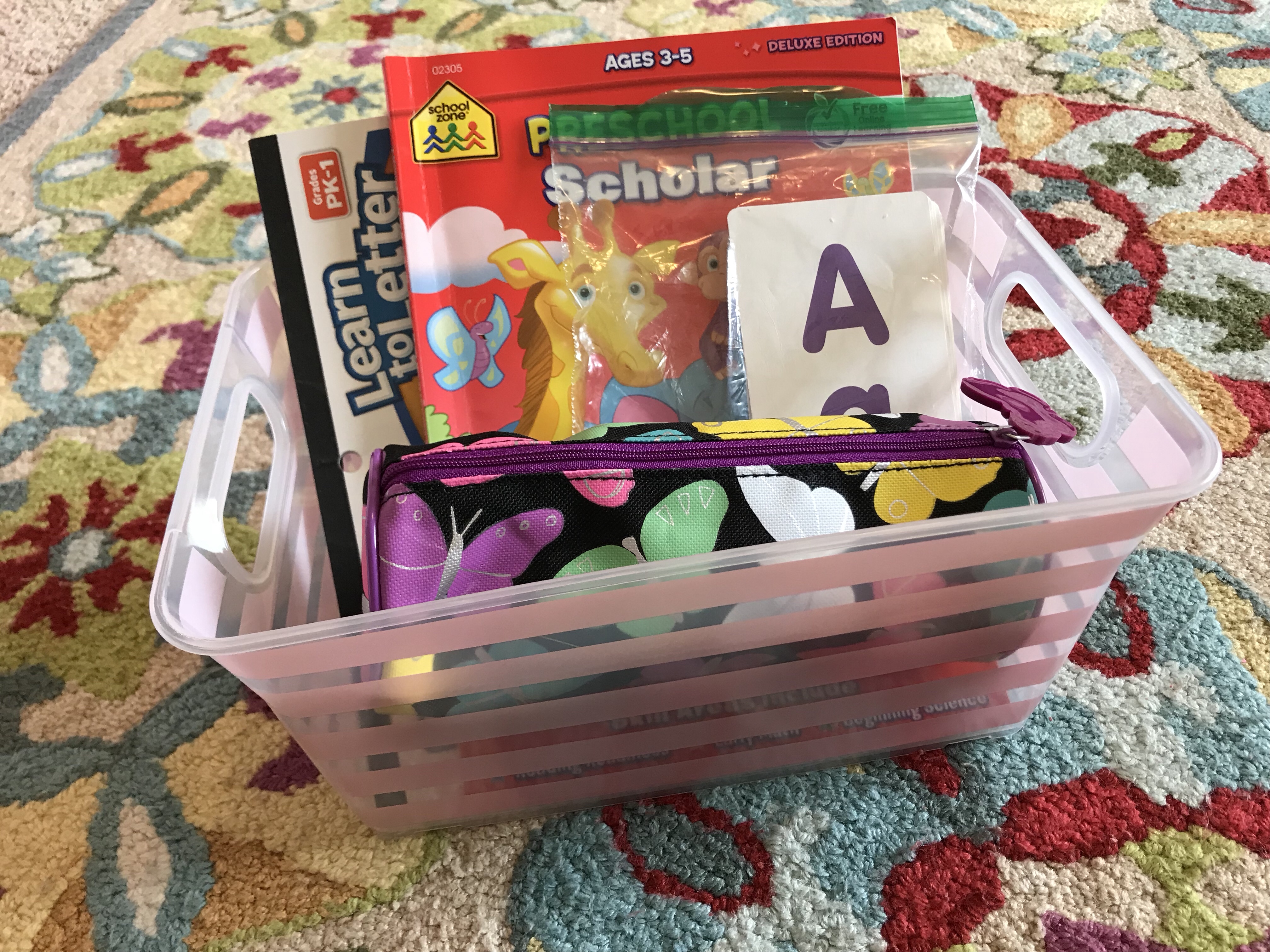 I let Ashley pick out a pencil case, pencils, and crayons as her school supplies, and we keep everything in her school bin.