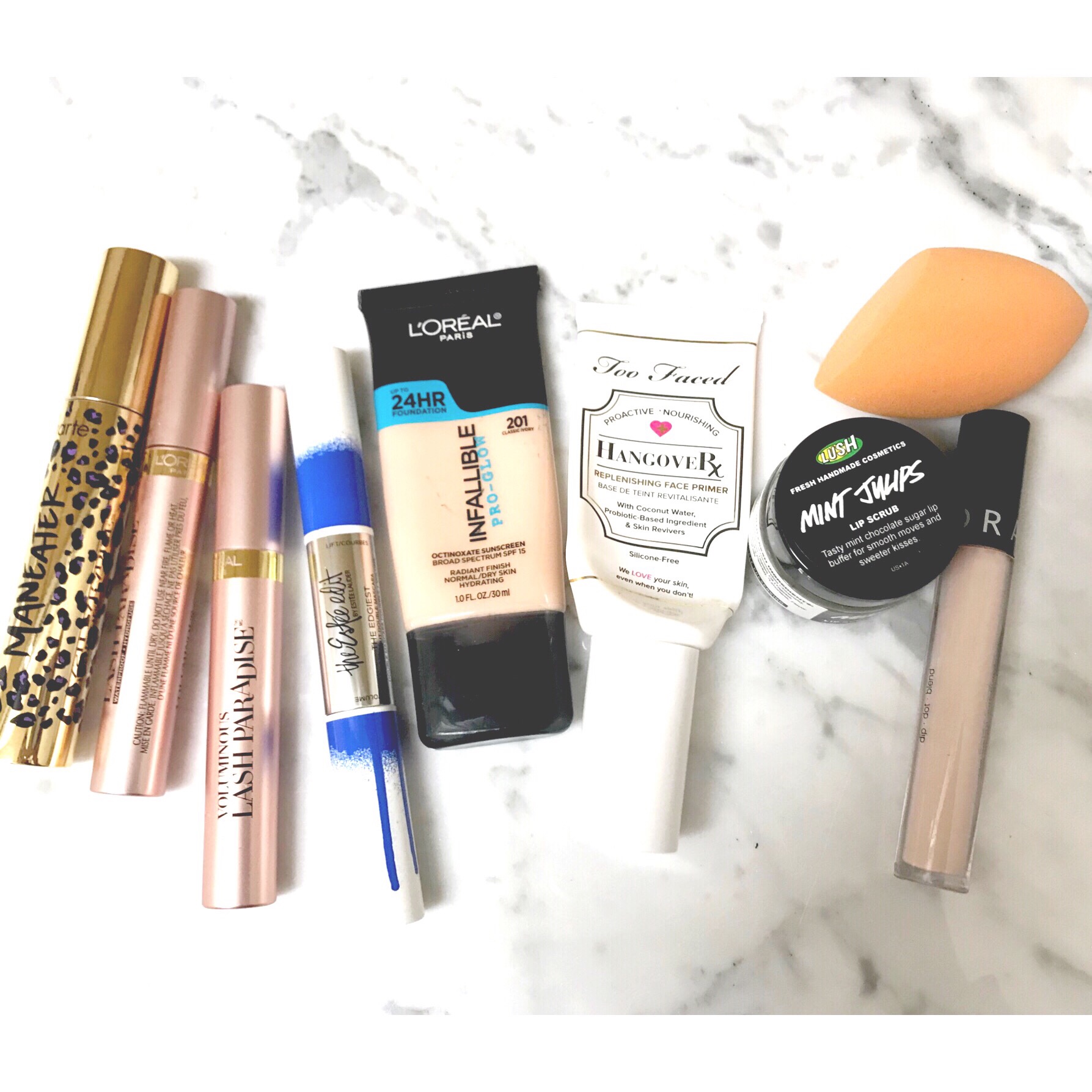 Ok, so I have four mascaras here. The Estee Edit one was a fail. It had a regular wand on one side and a teeny wand on the other. I couldn’t get either one to work for me. Too wet, too clumpy. I didn’t like this at all. Can’t repurchase – this brand has been discontinued. Next was my favorite mascara last year- Tarte Maneater, which is an awesome mascara. Really volumizes the lashes, but has been replaced by L’Oréal Lash Paradise because it is so much cheaper and just as good! Used up two of those and definitely will repurchase.