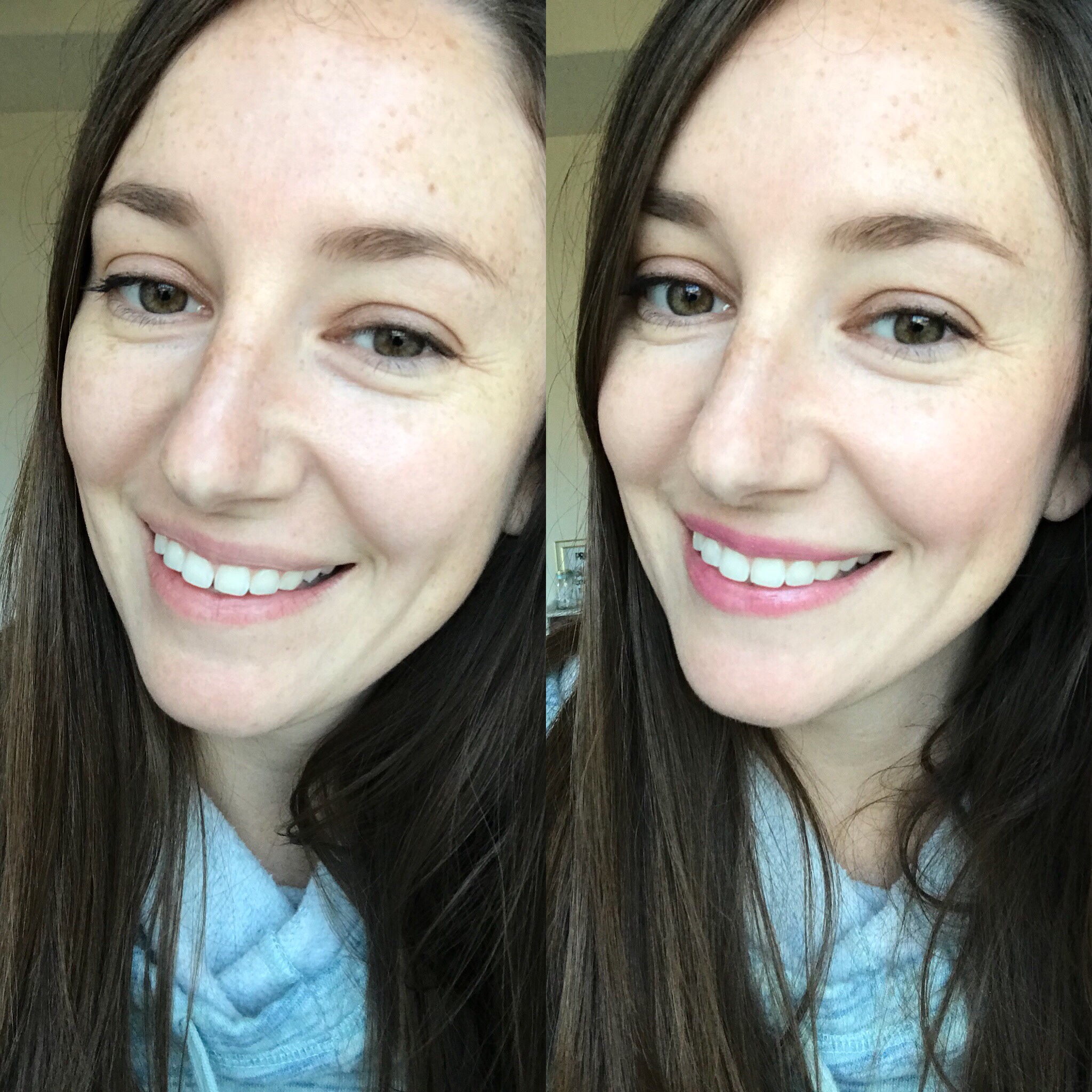 Here’s a before and after. As you can see, my freckles and spots are not covered, but my skin is pretty much evened out. Exactly how I like.