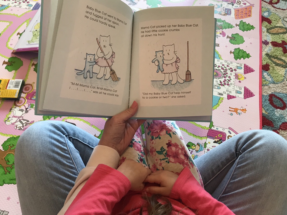 Workbook and story time with Ashley. We love the story “The Baby Blue Cat and the Whole Batch of Cookies”.