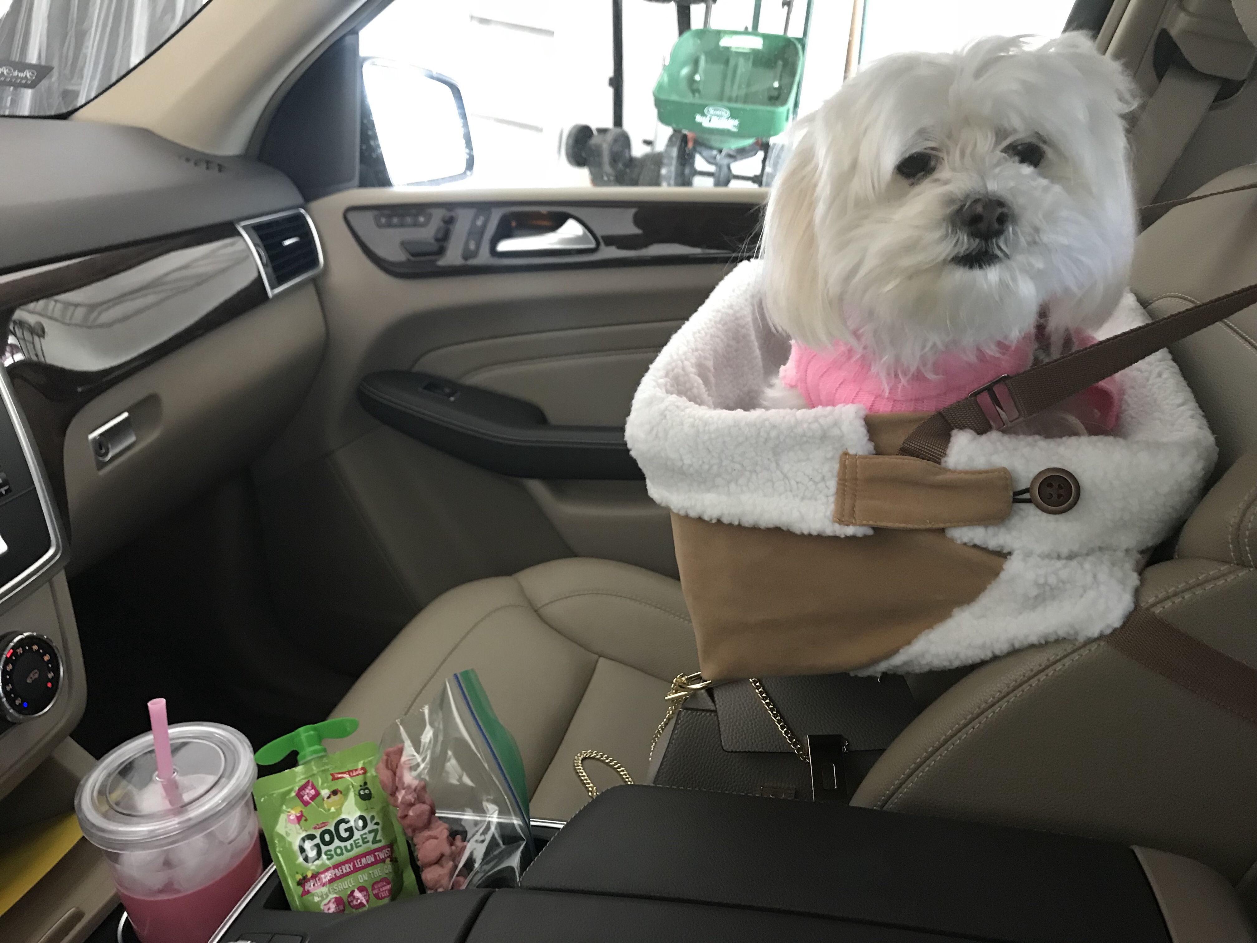 Grab coffee, Mollie, and Allie and head out for school! Mollie loves to ride in her doggie booster!