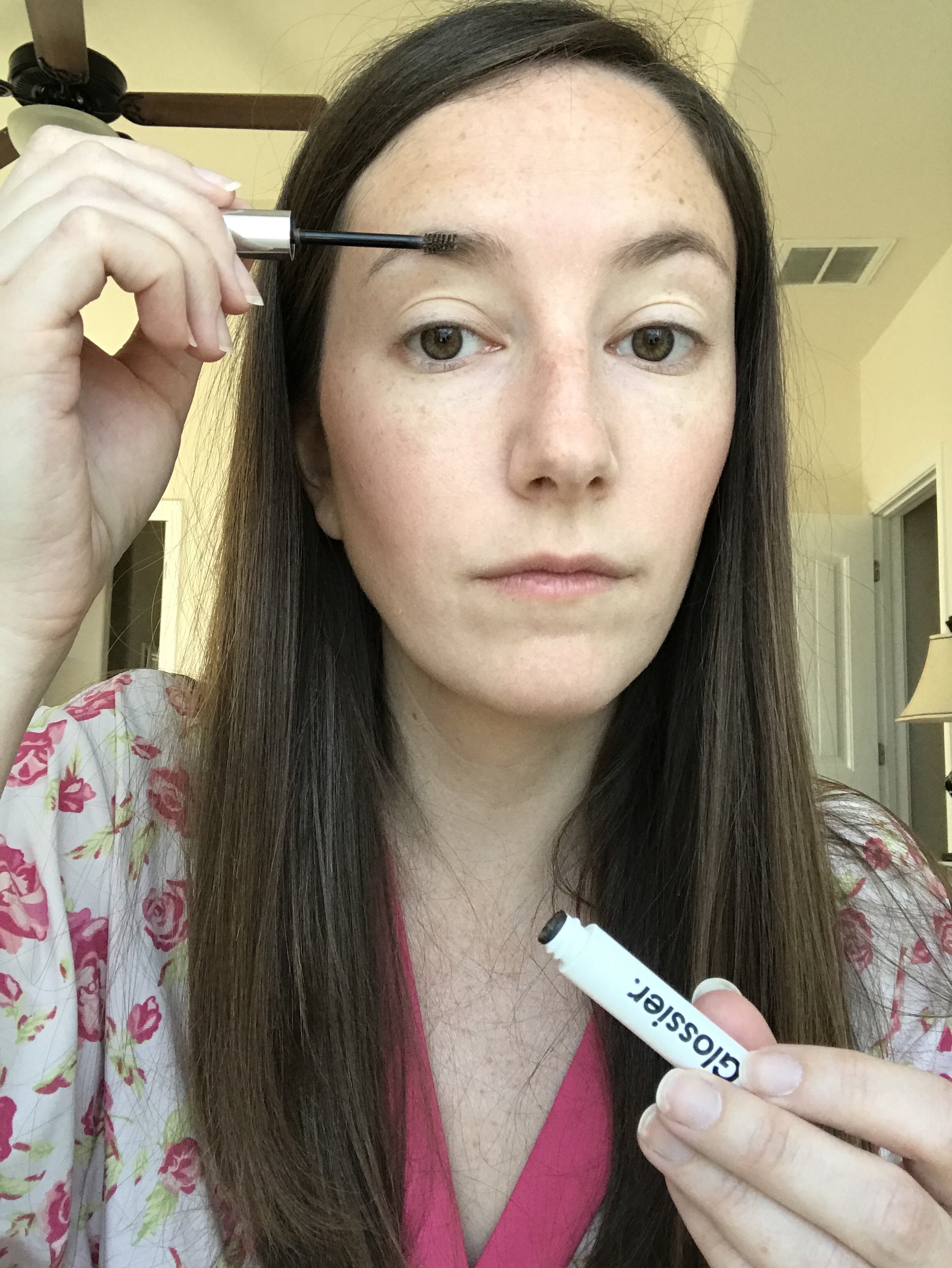 For my brows, I brush in some Glossier Boy Brow, and I’m good to go. It darkens the hairs and fills in any sparse areas.