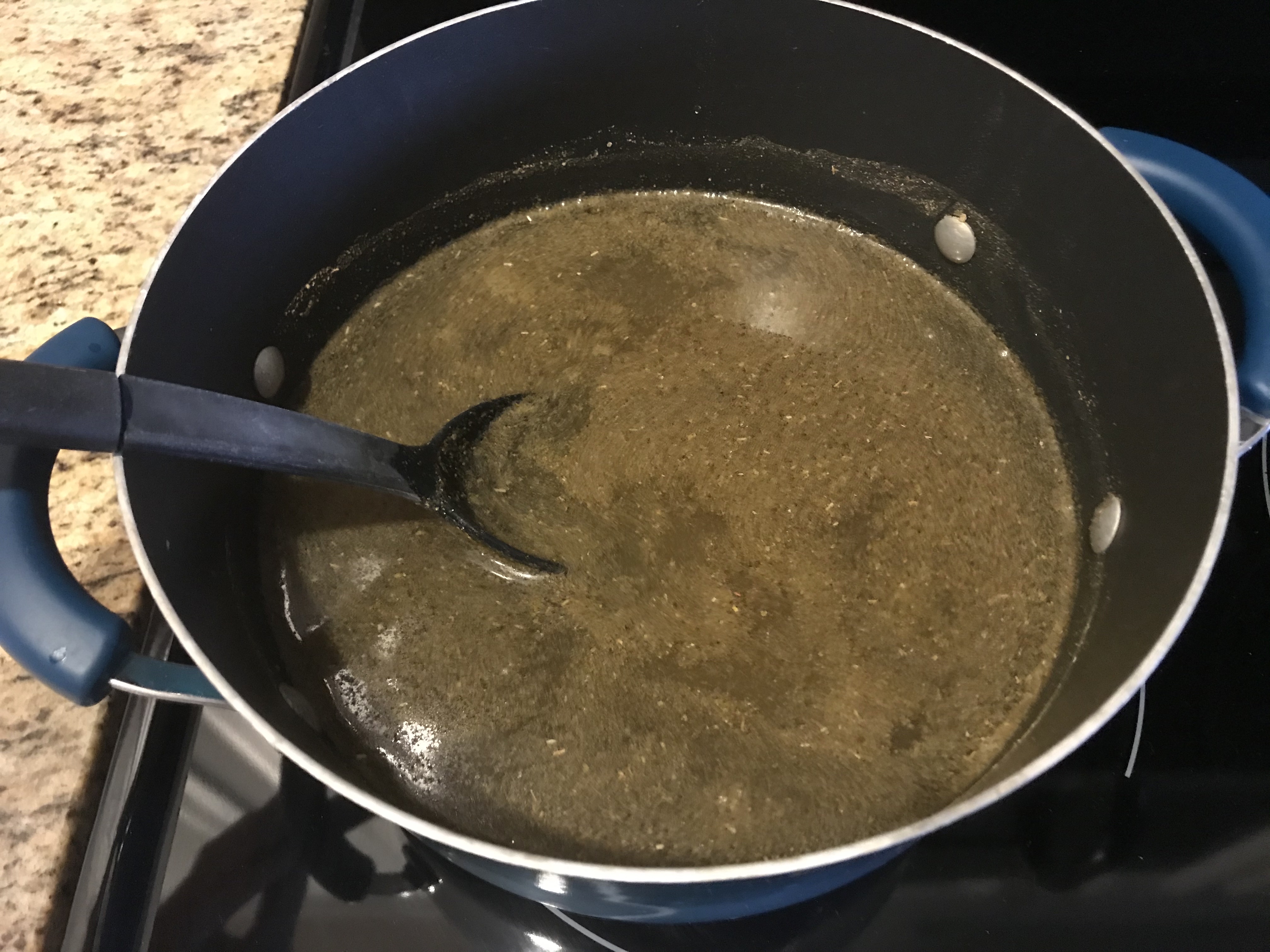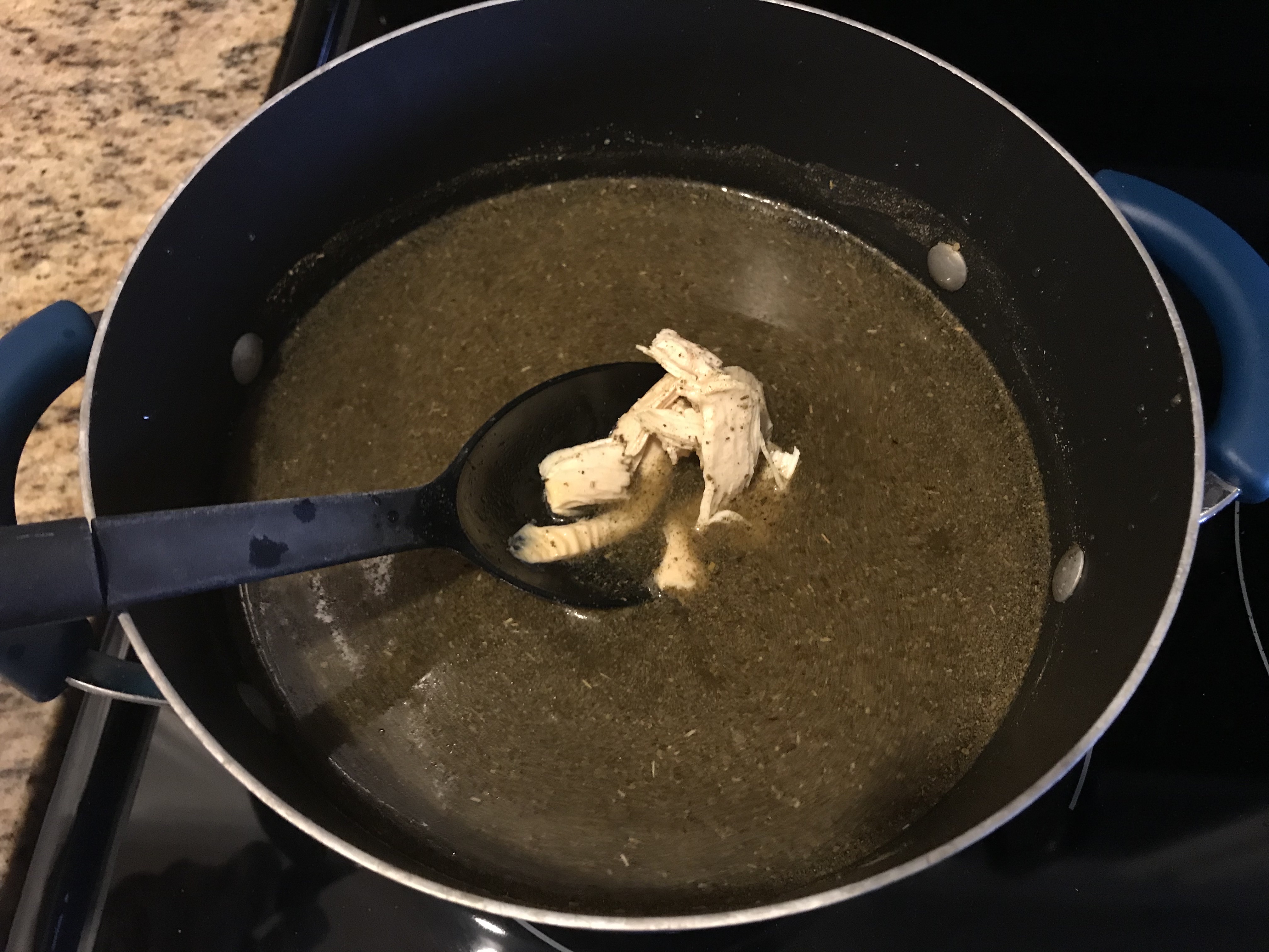 First off, add chicken broth and water to a big stock pot. Add in your seasonings and bring to a boil.
