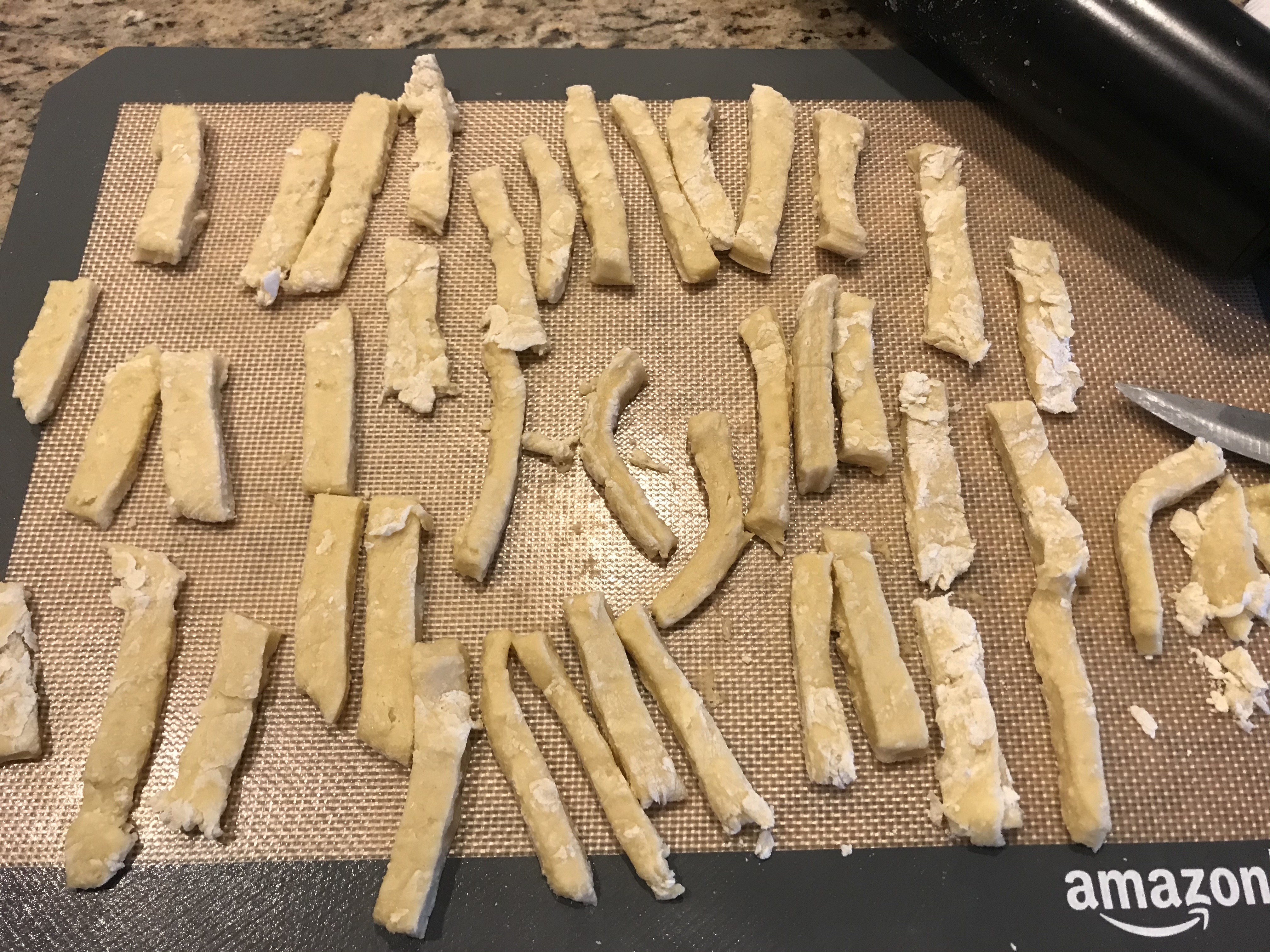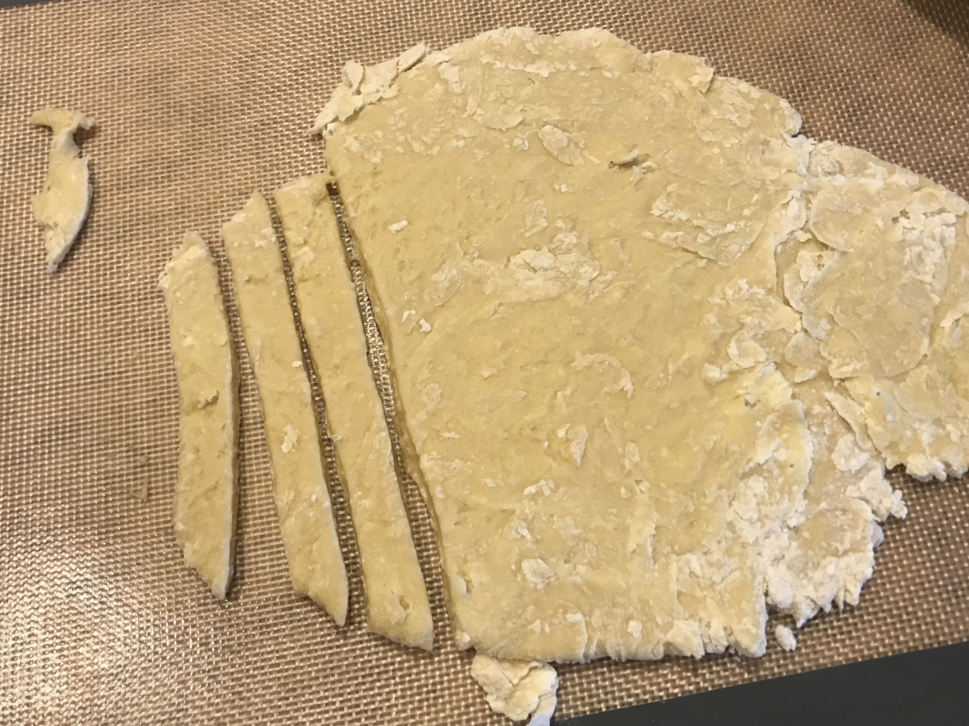 Roll dough out onto a mat at about 1/4 in. thick. Cut into strips.