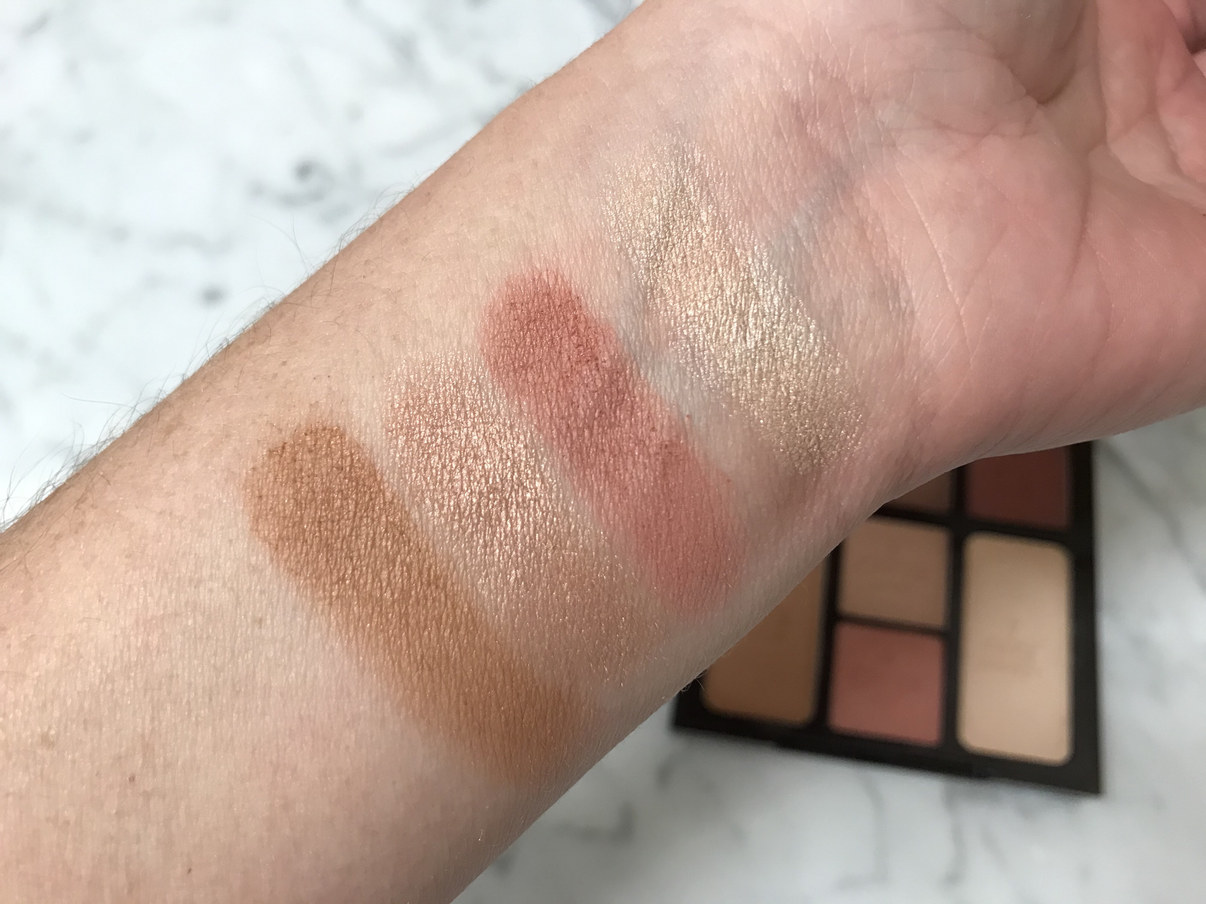 The bronzer is a bit warm toned, and does have some shimmer, but it is not noticeable on the skin. It just makes you look glowy; not sparkly! The top blush color is a very light pink, and very shimmery. This is what I call a blush topper. You can take a matte blush, layer this on top, and the effect is so so pretty.